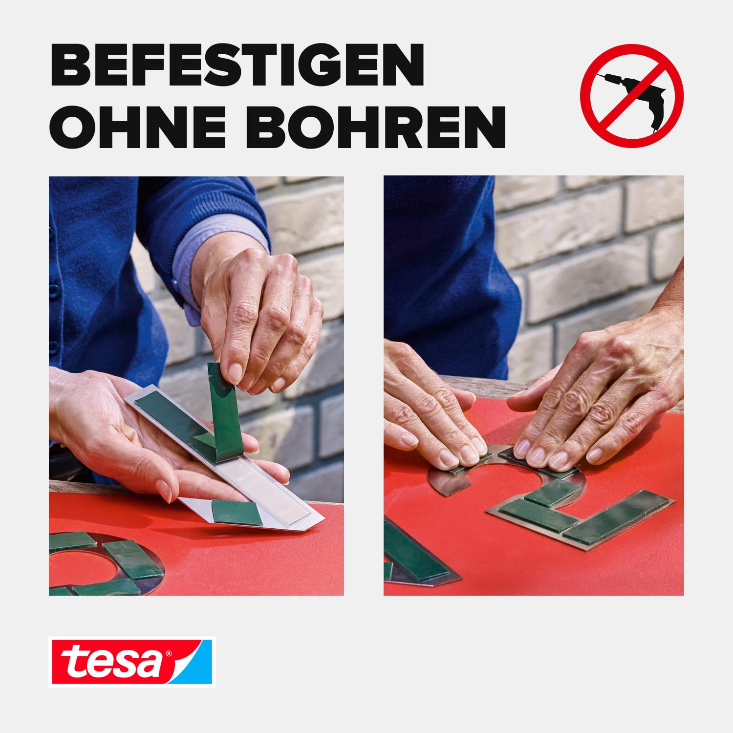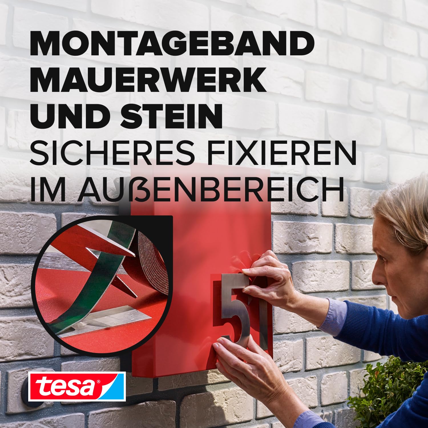 Ein starkes, doppelseitiges Montageband von tesa - ideal für alle, die Objekte im Aussen- oder Innenbereich aufhängen möchten. Dies ist mit dem tesa Powerbond Montageband für Ziegel und Stein mit geringem Aufwand und ohne die Oberfläche zu beschädigen möglich. Denn bei diesen besonderen Materialien ist der Einsatz von Klebebändern normalerweise mühsam. tesa schafft hier Abhilfe: Die enorme Klebekraft des Tapes ermöglicht es, Gegenstände mit einem Gewicht von bis zu 10 kg pro 1-Meter-Streifen bohrfrei zu befestigen.* Das Klebeband ist temperatur- und UV-beständig und eignet sich daher ideal, um Gegenstände wie z. B. ein Hausnummernschild im Aussenbereich sicher zu fixieren. Das permanente Befestigen von Objekten auf empfindlichen Oberflächen war noch nie so einfach. Das Band ist für den Einsatz in Aussen- und Innenbereichen geeignet. Die Länge lässt sich ganz einfach auf das gewünschte Mass zuschneiden. Seine extrem starke Klebekraft in Verbindung mit einer besonders einfachen Anwendung machen dieses doppelseitige Klebeband zur idealen Klebelösung auf Ziegeln und Stein.* Für ein optimales Ergebnis wird ein max. Objekt von 6 kg pro Anwendung empfohlen.tesa - mehr als ein Klebeband