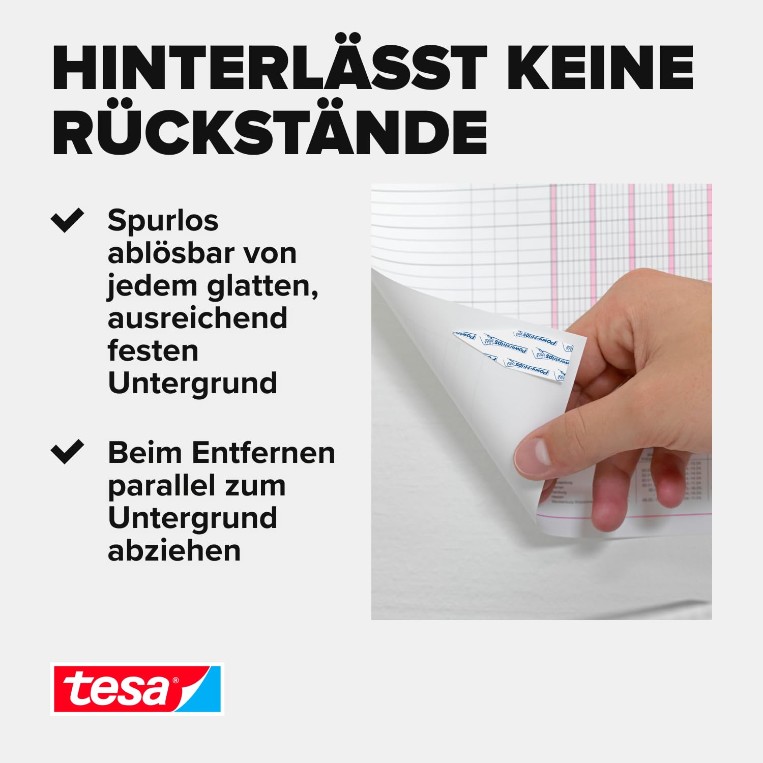 tesa Powerstrips POSTER tesa Powerstrips POSTER - diese smart konzipierten, doppelseitigen Klebestreifen tragen sicher Gegenstände bis zu einem Gewicht von 200 Gramm. Auch sind die Strips wieder leicht ablösbar, sollten sie nicht mehr gebraucht werden. Unschöne Löcher durch Reissnägel oder ähnliche Befestigungsmethoden in der Wand lassen sich damit vermeiden. Mit der Powerstrips-Technologie können Objekte mit einem Gewicht von bis zu 200 Gramm wie beispielsweise Bilderrahmen, Poster und Wanddekorationen sicher montiert werden. Übrigens: Für Tapeten empfehlen wir unsere tesa Klebestreifen für Tapete & Putz. tesa Powerstrips - eine neue Generation der Befestigung Die Klebekraft der tesa Powerstrips bietet schnelle und einfache Befestigungen für Ihr Zuhause - ganz ohne Bohren oder Beschädigung der Oberflächen Empfehlung: Für alle, die unschöne Löcher und Schäden an der Wand vermeiden wollen Das Wichtigste auf einen Blick: ✔ Selbstklebend und ohne Werkzeug anzubringen ✔ 1 Strip hält bis zu 200 g ✔ Spurlos wieder ablösbar ✔ Zugespitzte Form für leichte und empfindliche Materialien ✔ Uuffällig und schonend - auch auf sensiblen Untergründen wie beispielsweise Lackflächen Angaben zum Produkt: Lieferumfang: 1 x tesa Powerstrips POSTER, 96 Stück Traglast: 200 g pro Streifen tesa - mehr als ein Klebeband tesa gehört zu den weltweit führenden Herstellern von Klebebändern und Klebesystemlösungen und steht für qualitativ hochwertige Produkte. Seit über 125 Jahren entwickelt das deutsche Unternehmen Lösungen für vielfältige Anwendungen für Büro, Haus und Garten aber auch für die Automobil- und Elektronikindustrie. Privaten Haushalten bietet tesa mehrere hundert Lösungen im Umfeld Befestigen, Montieren, Verpacken, Renovieren, Reparieren, Isolieren oder beim Schutz vor Insekten, Staub und Zugluft.