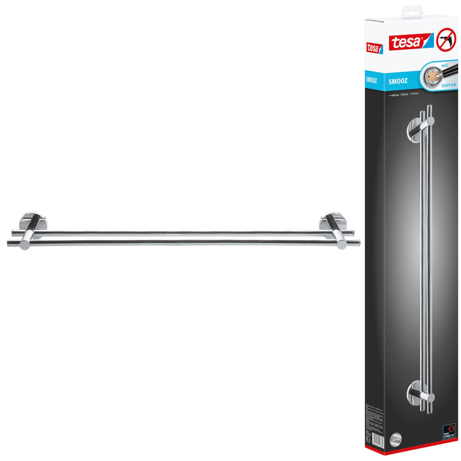 tesa SMOOZ Doppel-Handtuchstange, verchromt - Badetuchhalter mit 2 Stangen - zur Wandbefestigung ohne Bohren, inkl. Klebelösung - 640mm x 50mm x 115mm