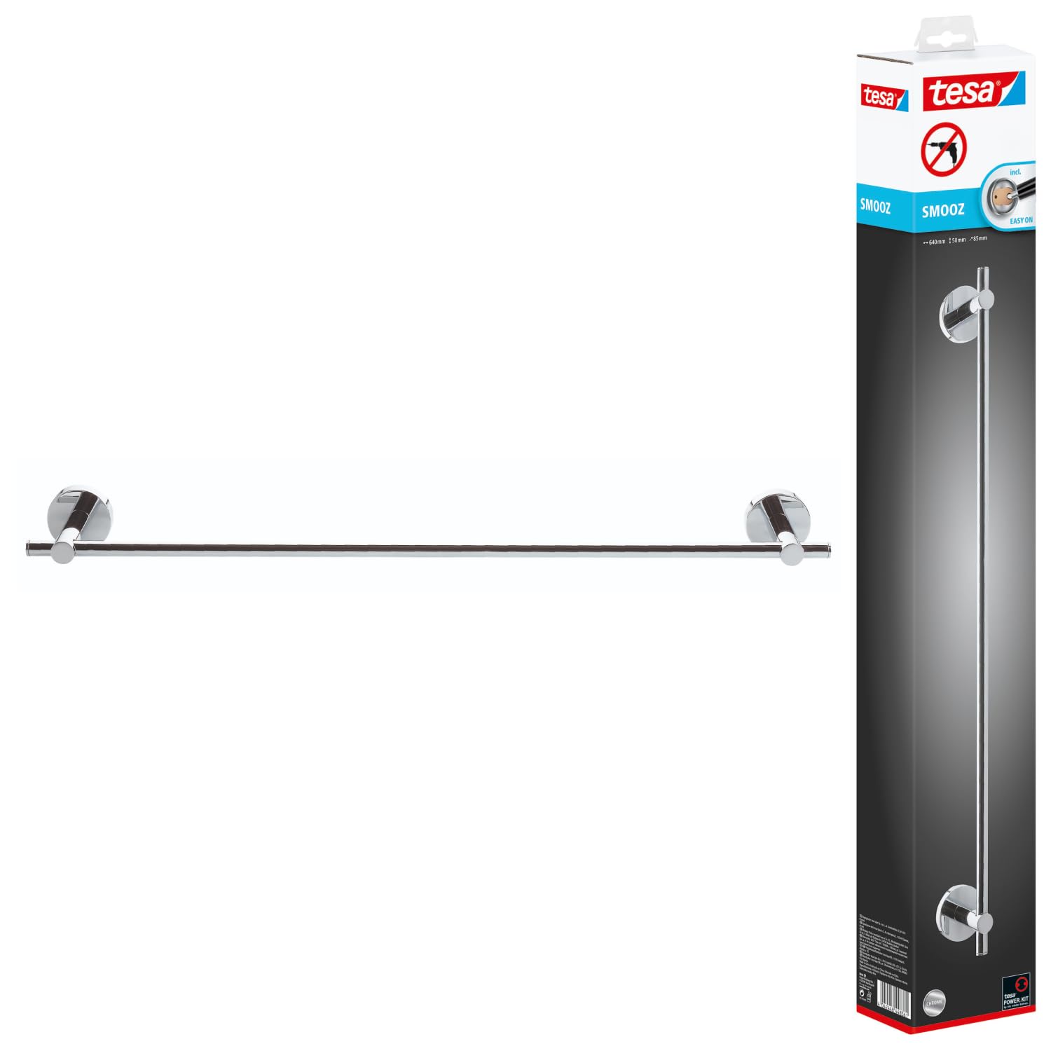 tesa SMOOZ Handtuchstange, verchromt - Badetuchhalter - zur Wandbefestigung ohne Bohren, inkl. Klebelösung - 640mm x 50mm x 85mm