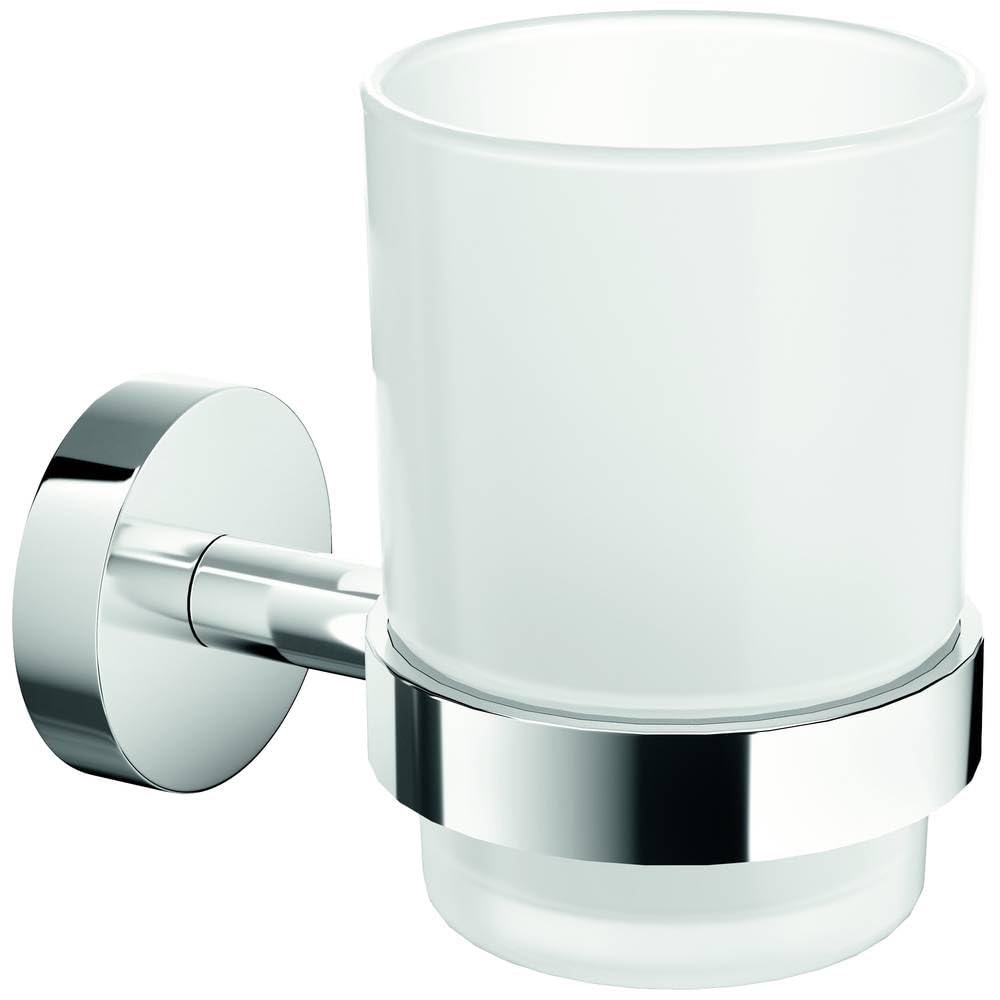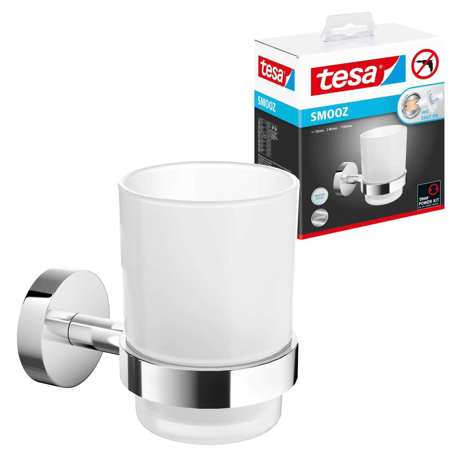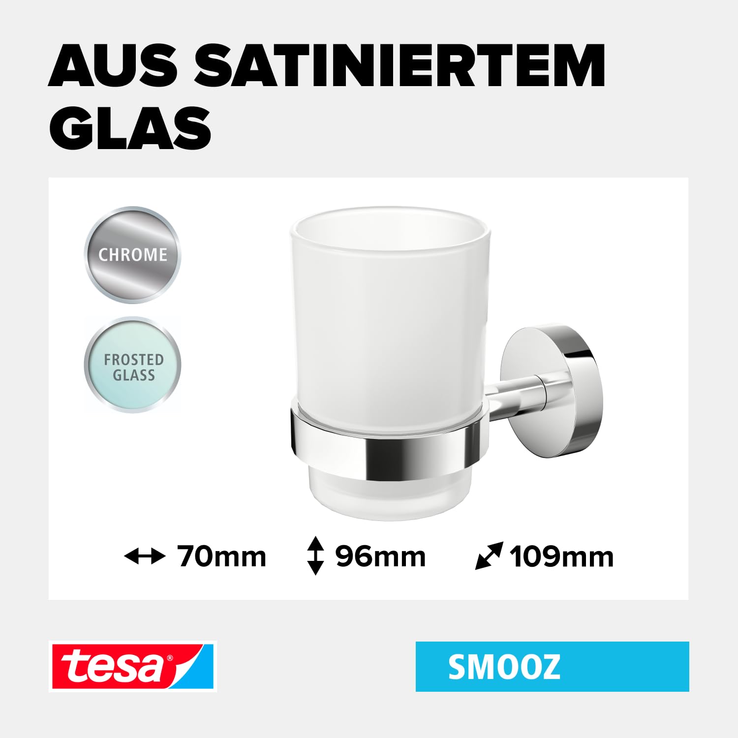 tesa SMOOZ Zahnputzbecher mit Halterung - Becher aus satiniertem Glas, verchromte Wandhalterung - zur Wandbefestigung ohne Bohren, inkl. Klebelösung - 113 mm x 79 mm x 124 mm