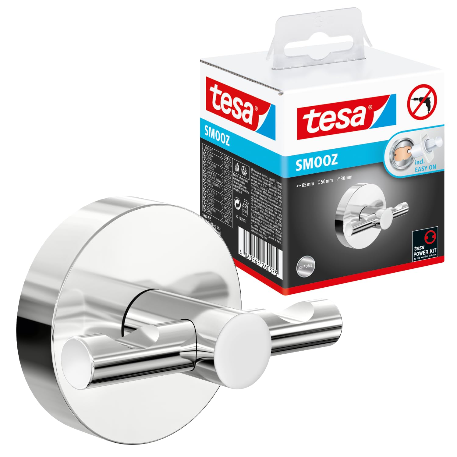 tesa SMOOZ Handtuchhaken, verchromter Edelstahl - Bad-Haken zur Wandbefestigung ohne Bohren, inkl. Klebelösung - 63 mm x 50 mm x 50 mm
