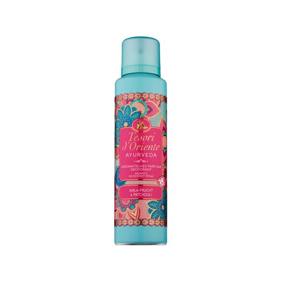 Ayurveda-inspiriertes Parfum Deo mit pflegenden Extrakten: Tesori d'Oriente Ayurveda kombiniert Amla-Fruchtextrakt und Sesam-Oel mit Aloe Vera und Calendula und macht die taegliche Anwendung zu einem aromatischen Wellness-Ritual. Ethaerischer, umhuellender Duft mit holzigen und frischen Noten: Suesser Orange und Zitrone treffen auf Patchouli und Zedernholz und ergeben eine harmonische Duftkomposition mit warmer Tiefe. Bis zu 24 Stunden Schutz ohne sichtbare Flecken: Das Deo Spray sorgt fuer erfrischende Frische im Alltag und unterwegs und ist darauf ausgelegt, keine sichtbaren Rueckstaende auf Kleidung zu hinterlassen (Herstellerangabe). Handliches 150-ml-Format: Passt in Sport- oder Handtasche und eignet sich mit der edlen Optik auch als Geschenkidee.