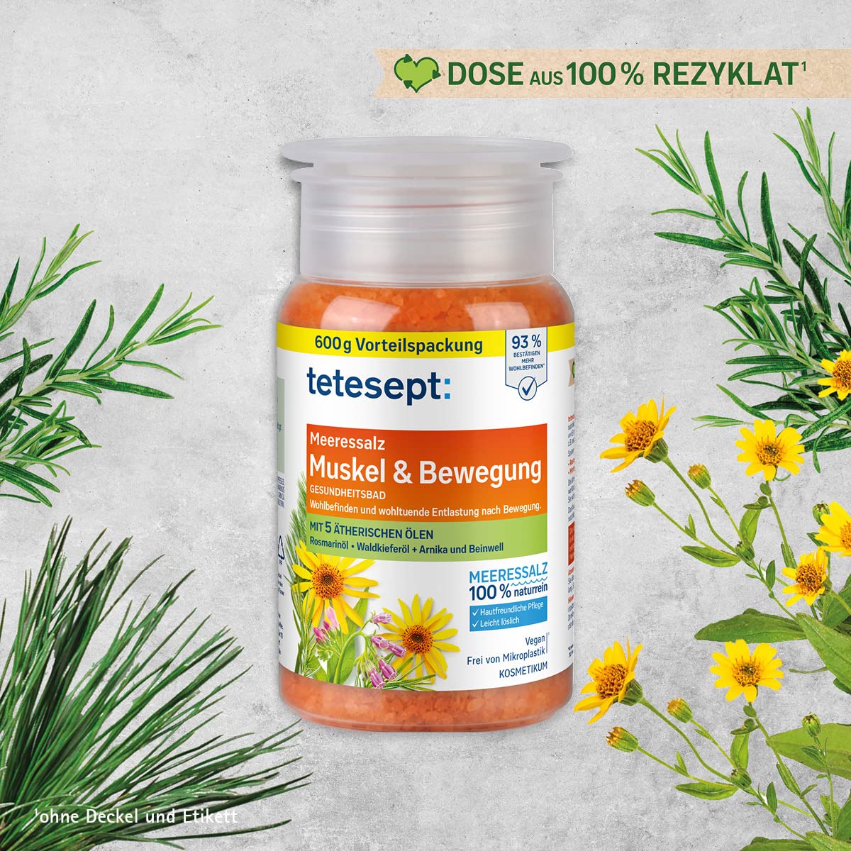 tetesept Meeressalz Muskel & Bewegung (600 g)Wohltuender kosmetischer Badezusatz mit naturreinem Meeressalz und natürlichen ätherischen Ölen zur Entspannung im warmen Bad. Die spezielle Kombination aus 5 ätherischen Ölen sorgt für einen wohltuenden Duft-Effekt. Die ätherische Ölmischung aus Rosmarinöl, Eukalyptusöl, Waldkieferöl, Orangenöl und Myrtenöl wird kombiniert mit Arnika- und Beinwell-Extrakt und entfaltet ihre positiven Eigenschaften ideal im warmen Badewasser. Dank des natürlichen Meeressalzes wird die Haut beim Baden auf natürliche Weise gepflegt.Produktinformationen5 ätherische Öle100 % naturreines Meeressalz93 % bestätigen mehr Wohlbefinden*Hautfreundliche PflegeLeicht löslichFür Haut und Umwelt:Hautverträglichkeit dermatologisch bestätigtRezeptur frei von MikroplastikHergestellt in DeutschlandVegan: frei von tierischen InhaltsstoffenDose aus 100% Rezyklat (ohne Deckel und Etikett)Anwendung: Befüllen Sie 3⁄4 des Deckels mit tetesept Meeressalz und geben Sie dies in das Badewasser. Bei 35–38 °C geniessen Sie Ihr Bad 10–20 Minuten lang. Spülen Sie die Badewanne nach der Anwendung mit heissem Wasser aus.Hinweise: Erwachsenenbad. Für Kinder unzugänglich aufbewahren. Nur auf intakter Haut anwenden. Nicht während Schwangerschaft und Stillzeit anwenden. Direkten Kontakt des Badesalzes mit empfindlichen Oberflächen und Gegenständen vermeiden.*Anwendungsbeobachtung an einem unabhängigen Testinstitut mit 30 Probanden inkl. subjektivem Fragebogen, Zustimmungsquote in %**Dose aus 100% Rezyklat (ohne Deckel und Etikett)Über teteseptDie Marke tetesept zeichnet sich seit über 50 Jahren durch die wirksame Verbindung traditioneller Heilkunde mit modernen medizinisch-wissenschaftlichen Erkenntnissen aus. Innovative Rezepturen und eine eigene Abteilung für Forschung und Entwicklung sind die Basis für eine grosse Auswahl an Pflege- und Gesundheitsprodukten. Dazu gehören Badezusätze, Dusch- und Fusspflegeprodukte sowie Erkältungspräparate, Vitamine & Mineralstoffe und Selbstmedikationsprodukte. tetesept: für das ganzheitliche Wohlbefinden und die tägliche aktive Gesundheitsvorsorge.