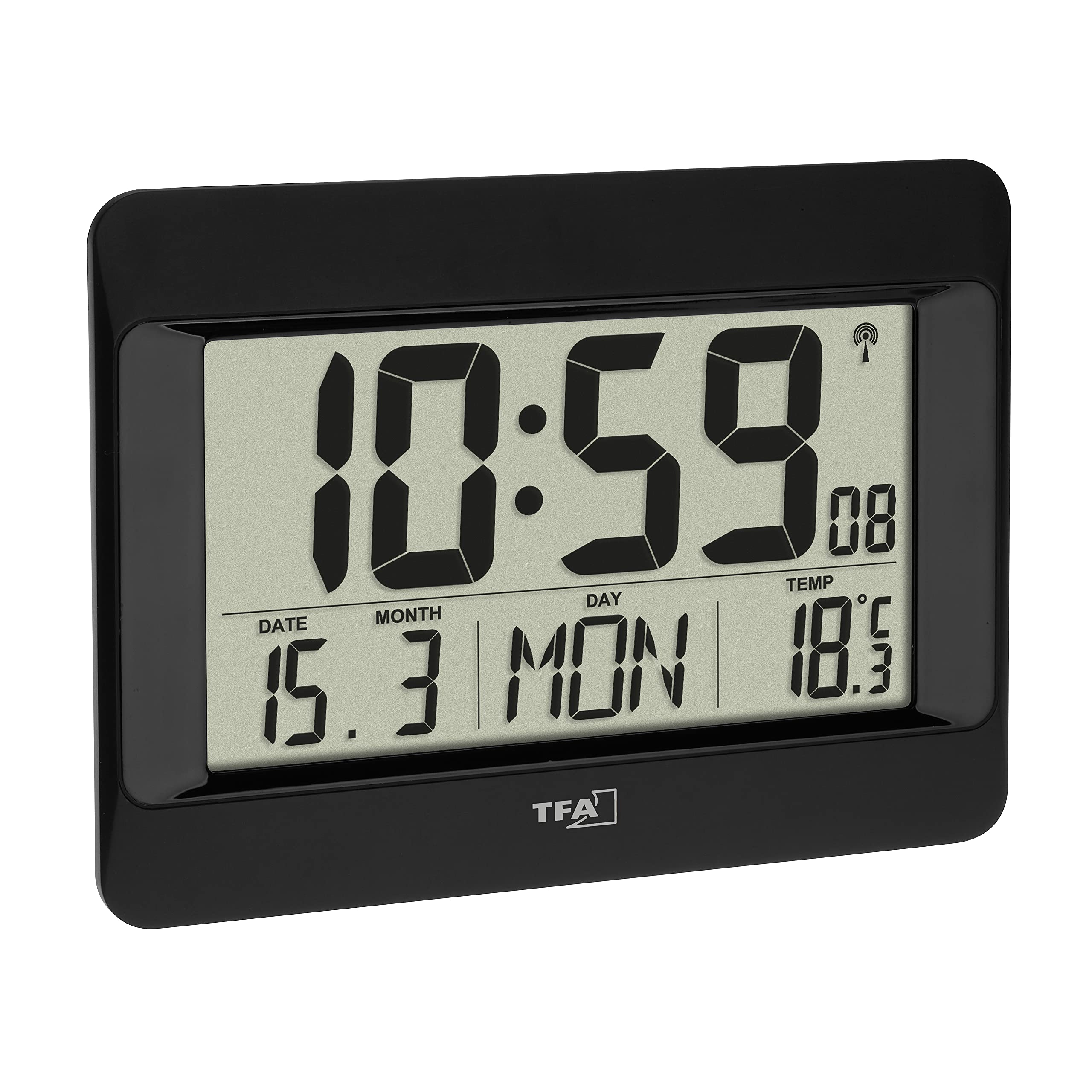 TFA Dostmann Wanduhr digital, 60.4519.01, Funkuhr mit Innentemperatur, Wochentag (8 Sprachen), Datum, Küchenuhr, Zeitzoneneinstellung, schwarz, Kunststoff, (L) 215 x (B) 160 x (H) 26 (68) mm