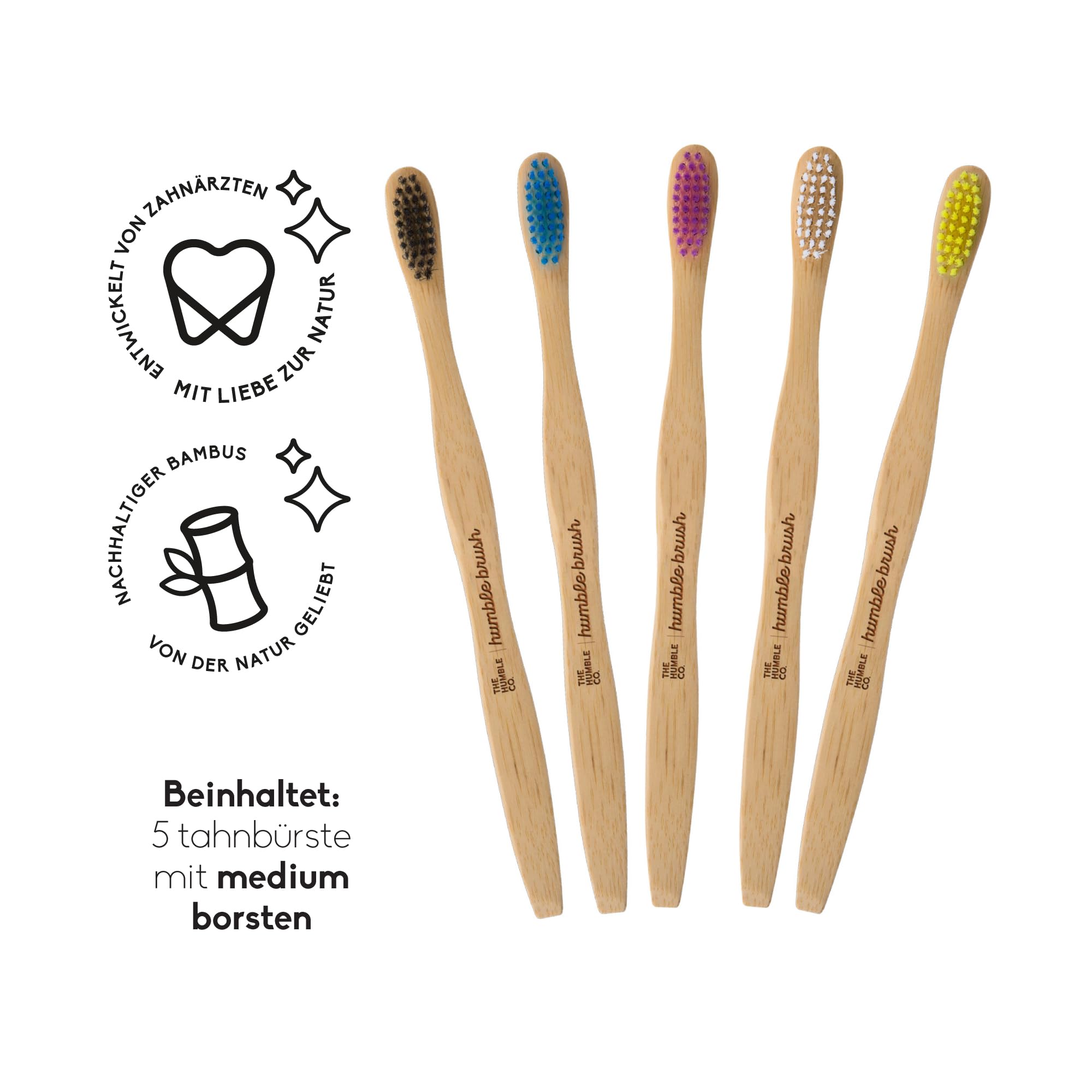 The Humble Co. Bietet leichten Zugang zu nachhaltigen Mundpflegeprodukten für bewusste und umweltfreundliche Menschen. Unsere Vision ist es, eine Welt zu schaffen, in der Nachhaltigkeit der Standard ist, in der Qualität und Umweltverantwortung Hand in Hand gehen. Wir glauben, dass die Pflege der Umwelt nicht auf Kosten der Leistung gehen sollte. Jeder Kauf einer Humble Zahnbürste trägt zu Mundgesundheitsprojekten bei, die benachteiligten Kindern zugute kommen. Durch unsere Zusammenarbeit mit der Humble Smile Foundation hat unser schwedisches Unternehmen erfolgreich Projekte in 106 lokalen Gemeinden in 50 Ländern weltweit umgesetzt. Bescheidene Zahnbürsten können mit Ihrem Bio-Müll entsorgt werden. Die Verpackung ist umweltfreundlich. Die Box und die innere Verpackung sind aus recyceltem Papier. Von mittel bis ultraweich, The Humble Co. Bambus-Zahnbürsten bieten pflanzliche Produkte, die für Erwachsene und Kinder geeignet sind. Unsere Humble Zahnbürsten verwenden hochwertige Materialien, die eine hervorragende Mundhygiene gewährleisten. Sie enthalten eine Vielzahl von Farben und Designs, um verschiedenen Vorlieben gerecht zu werden. Das von Zahnärzten entworfene und empfohlene Humble Mixed Adult Medium Zahnbürsten-Display verfügt über BPA-freie Nylonborsten mit abgerundeten Spitzen, die optimale Reinigungsergebnisse gewährleisten. Der Holzgriff ist aus 100 % biologisch abbaubarem Bambus gefertigt und mit einer natürlichen Wachsabdeckung für ultimative Hygiene beschichtet.