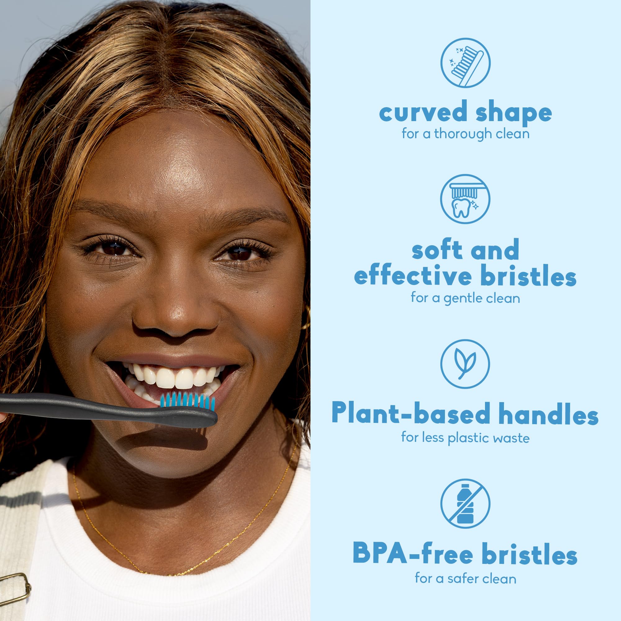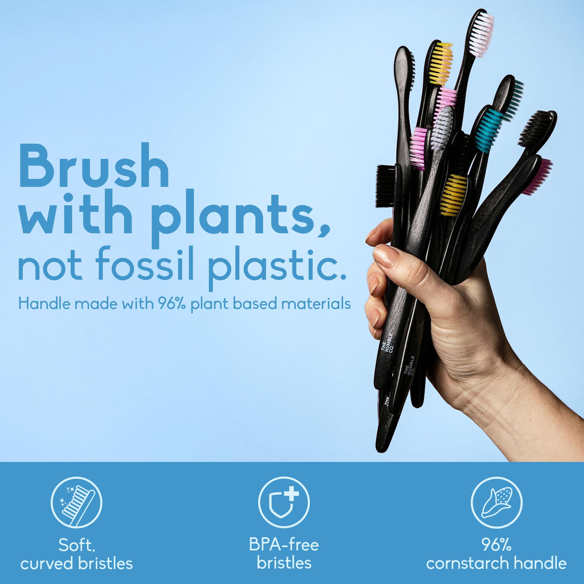 Wir stellen Ihnen die pflanzlichen Zahnbürsten von The Humble Co. vor, ein Produkt, mit dem Sie mit gutem Gewissen putzen können. Hergestellt von fürsorglichen Zahnärzten, die Ihr Wohlbefinden, die Umwelt und die Mundgesundheit von Kindern in Not priorisieren. Diese manuellen Zahnbürsten für Erwachsene und Kinder haben eine positive Wirkung. Mit der Verpflichtung, ein Lächeln zu schenken, trägt unser grosses Zahnbürsten-Set zu Mundgesundheitsprojekten für Kinder auf der ganzen Welt bei. Diese Zahnbürste wurde von Zahnexperten entwickelt und empfohlen und bietet eine Reinigungsleistung auf Augenhöhe mit Kunststoffgegenstücken und enthält gleichzeitig eine Mischung aus pflanzlichen und konventionellen Materialien. Jede Zahnbürste in unserer Packung Zahnbürsten ist so gebaut, dass sie ungefähr drei Monate hält, genau wie normale Zahnbürsten. Über die traditionelle Kunststoff-Zahnbürste hinaus besteht diese Zahnbürste für Erwachsene überwiegend aus pflanzlichen Materialien. Im Gegensatz zu einer billigen Zahnbürste verfügt unsere Bürste über BPA-freie, 6 Nylonborsten, verpackt in einer 100% recycelbaren Box, komplett mit einer Innenverpackung aus Pflanzen. Die Erhaltung gesunder Zähne ist ein Kinderspiel mit unserer sanften Mundzahnbürste Soft Style. Tragen Sie einfach eine kleine Menge Ihrer bevorzugten Humble-Zahnpasta auf die Borsten auf und bürsten Sie sie zart für eine effektive Plaque-Entfernung. Wir empfehlen, nach den Mahlzeiten oder zweimal täglich nach Anleitung von Zahnärzten zu bürsten. Durch die Wahl von BPA-freien Zahnbürsten investieren Sie nicht nur in gesündere Mundpflege, sondern unterstützen auch eine Mission, die sich gesünderen Menschen und einem gesünderen Planeten widmet. Begleiten Sie uns auf unserer bescheidenen Reise, indem Sie unsere Produkte weiterhin umarmen. In dem unwahrscheinlichen Fall, dass Sie mit Ihrer Mundpflege-Zahnbürste unzufrieden sind, ist unser engagiertes Team hier, um es richtig zu machen. Ihre Zufriedenheit ist unsere Priorität! Unsere weichen Zahnbürsten für Erwachsene werden in einer einzigen Packung geliefert und enthalten 5 Bürsten.