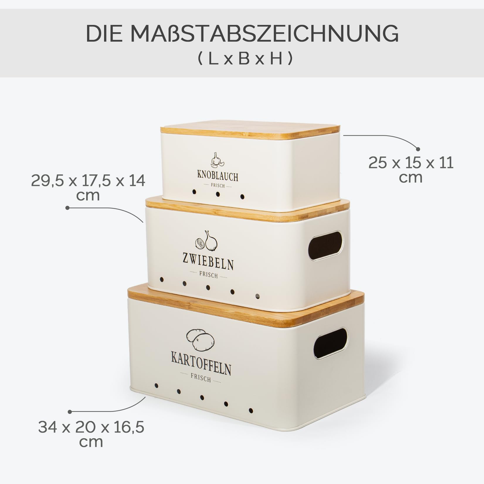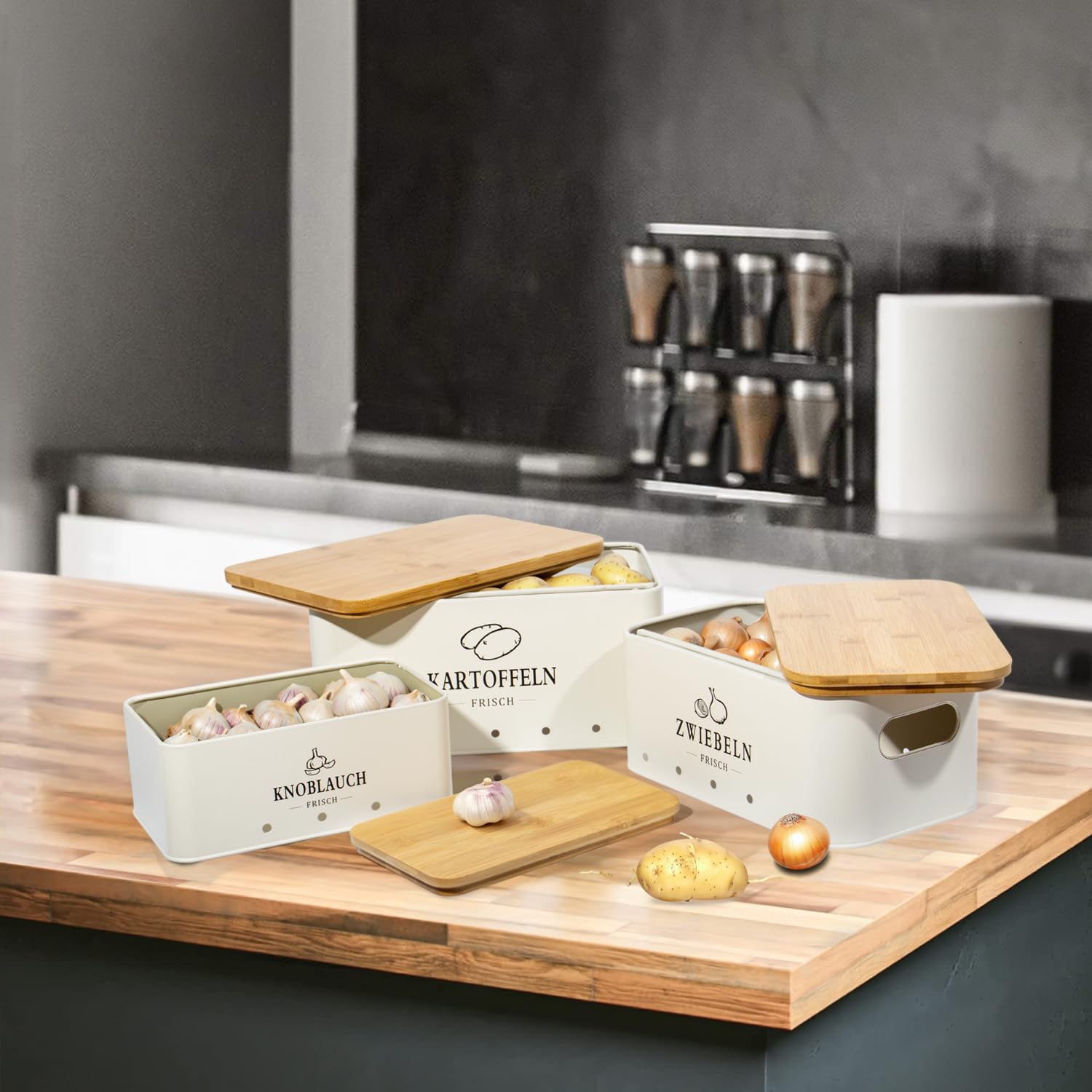 KÜCHE AUFBEWAHRUNG & ORGANISATION - Drei Arten von Behältern können alle Arten von Lebensmitteln aufbewahren.Kartoffeltopf (9 L) kann bis zu 5 kg Kartoffeln aufnehmen,Zwiebeltopf (6 L) kann 2,5 kg Zwiebeln aufnehmen,Knoblauchtopf (3 L) fasst 14 Knollen.