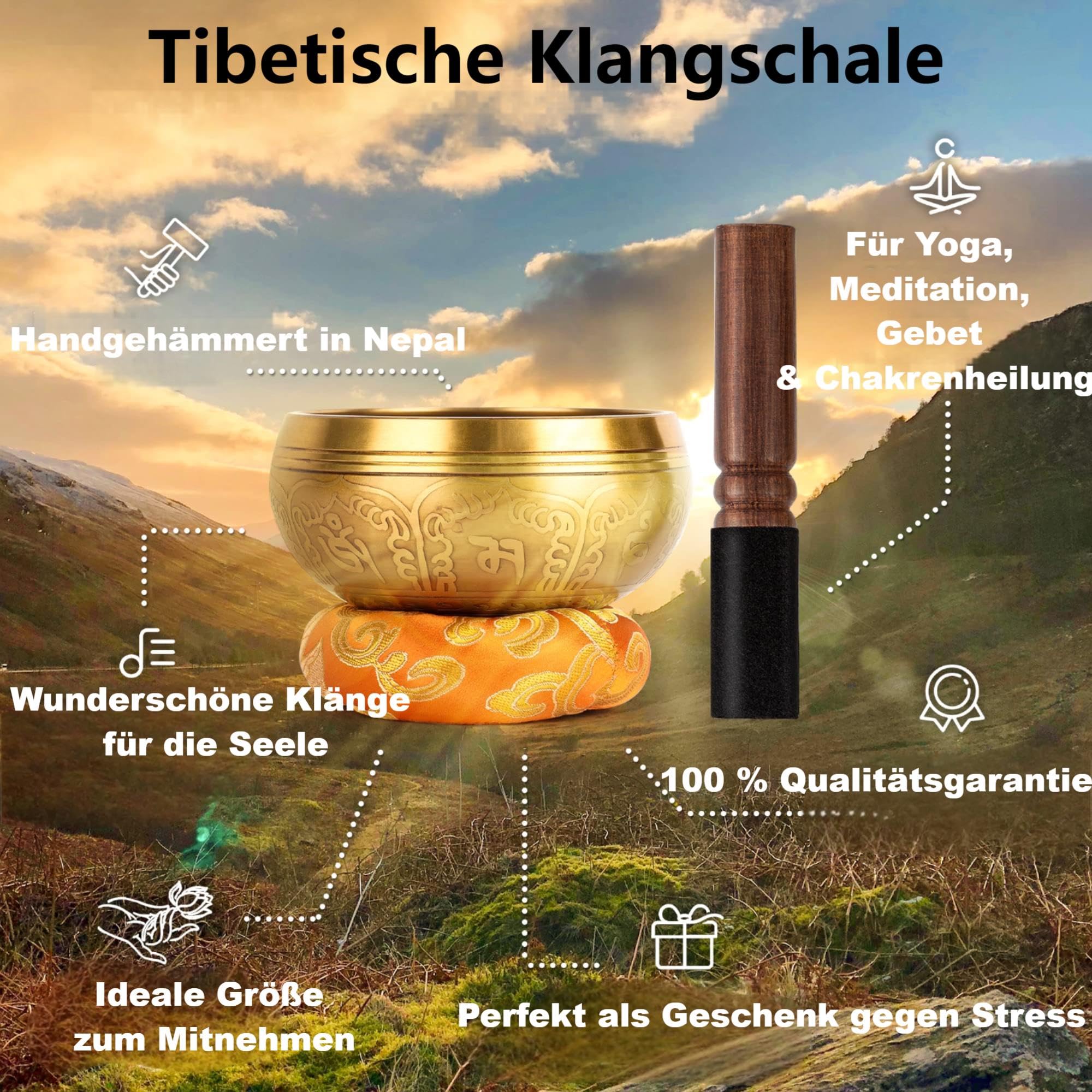 • Uralte Klangtherapie: Schlagen der tibetischen Klangschalen erzeugt natürliche Klänge; fördert tiefe Gehirnentspannung und beruhigt den Geist