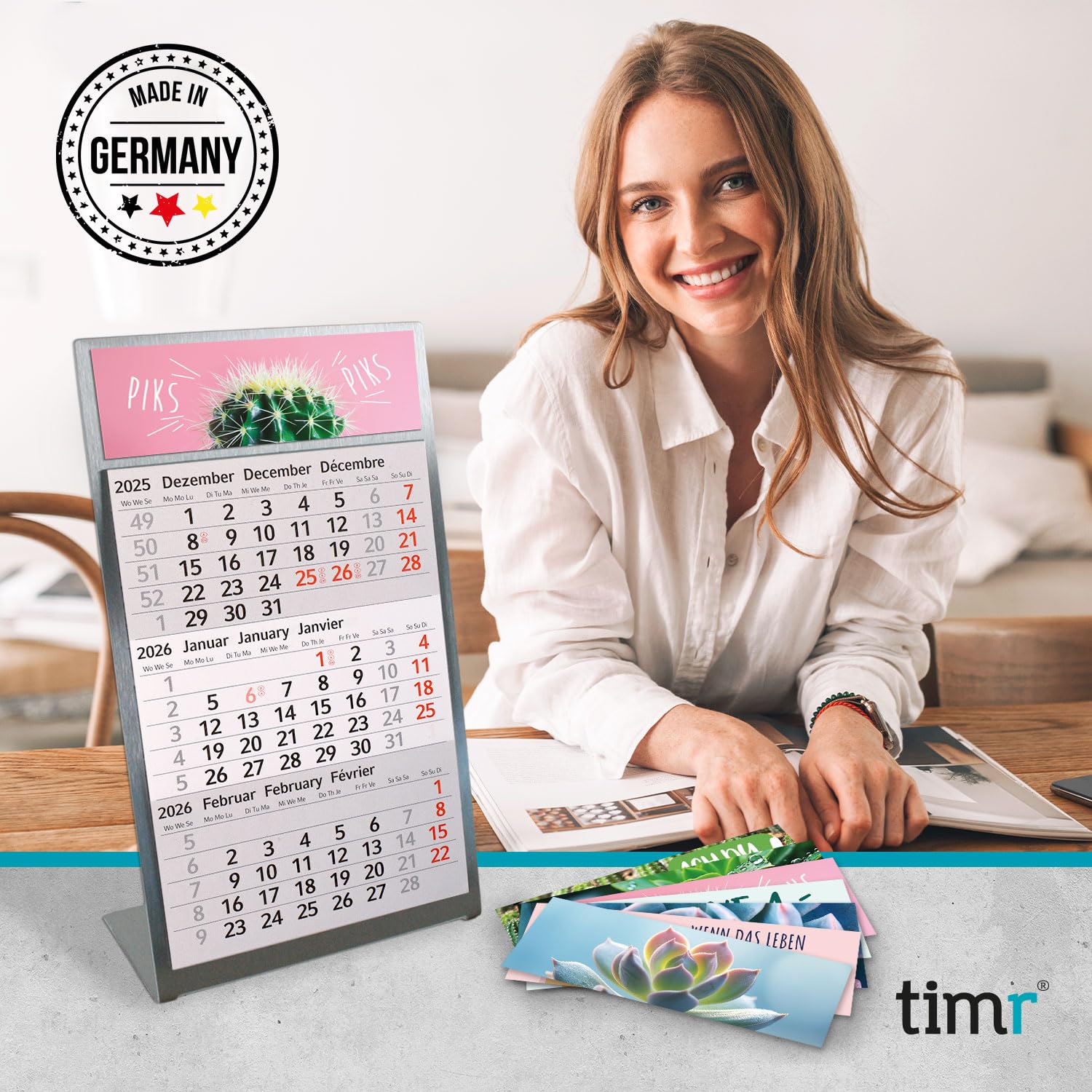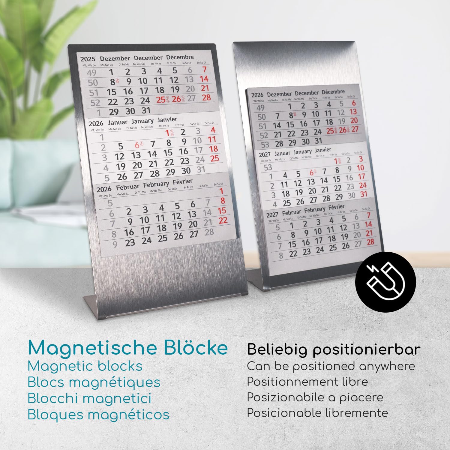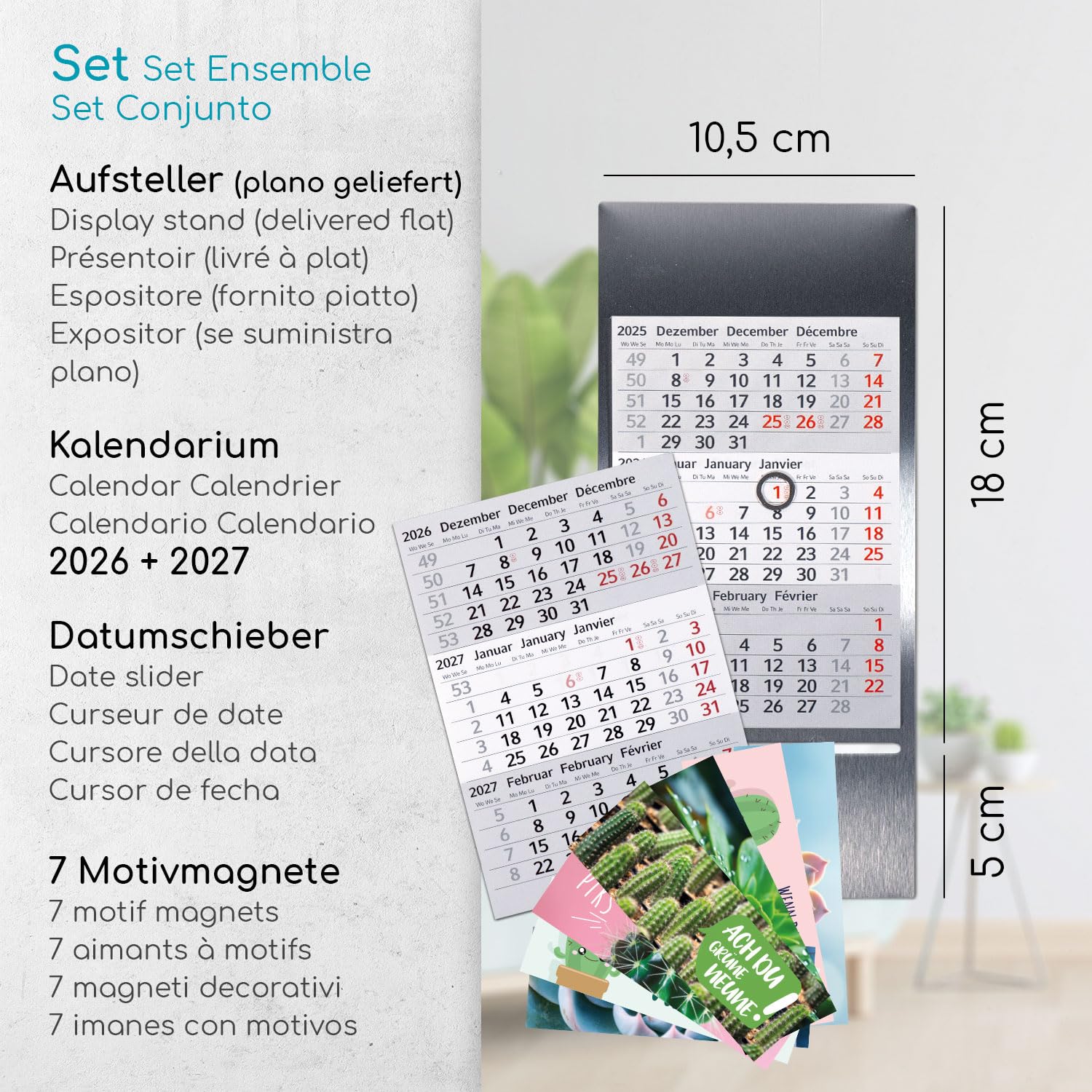 Timr Tischkalender zum Aufstellen aus Edelstahl I Kakteen-Motiv I für 2 Jahre 2026/2027 I Hochformat 105 x 230 mm I 3-Monatsübersicht mit Block Magneten I mehrsprachig D/GB/F I 7 Motive I tr204