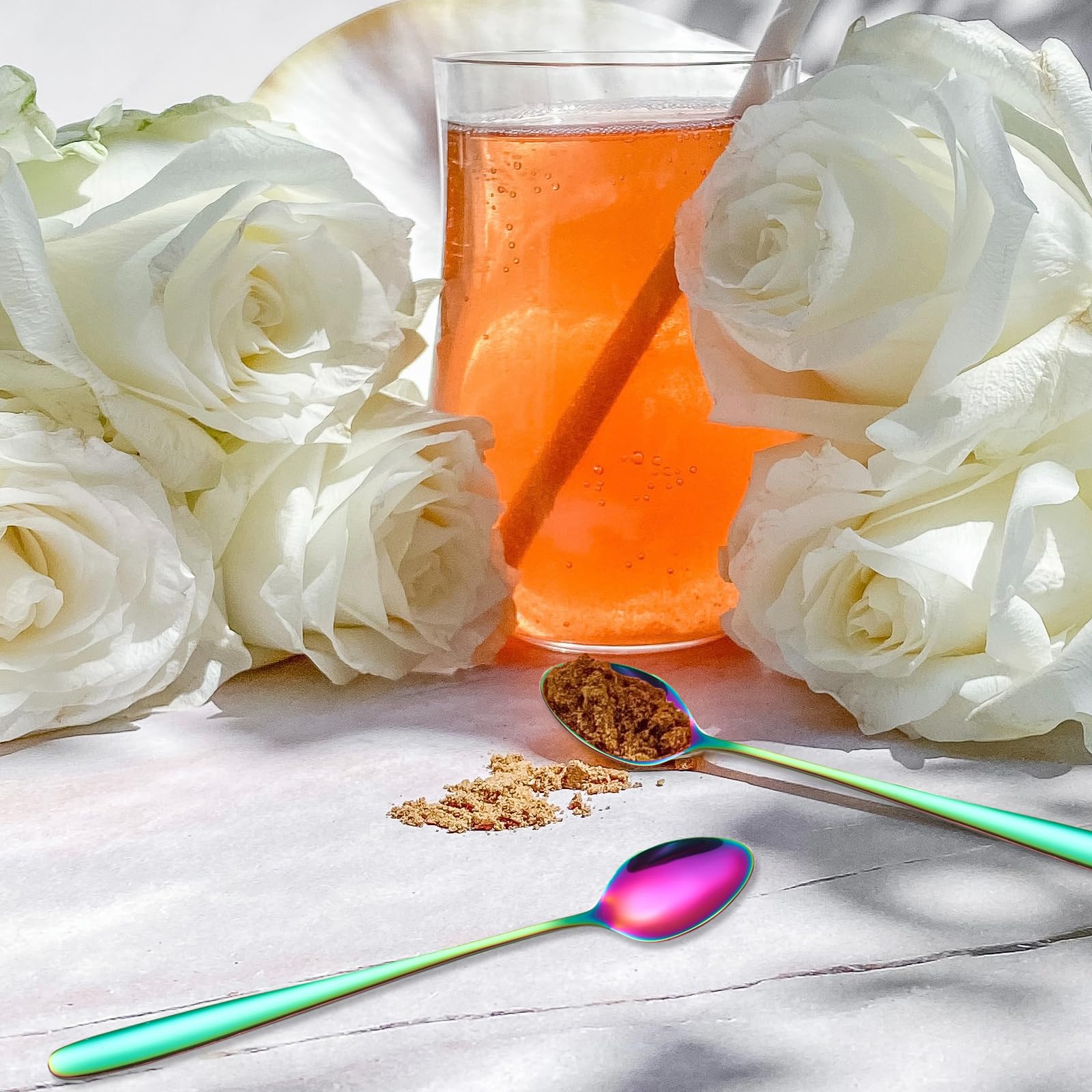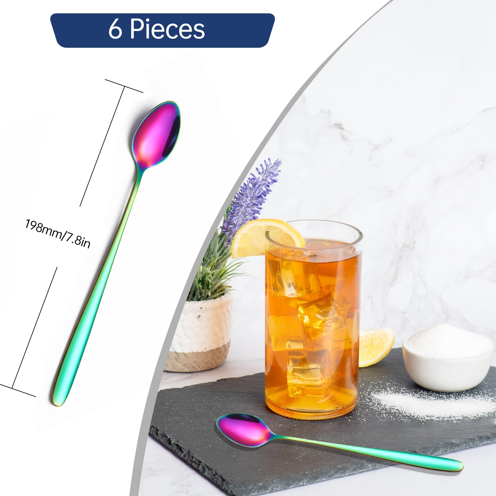 6 Stück 19.8 cm Lang Eislöffel Edelstahl, Löffel mit Langem Stiel, Lange Kaffeelöffel Teelöffel Dessertlöffel, Longdrinklöffel für Latte Macchiato Sundae (Regenbogenfarbe)