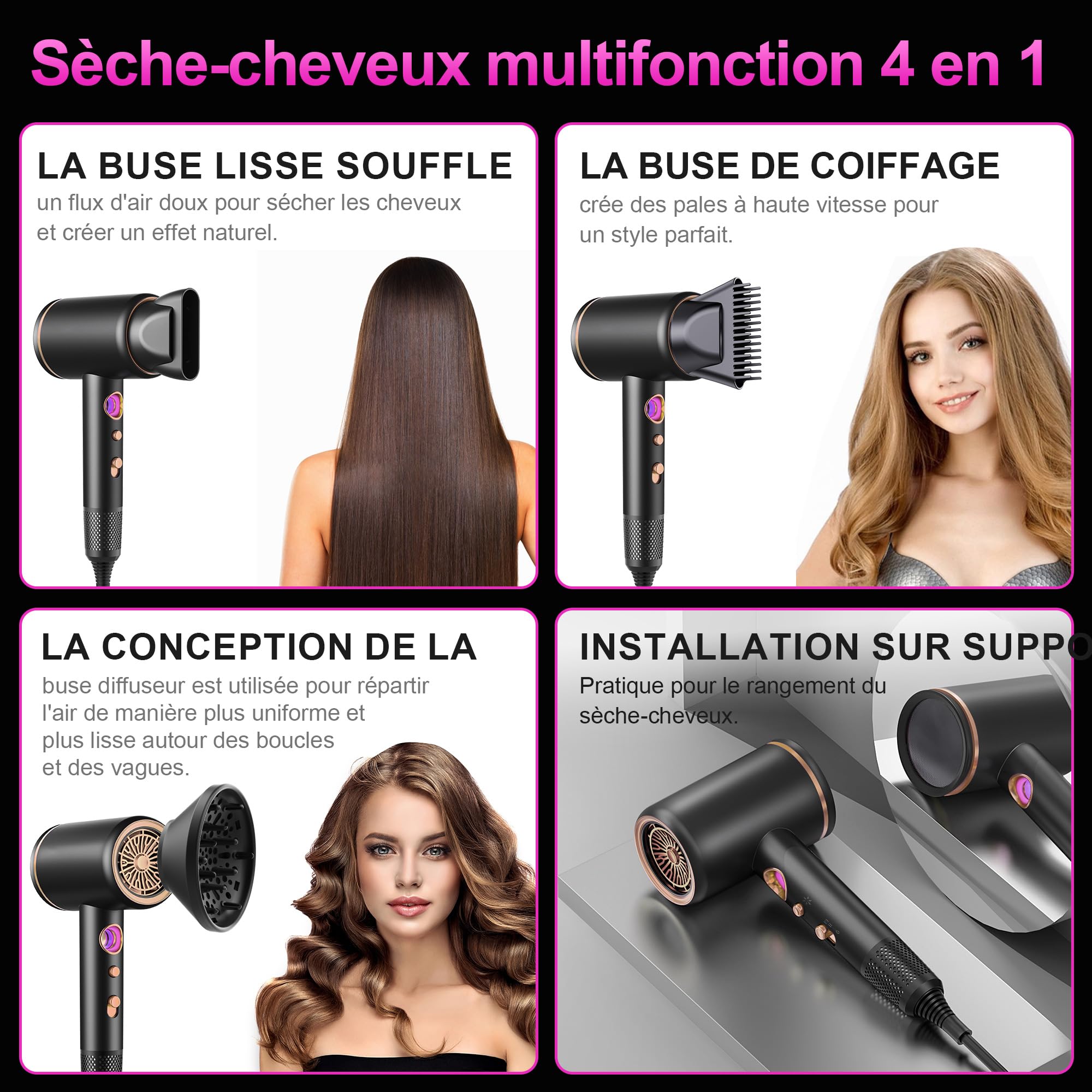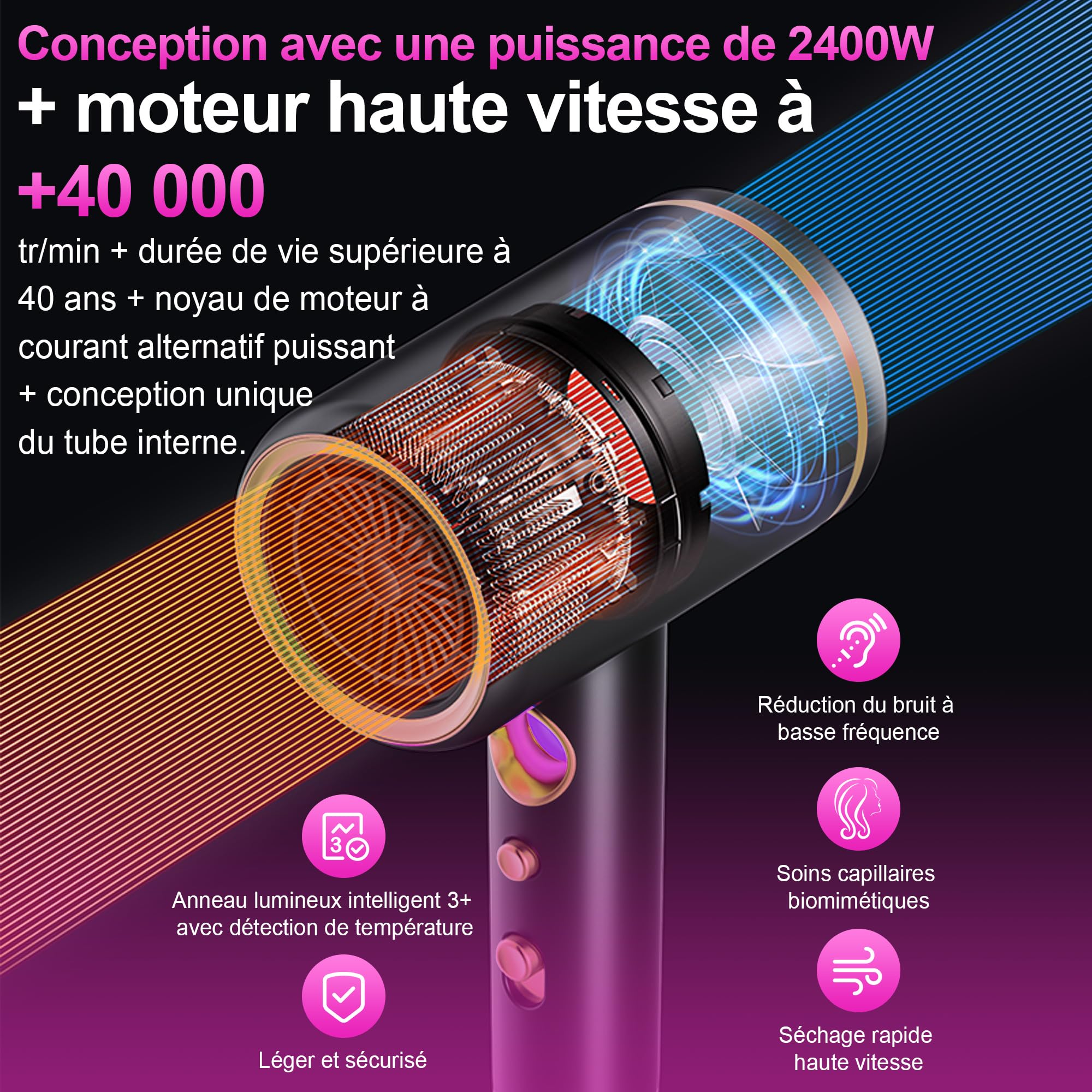 - Dieser Haartrockner verwendet eine 2400W ultra starke Leistung, schnell zu trocknen, hohe Konzentration Duft negative Ionen, intelligente konstante Temperatur und keinen Schaden für das Haar, 3 Windschutzscheibenpositionen+intelligenter AI-Modus, Milliarden Level negative Ionen Haarpflege, schnell zu trocknen Form, glatt und nicht rau, importierter Hochgeschwindigkeitsmotor mit 40000 Drehzahl, niederfrequente Rauschunterdrückung, biomimetische Haarpflege, 3+intelligente Temperatursensoröffnung