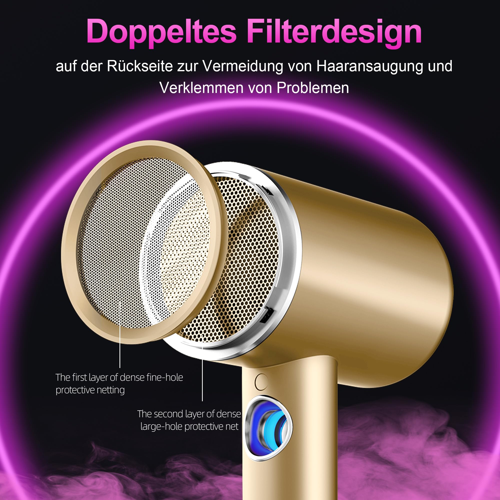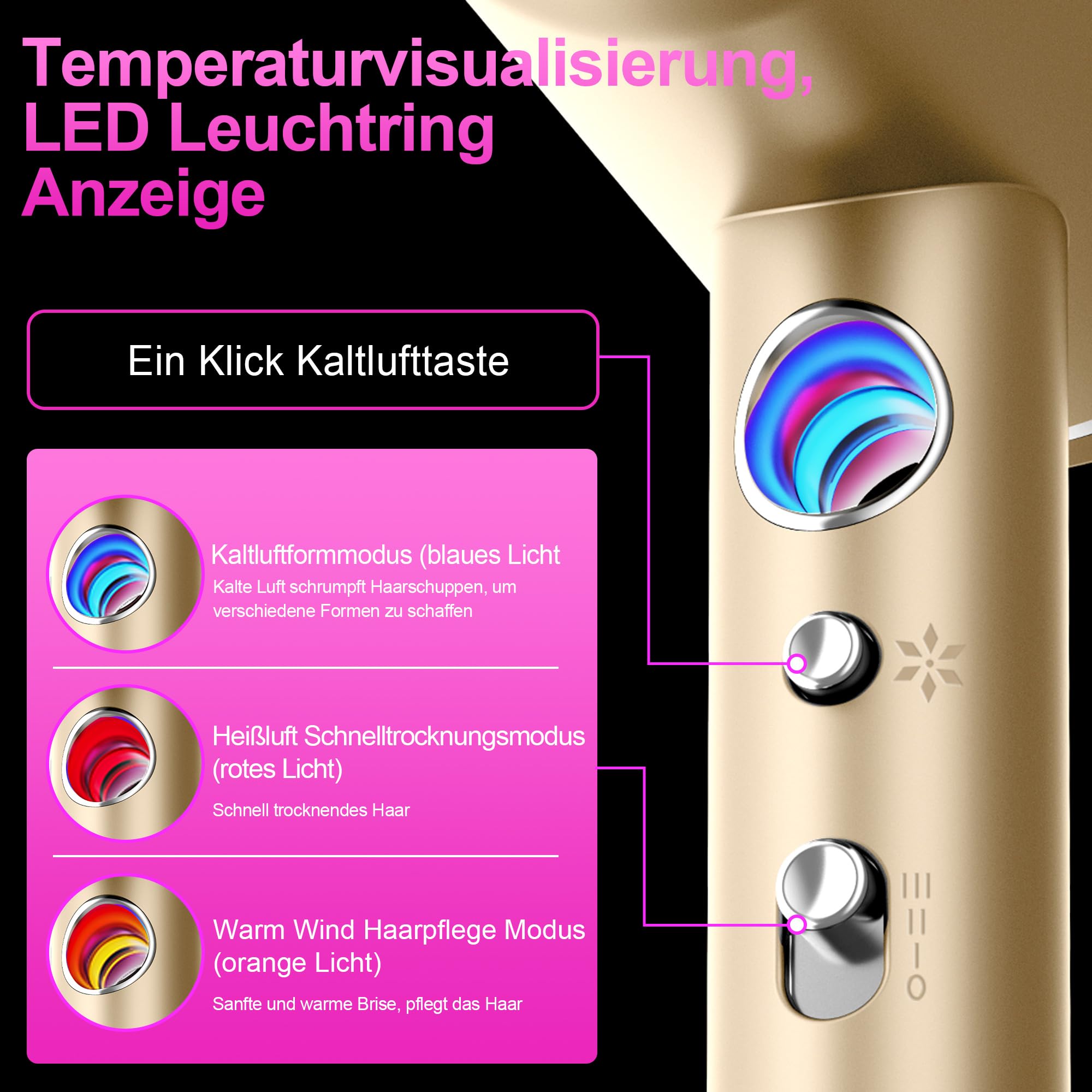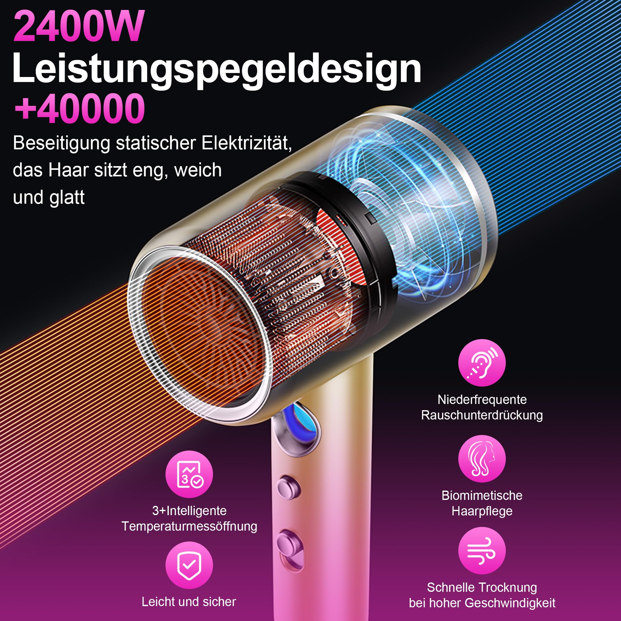 Dieser Haartrockner hat eine ultrastarke Leistung von 2400 W, trocknet schnell, hat eine hohe Konzentration an negativen Duftionen, eine intelligente konstante Temperatur und ist nicht haarschädigend, hat 3 Windschutzpositionen, intelligenten KI-Modus, Haarpflege mit einer Milliarde negativen Ionen, trocknet schnell, ist glatt und nicht rau, importierter Hochgeschwindigkeitsmotor mit 40.000 U/min, niederfrequente Geräuschunterdrückung, biomimetische Haarpflege, 3 intelligente Temperatursensoröffnungen. Dieser Haartrockner steht konstant an der Spitze der Bestsellerliste und verfügt über eine Technologie zur Verdoppelung des Luftstroms, einen Motor mit 40.000 U/min, 22 Meter pro Sekunde (starke Winde auf Hurrikan-Niveau) und eine von über 3.000 Stunden. LED-Lichtringanzeige, mehrere Windtemperaturen für alle Jahreszeiten, hochwertiger galvanischer Schalter, längere und dauerhaftere . Dieser Haartrockner verfügt über einen intelligenten Konstanttemperaturschutz zur Pflege Ihres Haares. NTC erkennt 1500 Mal pro Sekunde, und sobald die Windtemperatur 100° überschreitet, wird der Heizdraht sofort unterbrochen, wodurch Ihr Haar gepflegt, geschmeidig und glänzend bleibt. Das doppelschichtige Filterdesign löst effektiv das Problem des Haaransaugens im hinteren Netz. Dieser Haartrockner verwendet ultraleise Technologie und moderne Motoren können den Geräuschpegel erheblich reduzieren, sodass Sie Ihr Vergnügen während der Nutzung steigern und eine ruhigere und gesündere Umgebung schaffen können. Mehrere Modusauswahl: Dieser Haartrockner hat zwei Modi zur Auswahl, heiss und kalt. Jeder Modus hat drei einstellbare Stufen und bietet ein multifunktionales und schnelles Trocknungserlebnis für jede Jahreszeit. Schnelles Styling, Sommer, Kaltluftmodus sorgt für Kühle und Stabilität, Winter, Heissluftmodus ermöglicht schnelles Trocknen und Wärme und Frühling und Herbst, Warmmodus schützt das Haar sanft. Erfüllt alle Ihre Bedürfnisse.