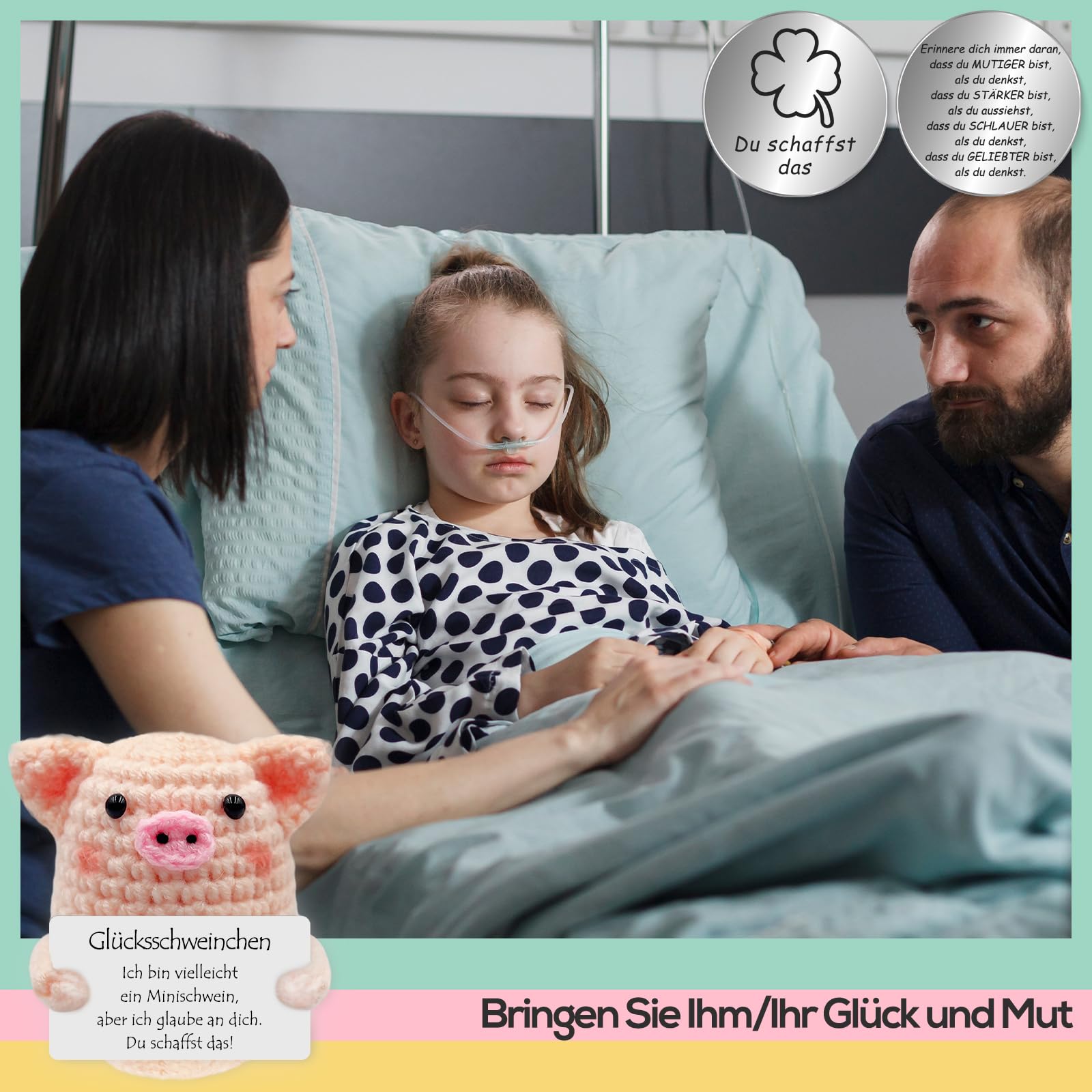 - Handgefertigt- Die Minischweinpuppe ist handgenäht und gestrickt mit Wolle und Baumwolle gestrickt, und mit einer Minikarte mit positiven Worten verziert. Und die Glücksbringer ist gemacht aus Edelstahl, ist deutlich mit Minischwein Mustern und ermutigenden Worten eingraviert.