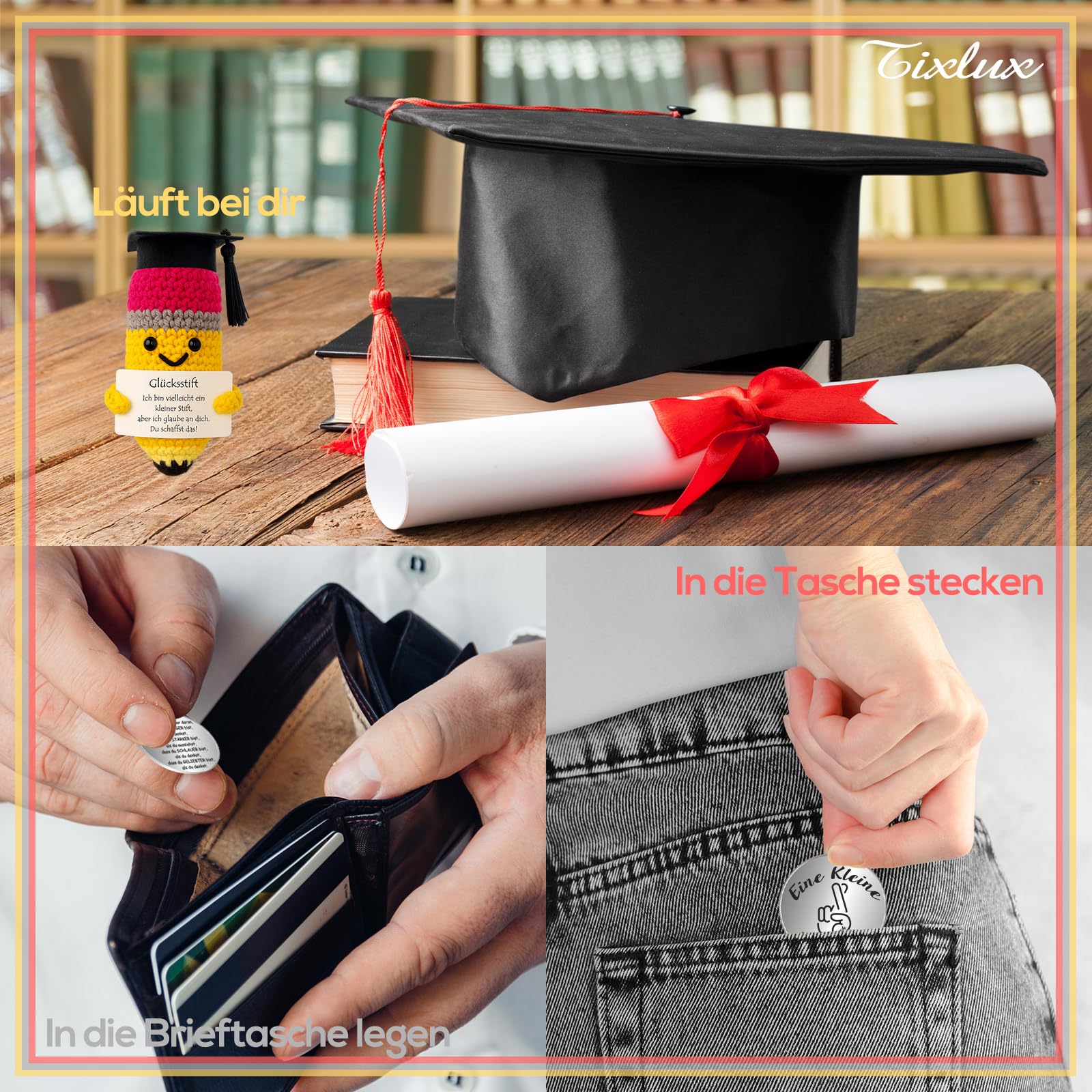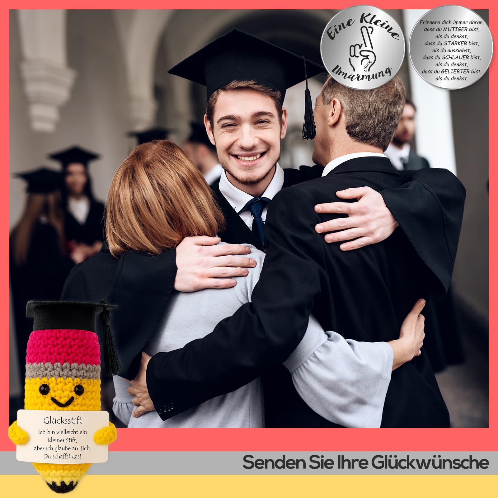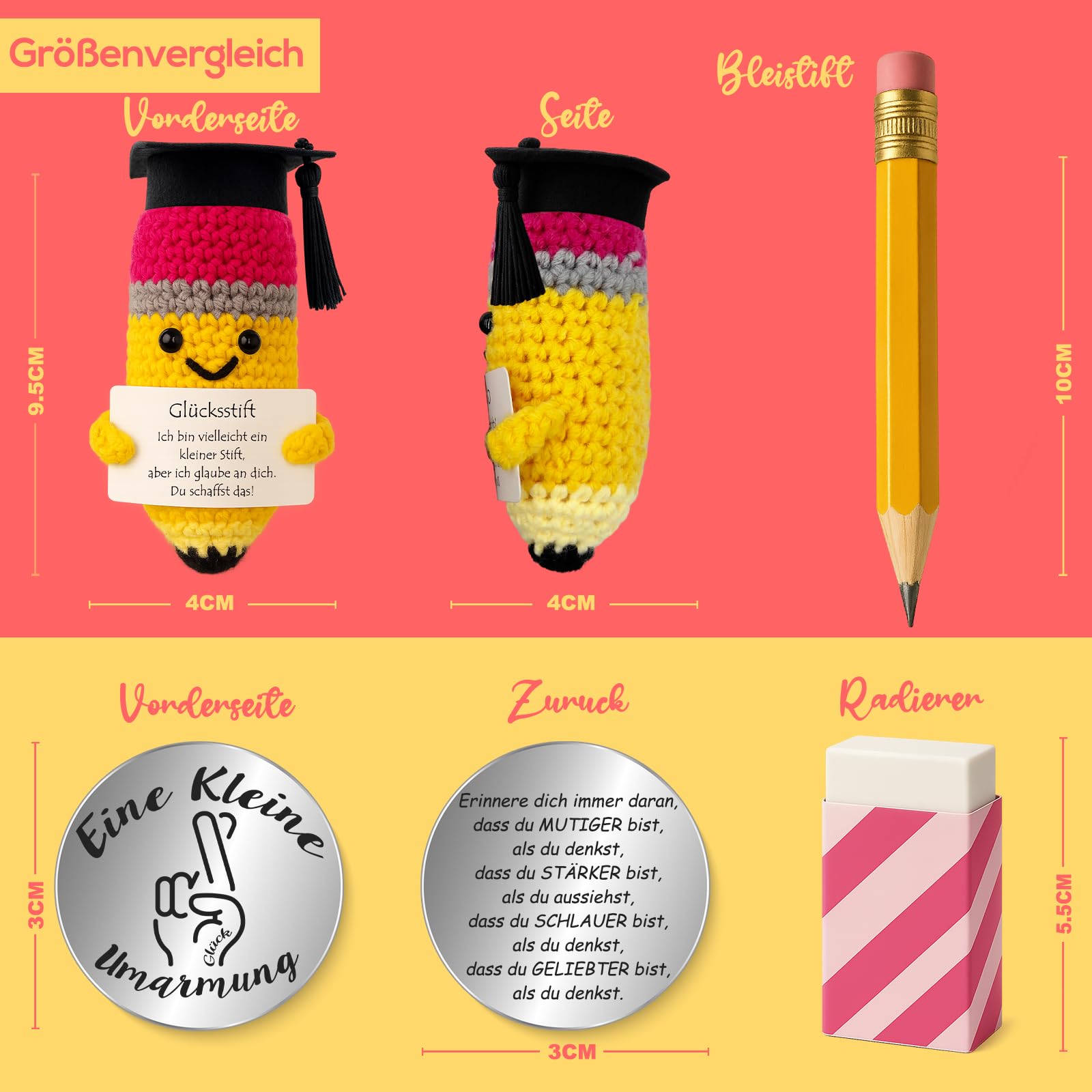 - ✏️ Winzig & Tragbar – Der Glücksstift (10 x 5 cm) und der kleine „Umarmung“-Glücksbringer (Ø 3 cm) passen bequem in jede Tasche oder jedes Federmäppchen. Sie sind ideale Begleiter im Alltag oder vor wichtigen Momenten wie Prüfungen und Bewerbungsgesprächen.
