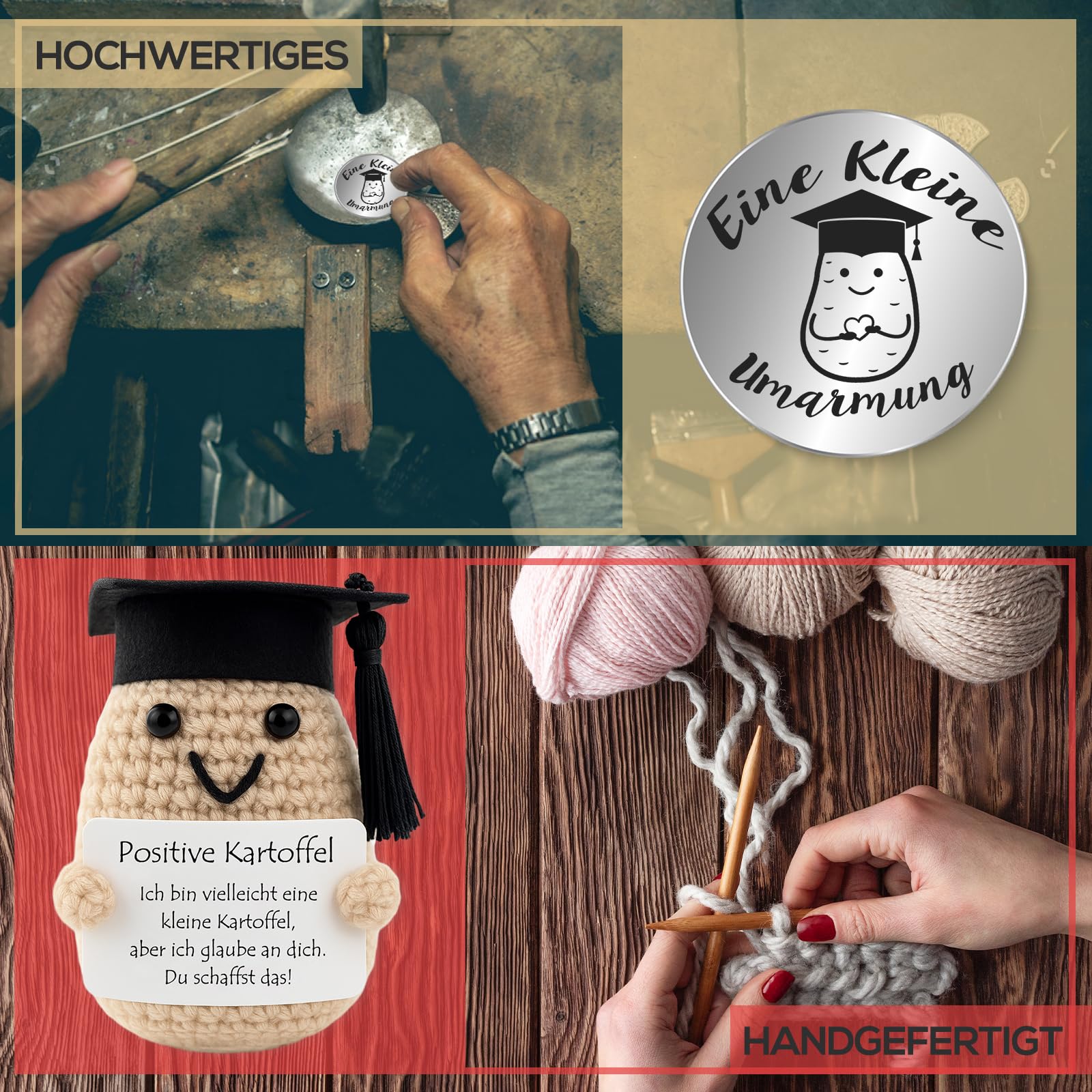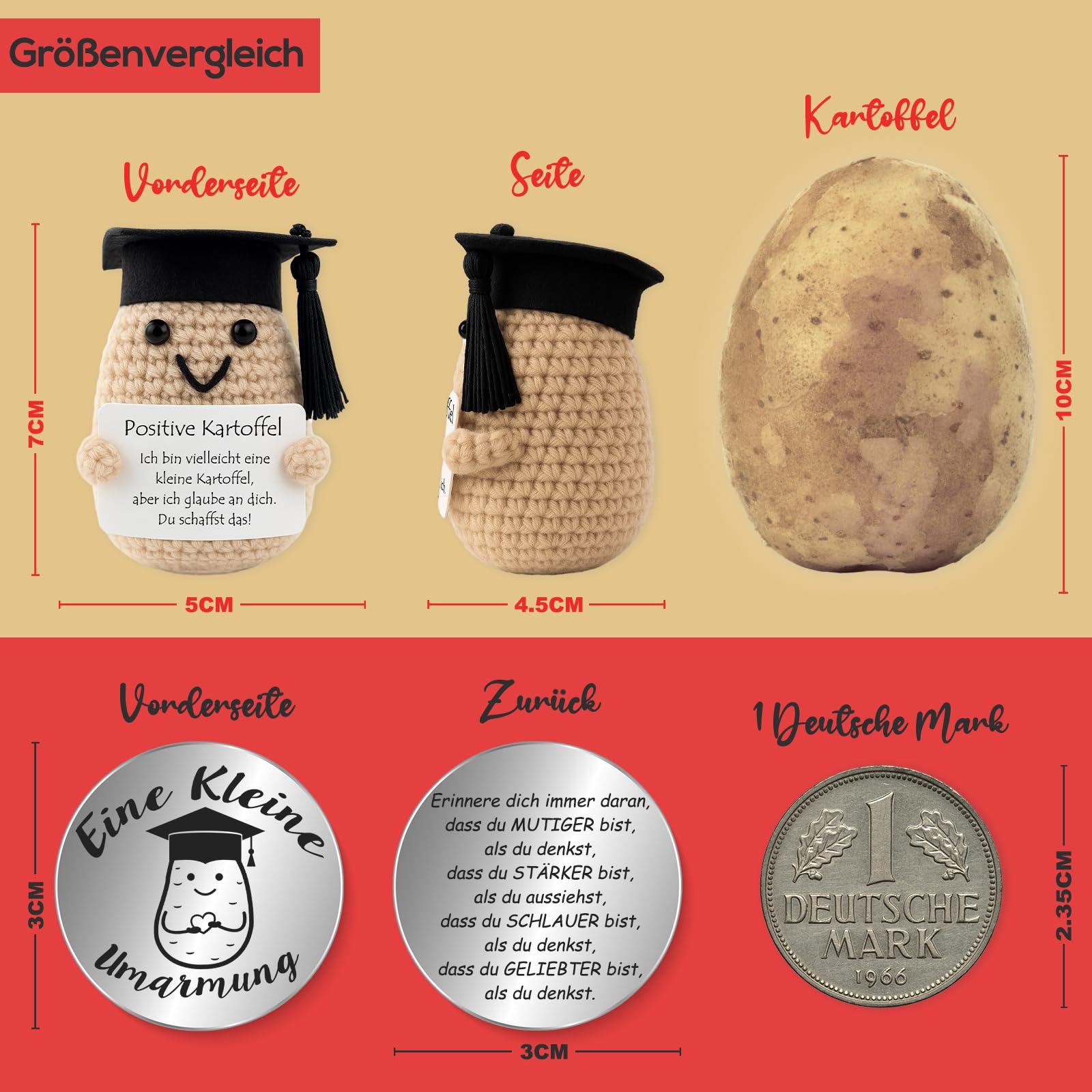 - Handgefertigt- Die Kartoffelpuppe ist handgenäht und gestrickt mit Wolle und Baumwolle gestrickt, und mit einer Minikarte mit positiven Worten verziert. Und die Glücksbringer ist gemacht aus Edelstahl, ist deutlich mit Kartoffel Mustern und ermutigenden Worten eingraviert.