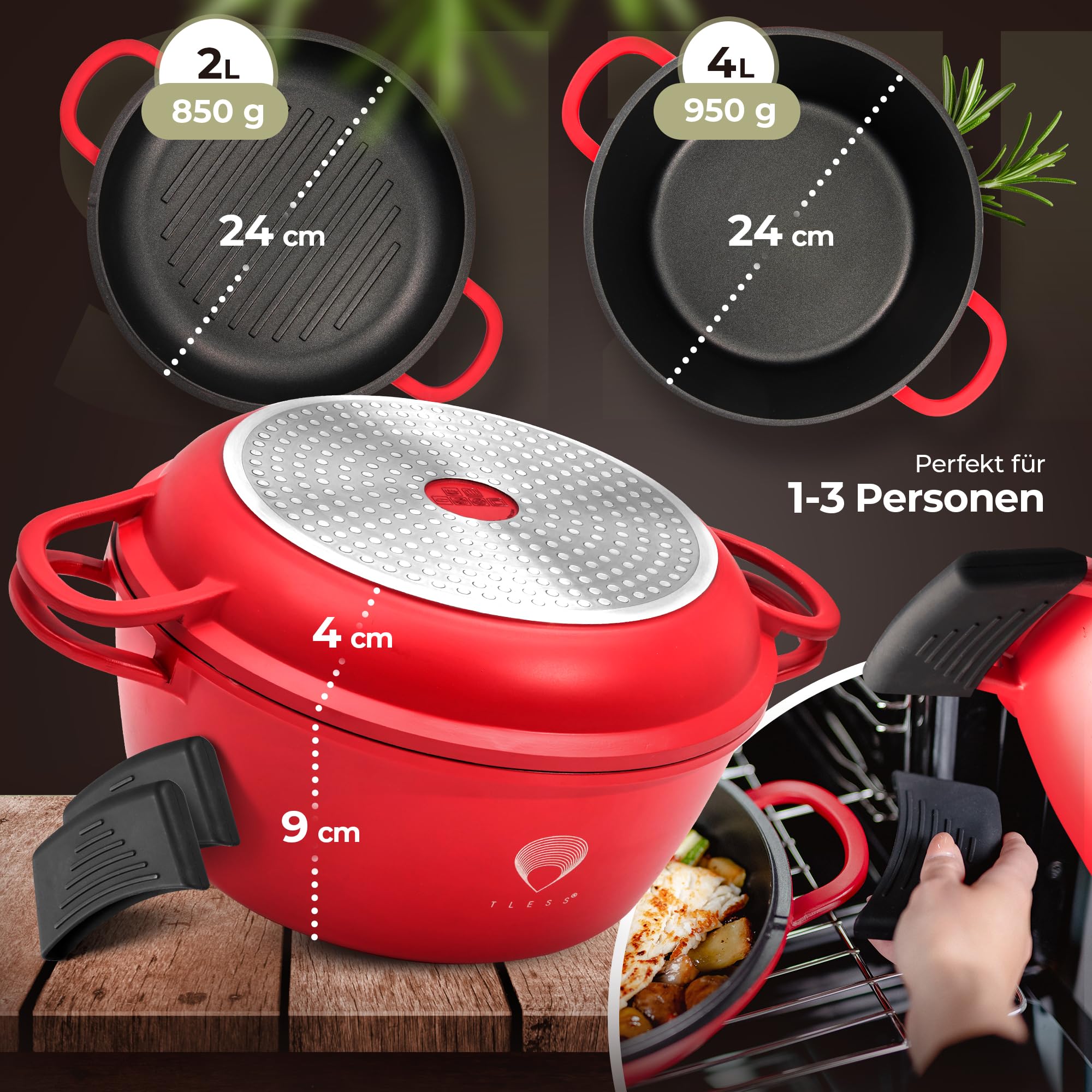 TLESS® 2in1 Aluguss Bräter mit Deckel backofengeeignet | Schmorpfanne & Schmortopf oder als Bratentopf für Induktion | sehr leicht & widerstandsfähig | Ø 24 cm 4 Liter rot