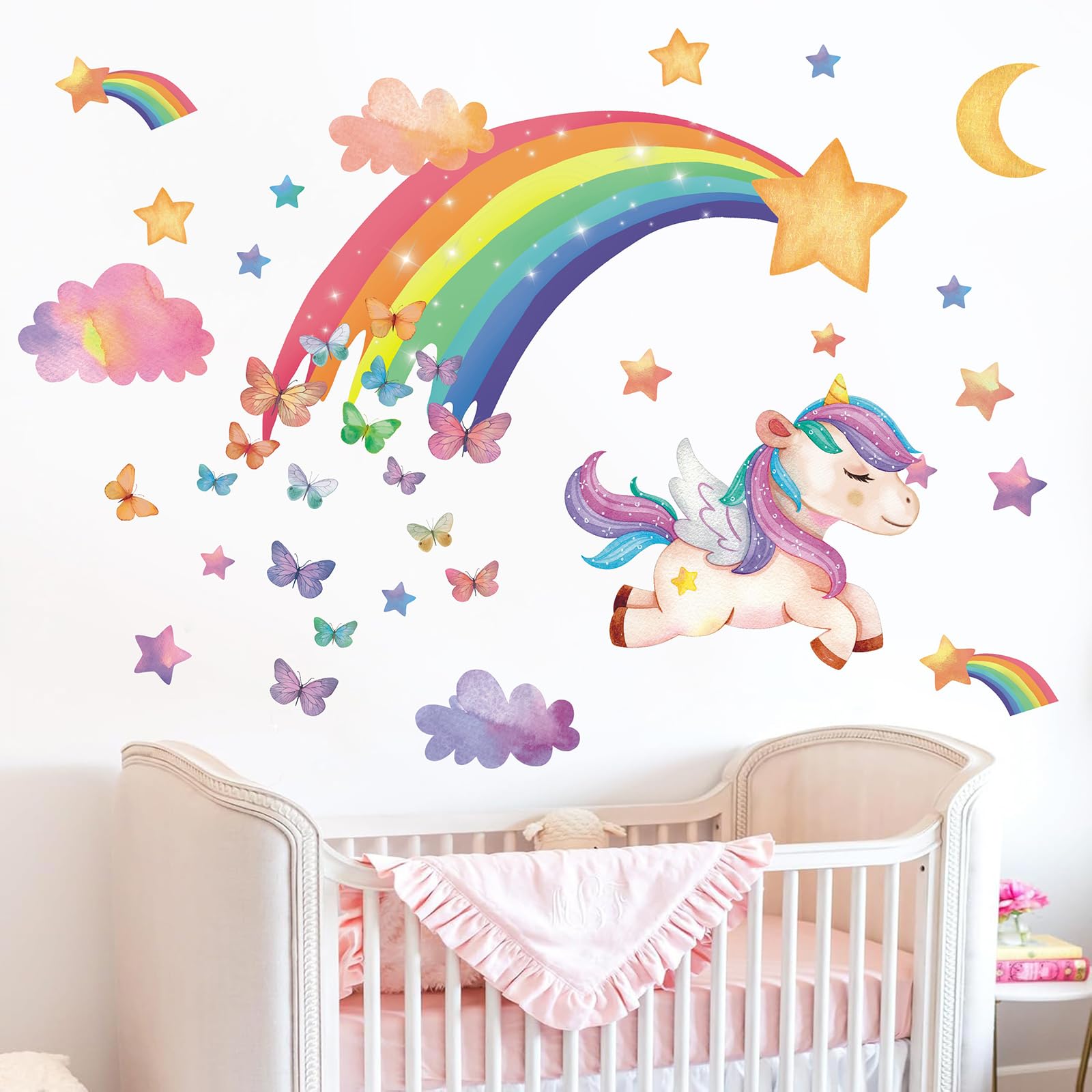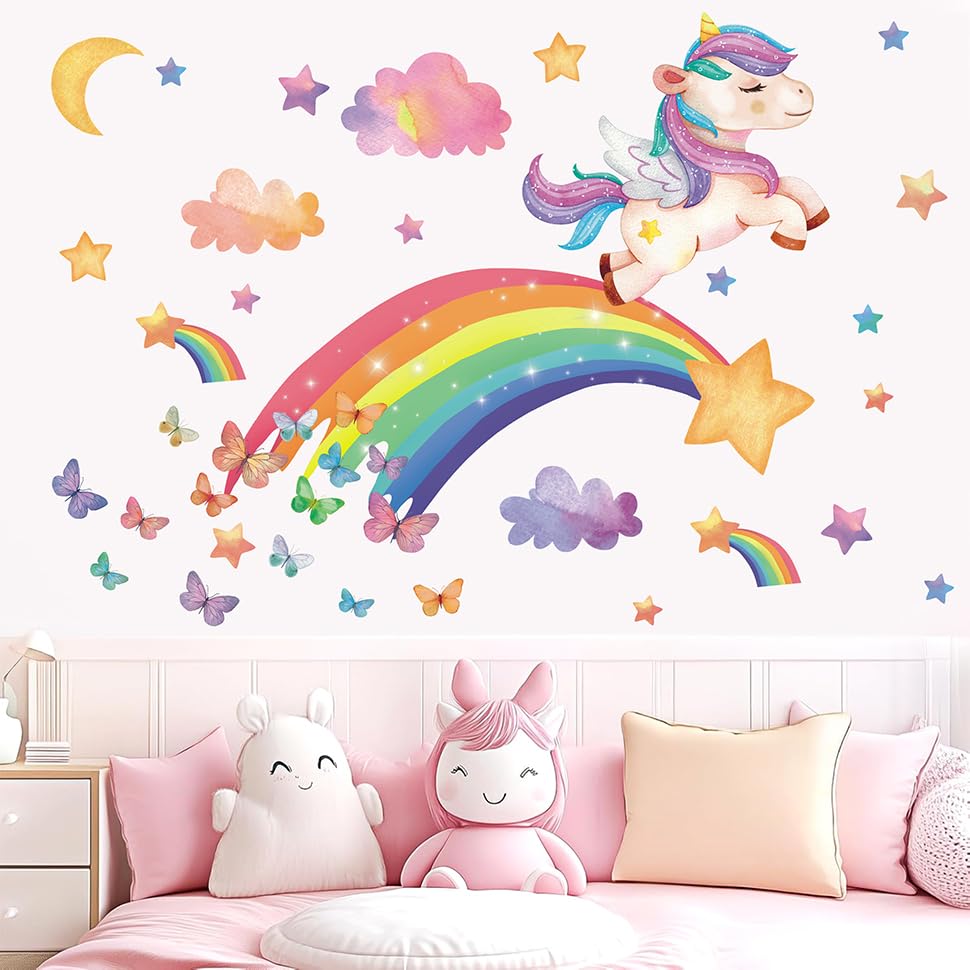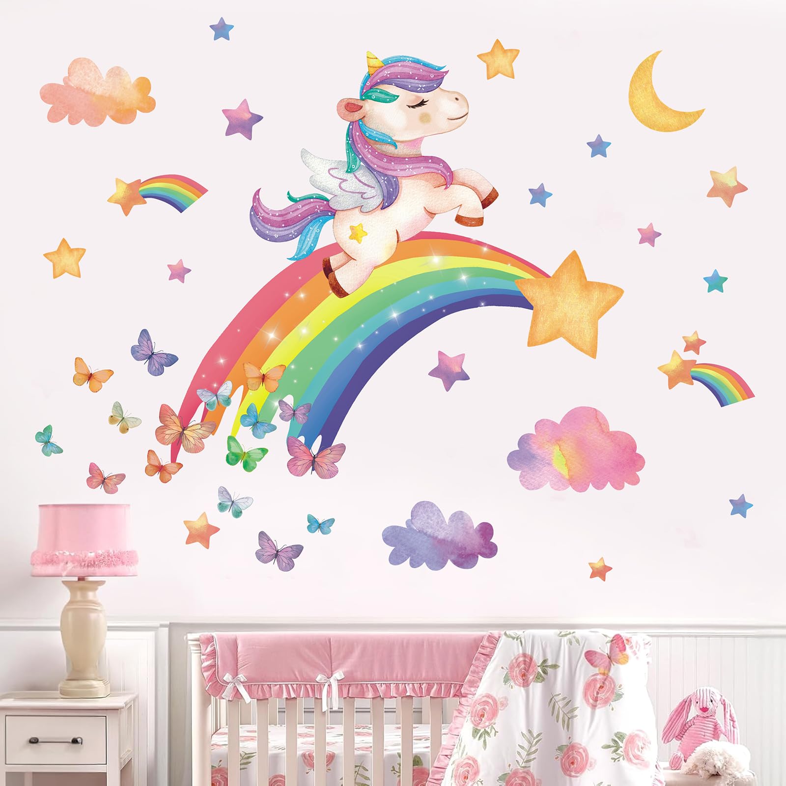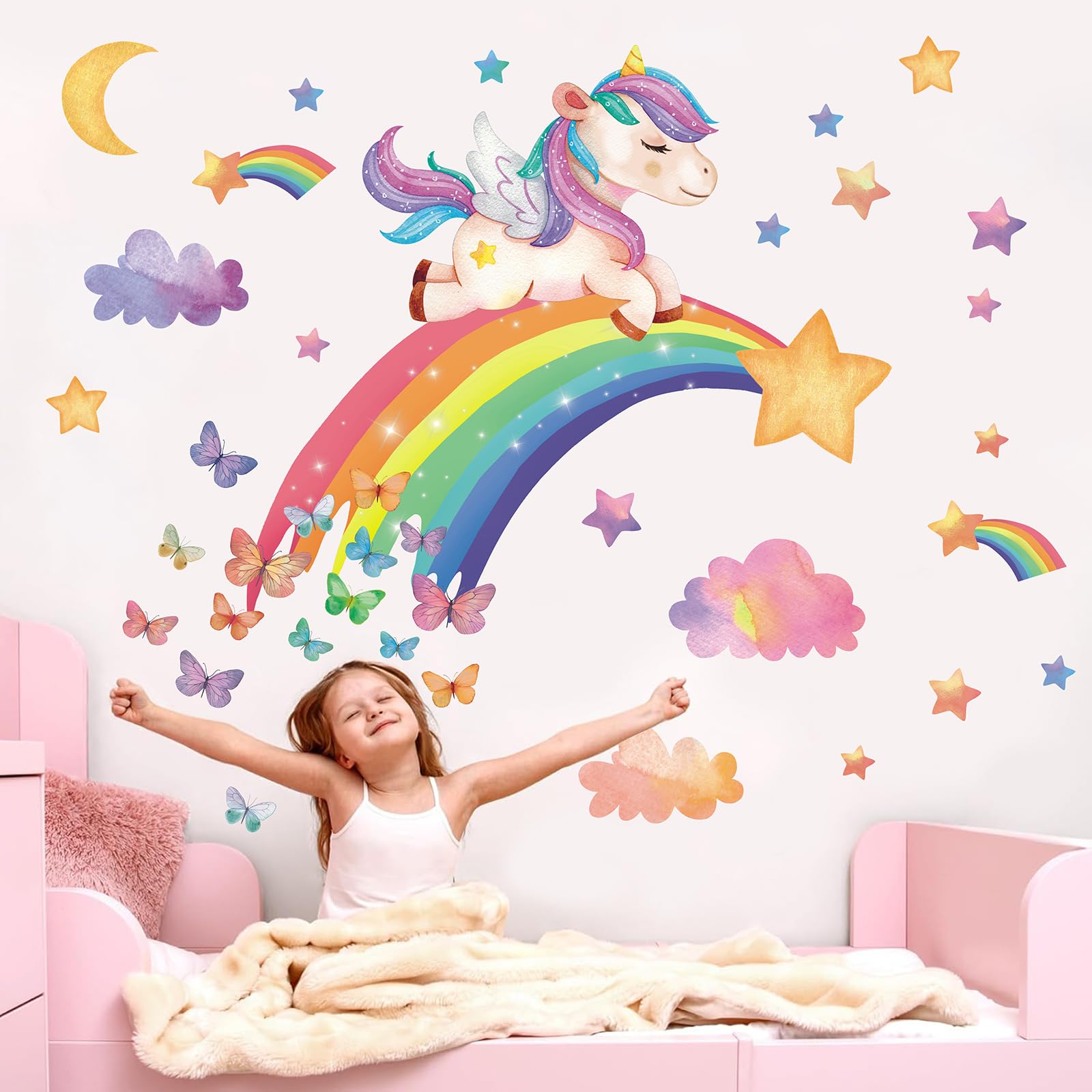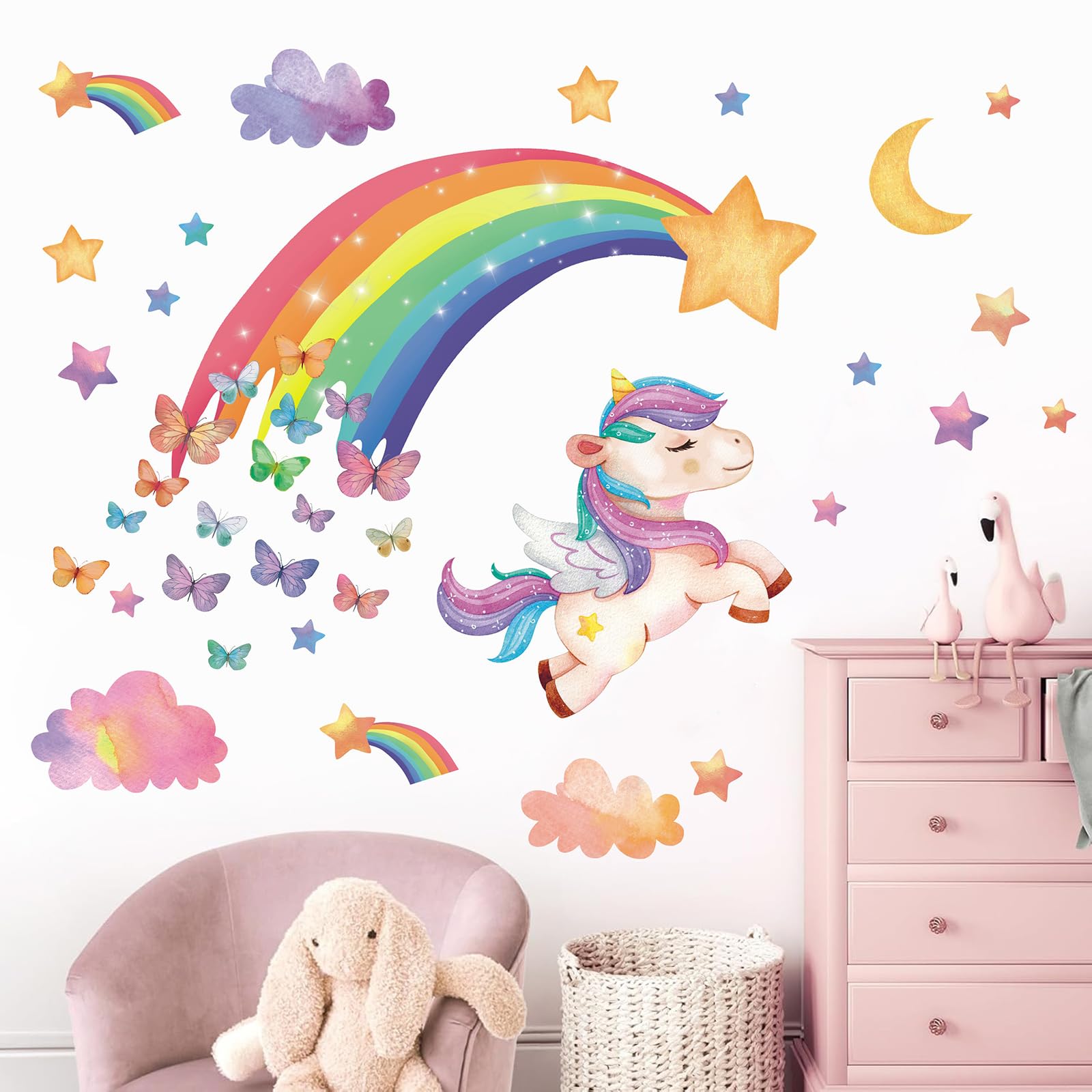 TOARTI Wandtattoo Mädchen Regenbogen Einhorn Wandaufkleber Schmetterlinge Wolken Wandsticker Babyzimmer Kinderzimmer Mädchen Schlafzimmer Wanddeko