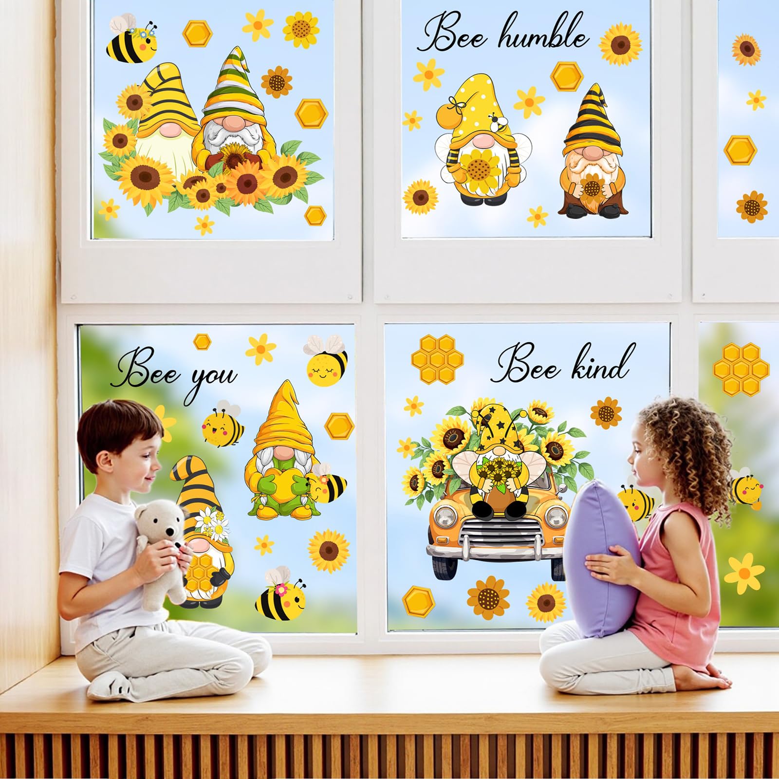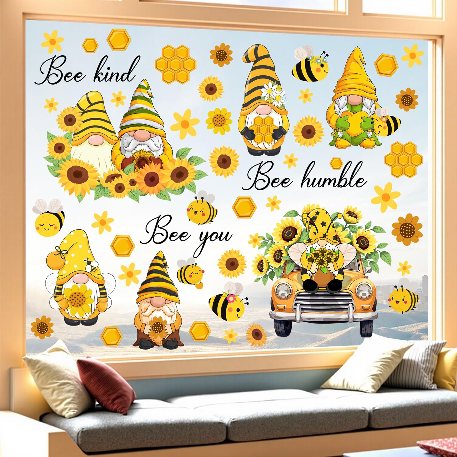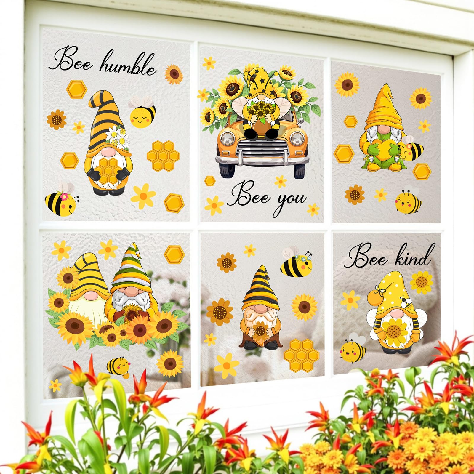 TOARTI Wandtattoos Gelb Bienen Fenster Dekoration Blumen,Biene Gnom Aufkleber,Fensterbilder Frühling Blumen,Fensteraufkleber Biene für Kinderzimmer Wohnzimmer
