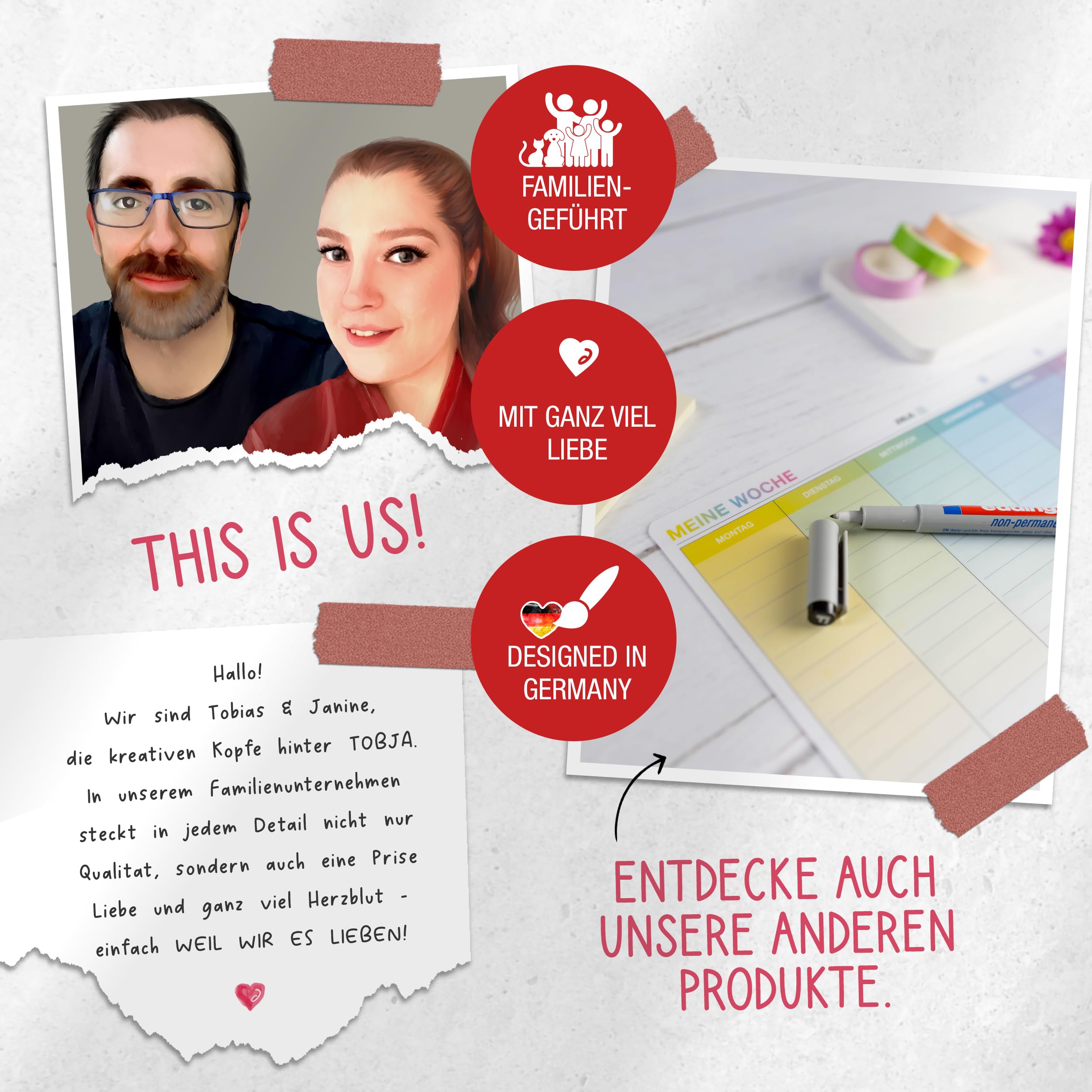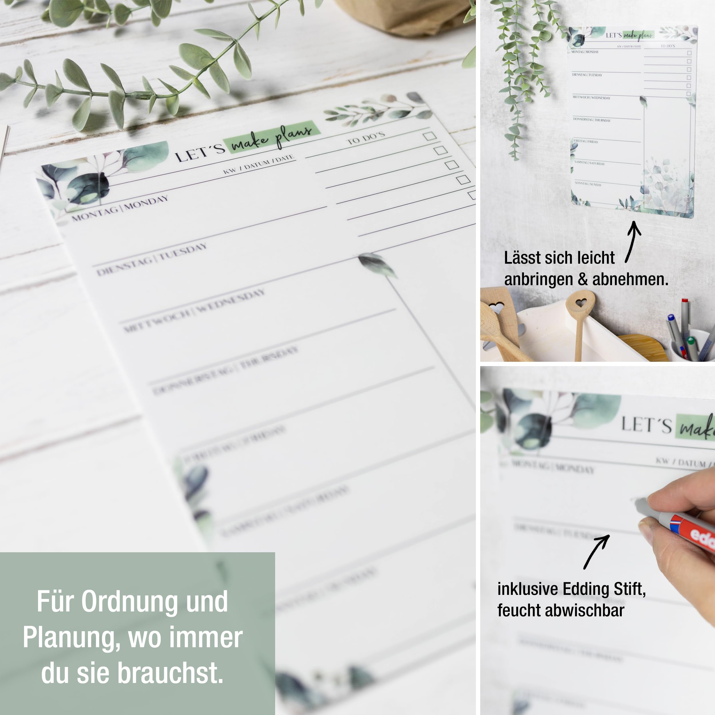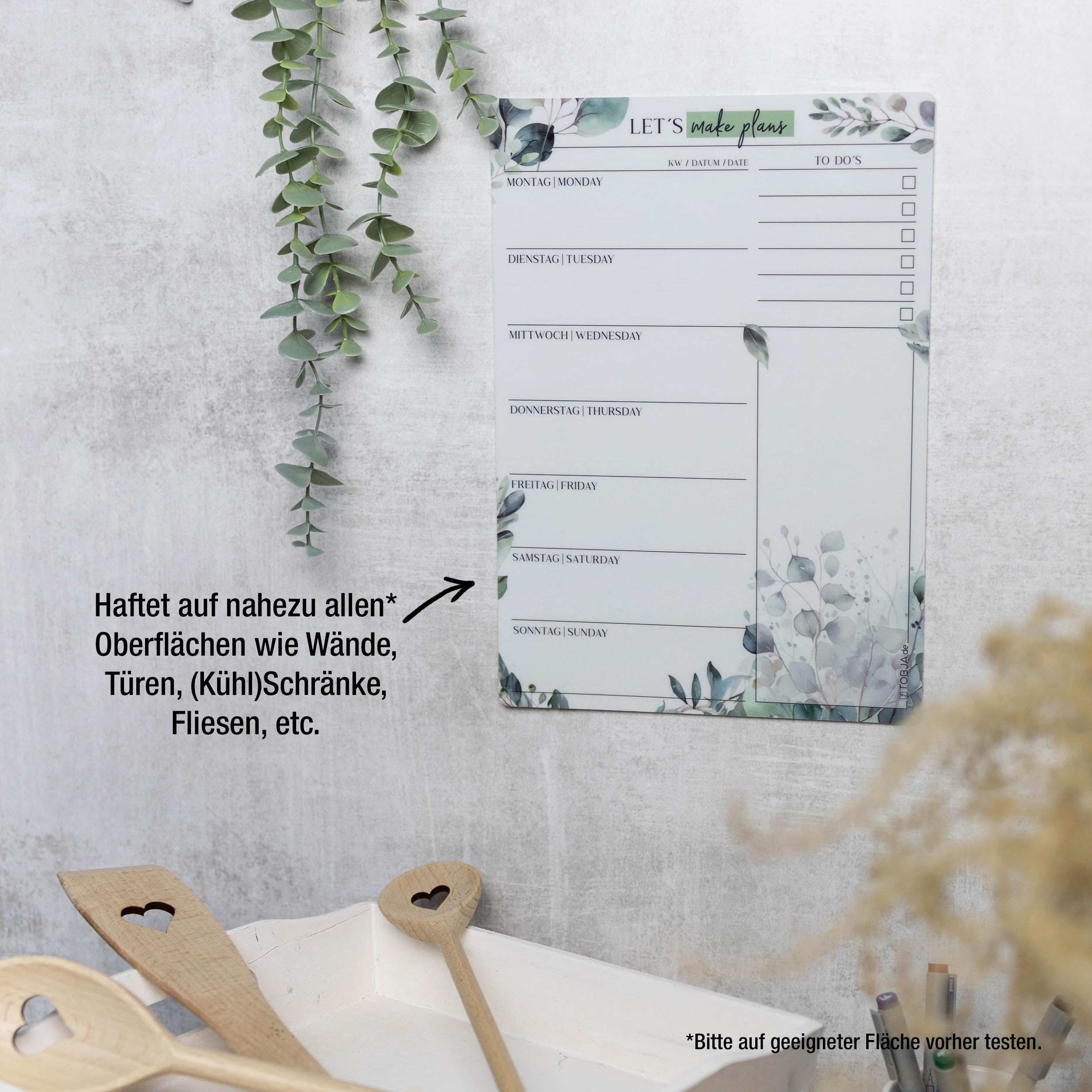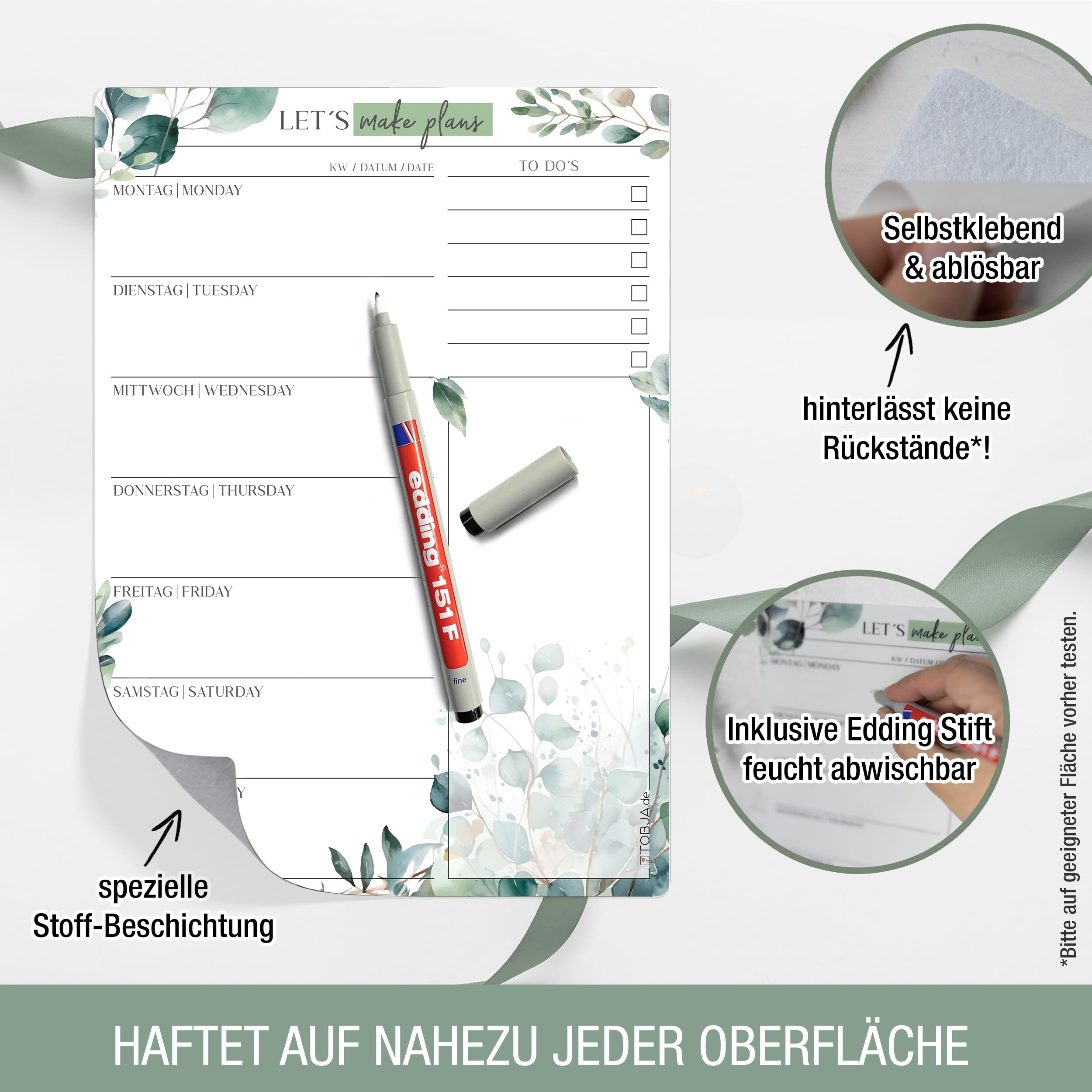Mit dem TOBJA Essensplaner Woche abwischbar behältst du spielend leicht den Überblick über deine Mahlzeiten. Ob als klassischer Wochenplaner, praktischer Meal Planner für die ganze Familie oder strukturierter Menüplaner für deine Fitnessziele – dieser Planer bringt Ordnung in deine Küche.Dank der starken Haftung ohne Magnet kannst du den wiederverwendbaren Speiseplan auf nahezu jeder glatten Oberfläche anbringen: Kühlschrank, Küchenschrank, Fliesen oder Türen – alles ist möglich. Der abwaschbare Wochenplan ist wieder ablösbar und lässt sich beliebig oft neu positionieren. Ideal für alle, die flexibel und nachhaltig planen möchten.Im Lieferumfang enthalten ist ein hochwertiger, wasserlöslicher Markenstift, der sich feucht abwischen lässt und deutlich langlebiger ist als herkömmliche Whiteboard-Stifte. So kannst du deinen Essensplan Woche für Woche anpassen – ohne Papierchaos oder Zettelwirtschaft.Der TOBJA Menüplaner im Format DIN A4 wurde mit viel Liebe in unserem kleinen Familienunternehmen in NRW gestaltet. Jedes Motiv wird mit Sorgfalt entwickelt – für mehr Freude am Planen, Organisieren und Kochen.✔️ Essensplaner abwischbar