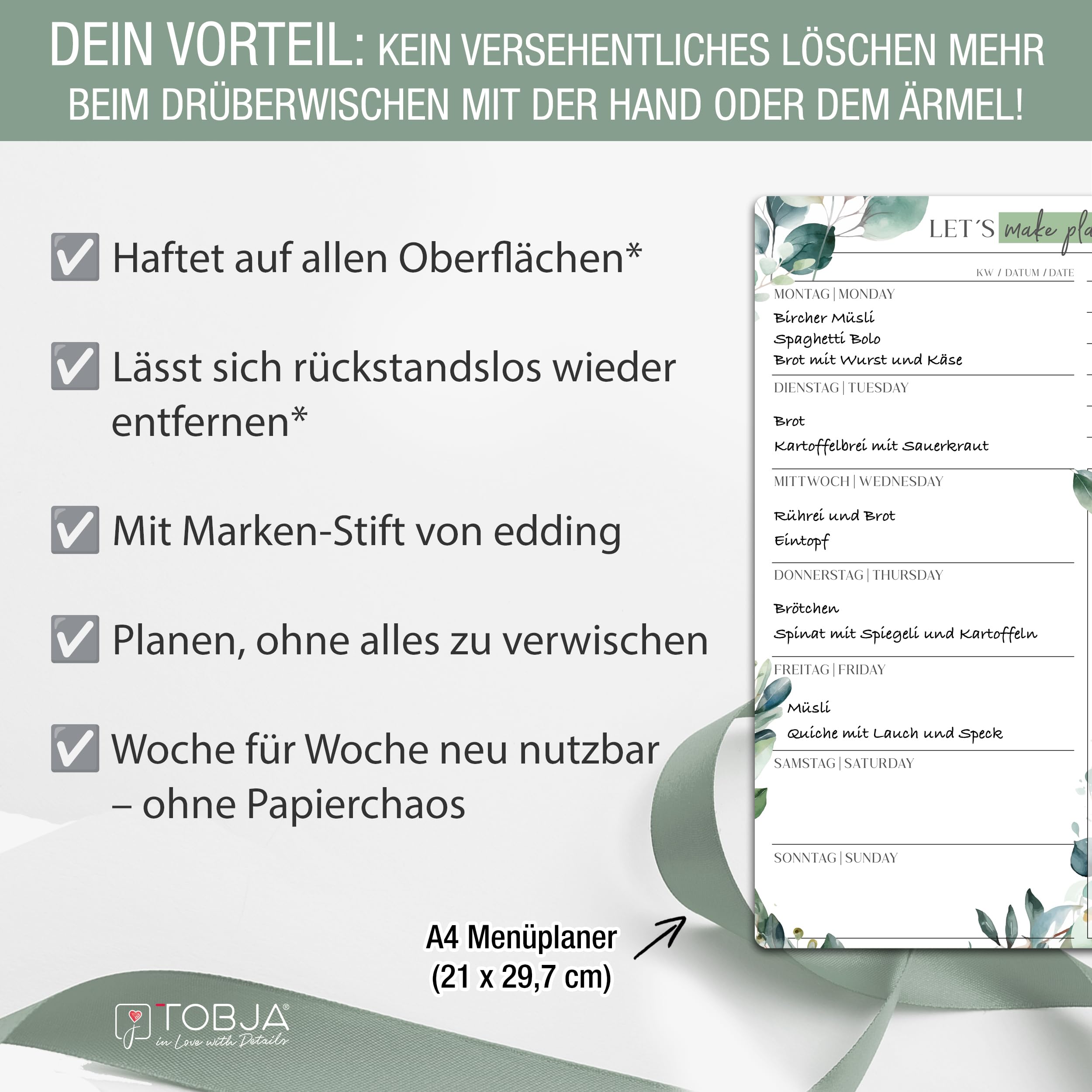 TOBJA Essensplaner Woche abwischbar inkl. Markenstift | Haftet auf allen Oberflächen, wieder ablösbar | Wiederverwendbarer Menüplaner, Speiseplan, Meal Planner (inkl. Markenstift)
