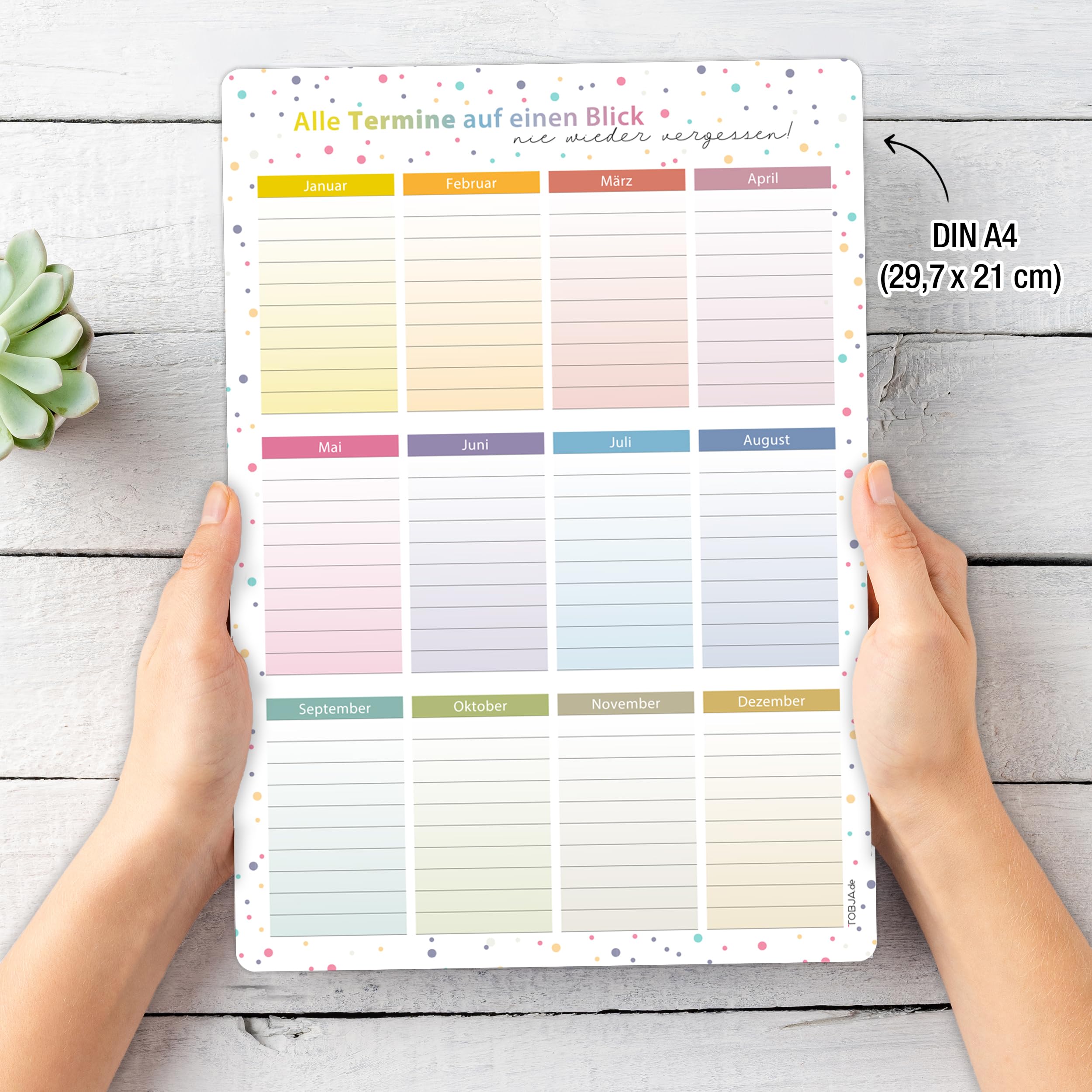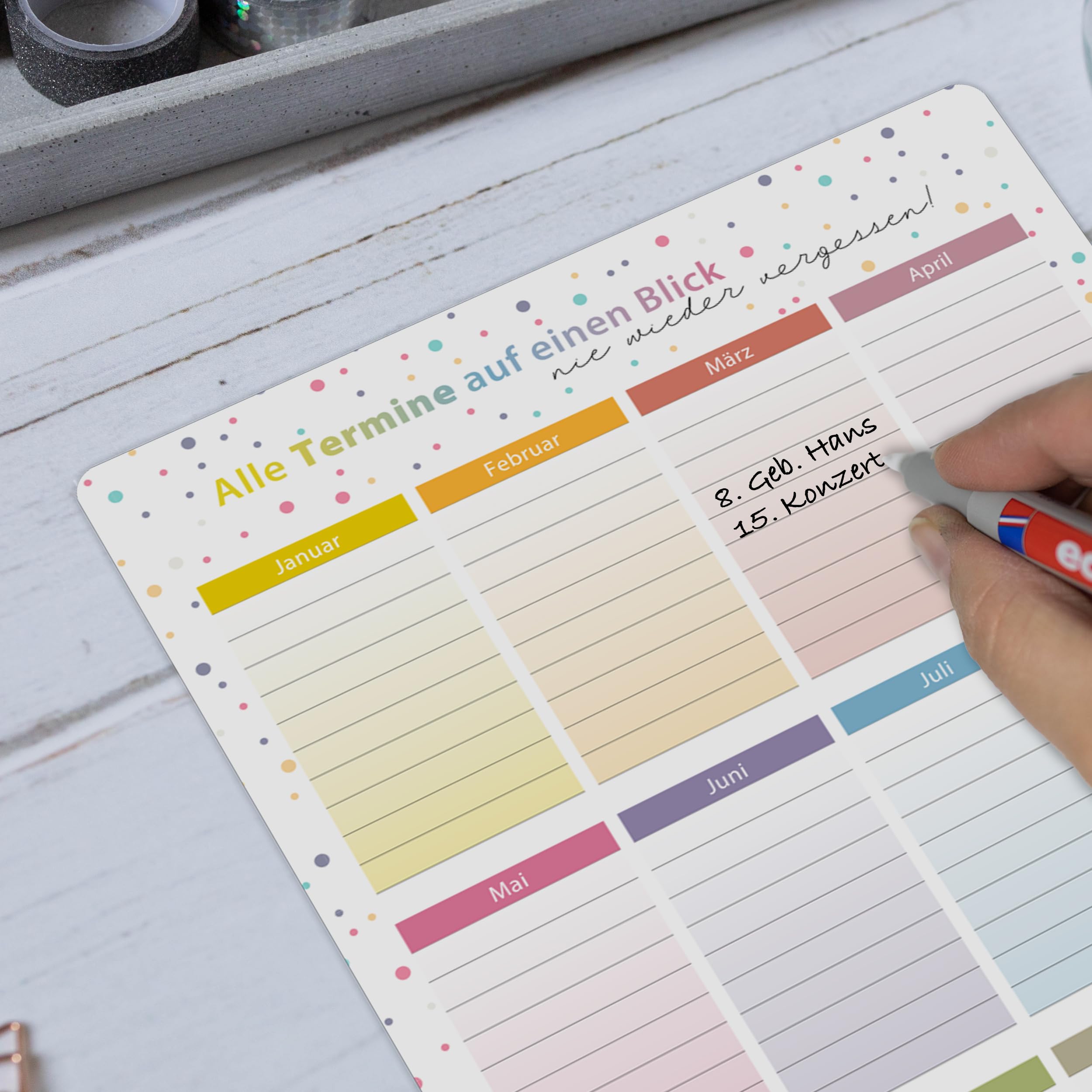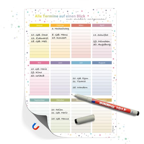 Organisieren Sie Ihre wichtigen Termine stilvoll und effizient mit unserem immerwährenden Geburtstagskalender A4.Dieses praktische Organisationstalent ist jahresunabhängig und bietet genug Platz, um Geburtstage, Jubiläen oder andere Meilensteine übersichtlich festzuhalten. Dank seiner magnetischen Rückseite haftet der Kalender sicher an Kühlschränken oder anderen Metallflächen – immer in Sichtweite für die ganze Familie.Das farbenfrohe Dots-Design macht den Kalender nicht nur funktional, sondern auch zu einem dekorativen Highlight in jedem Haushalt. Flexibilität steht dabei an erster Stelle: Der Kalender ist abwischbar und wiederverwendbar.Nutzen Sie jeden Whiteboard-Marker oder einen feuchten Stift, um Termine schnell und einfach zu aktualisieren. Unser Geburtstagskalender ist in einer praktischen A4-Grösse erhältlich, ideal für jeden Haushalt.Ob als geburtstagskalender klein oder als dauerkalender – er passt sich Ihren Bedürfnissen an. Dieses Produkt ist nicht nur ein funktionaler Helfer, sondern auch ein Geschenk, das Freude bereitet.Wählen Sie zwischen der Variante mit oder ohne Stift und starten Sie direkt in eine besser organisierte Zukunft.