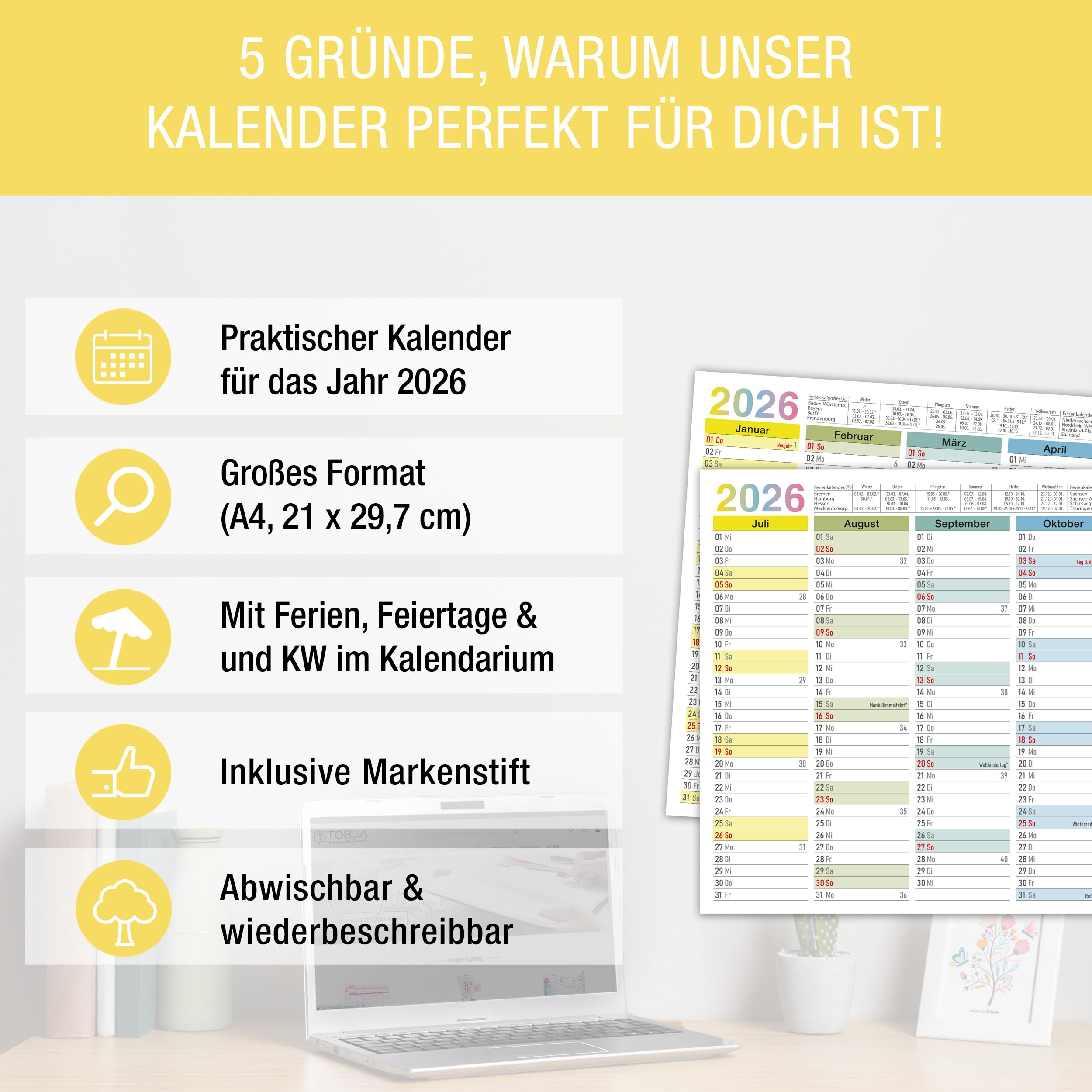 Der Kalender ist beidseitig bedruckt und deckt den Zeitraum von Januar bis Dezember 2026 ab, inklusive aller Schulferien und Feiertage, sodass du stets den Überblick behältst.Dieser praktische Jahresplaner 2026 A4 wird mit einem hochwertigen, wasserlöslichen Markenstift geliefert, der dir ermöglicht, Notizen einfach abzuwischen und den Kalender wieder zu beschreiben.