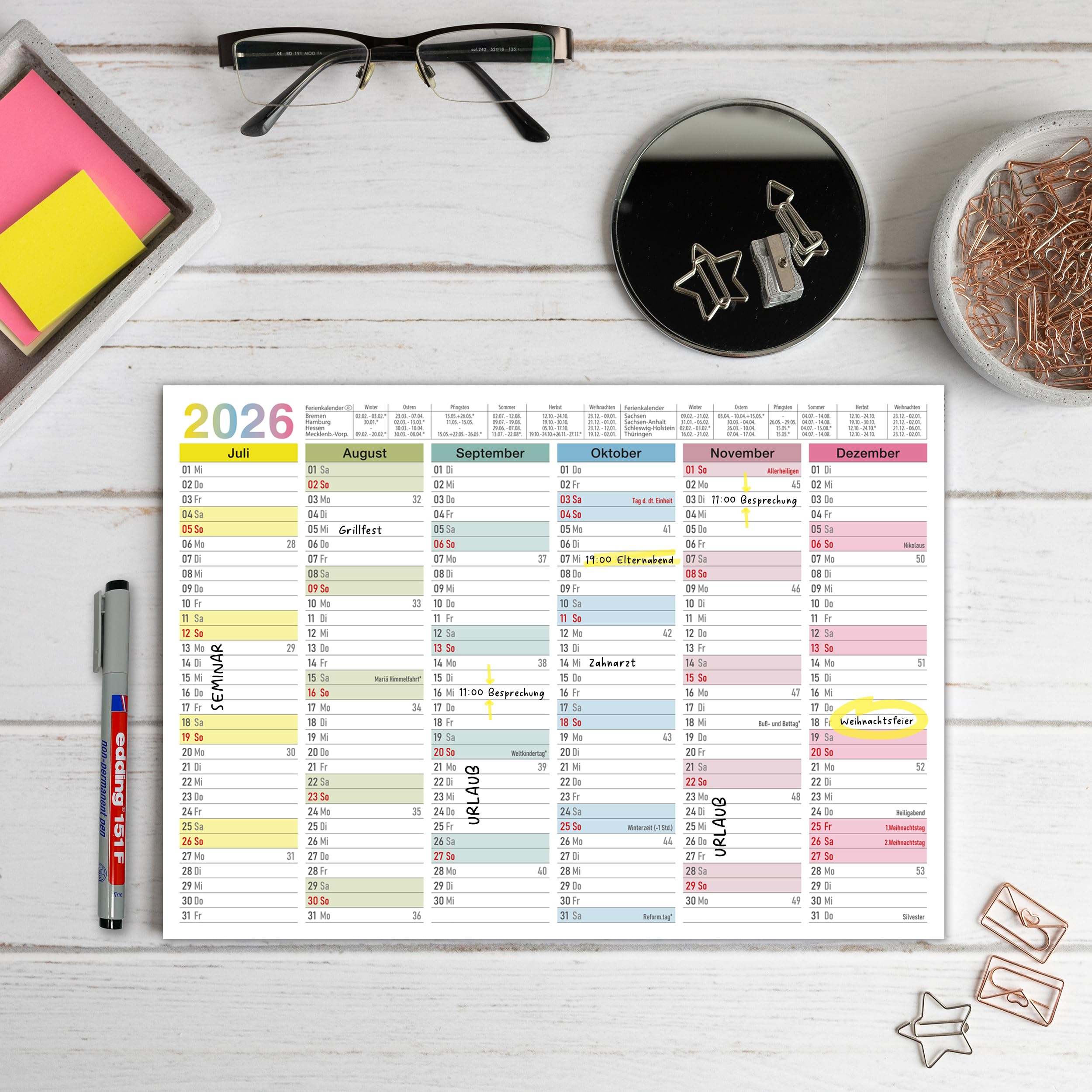 Ob als kleiner Wandkalender für die Küche oder als Kalender für den Schreibtisch im Büro – unser Jahreskalender 2026 passt sich flexibel deinen Bedürfnissen an.Der Kalender 2026 ist ideal für Familien, Berufstätige und alle, die ihre Zeit effektiv managen möchten.