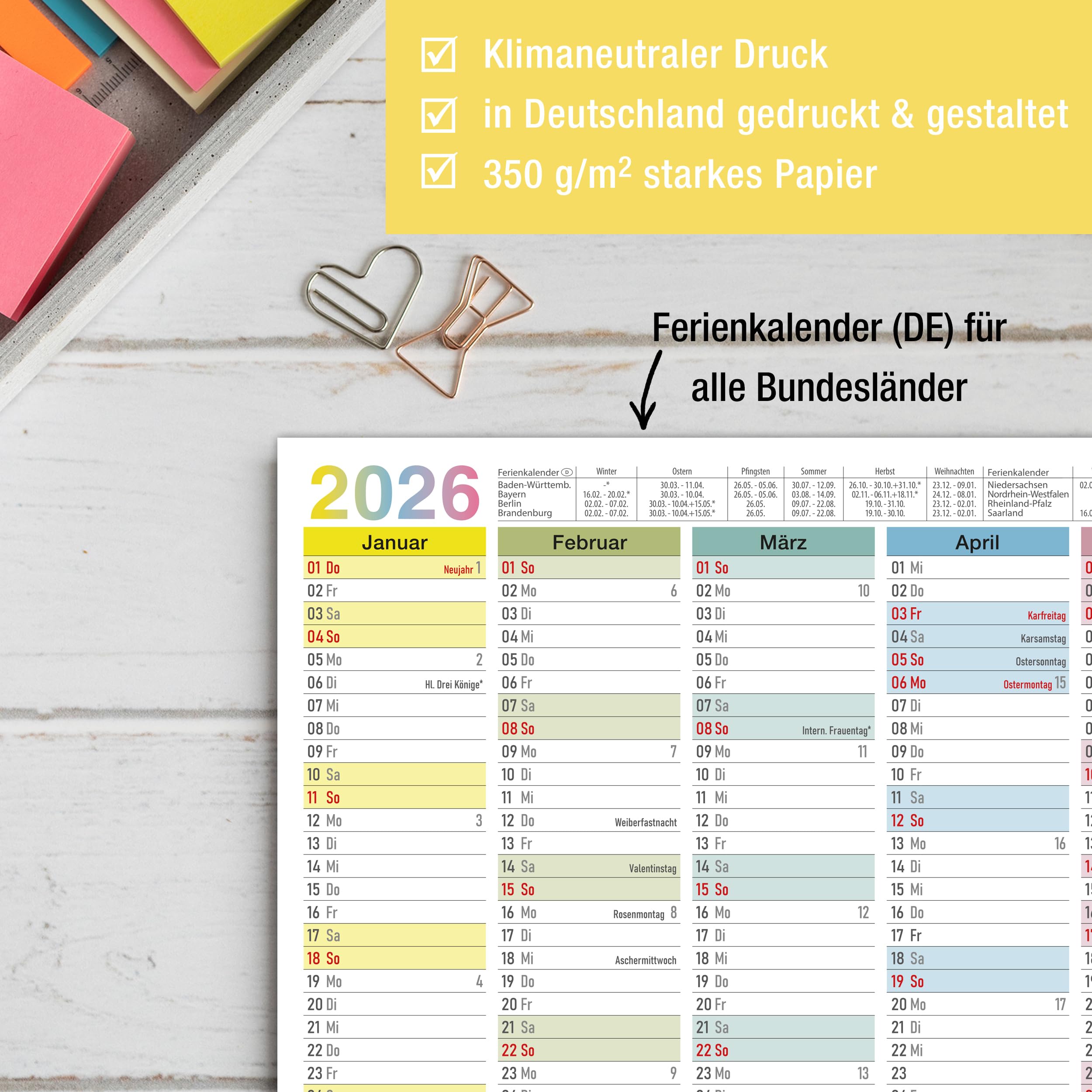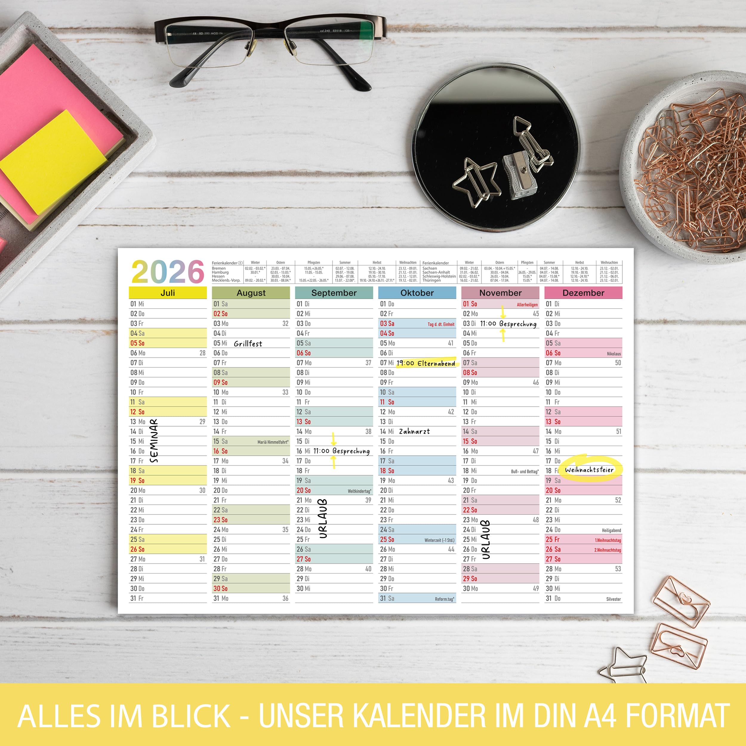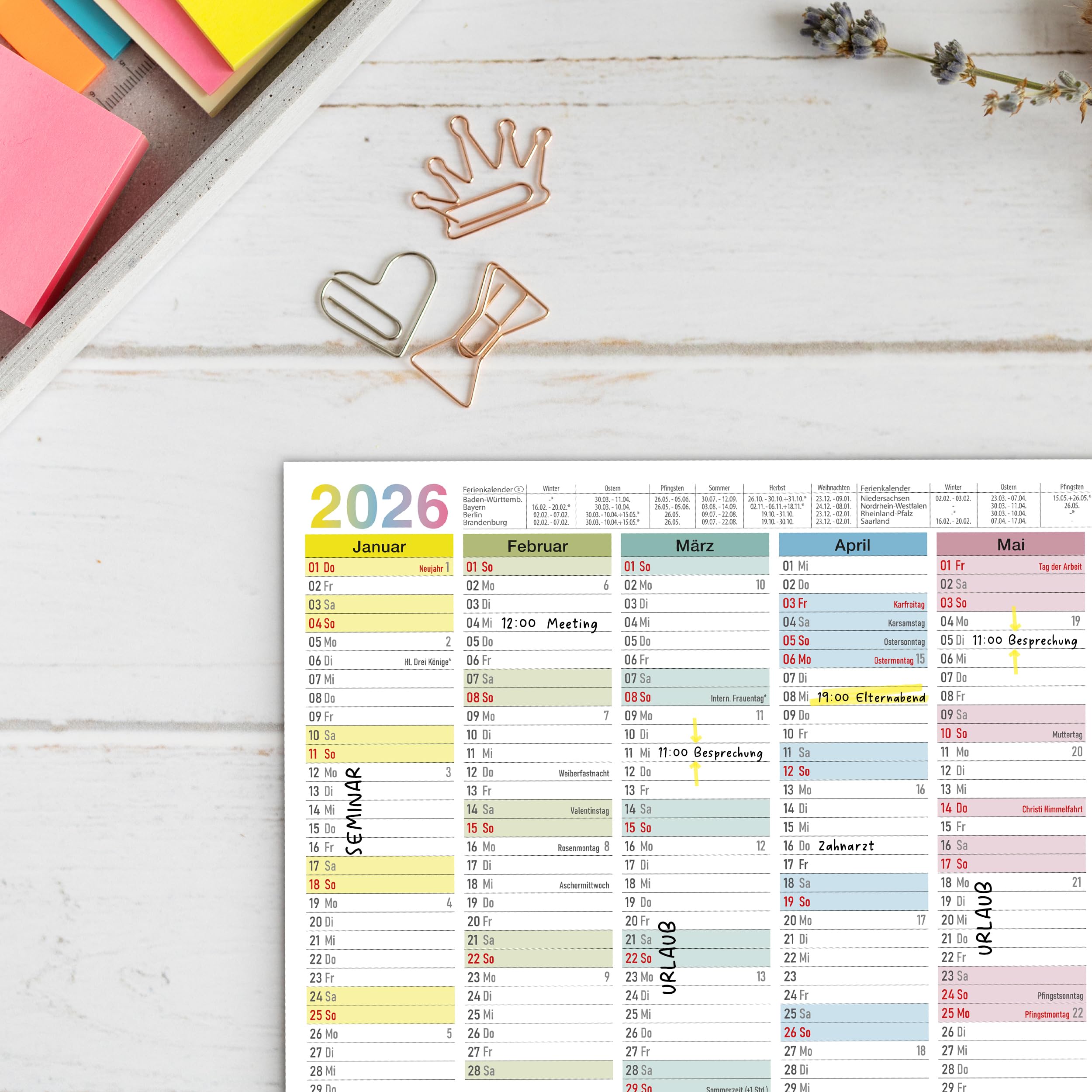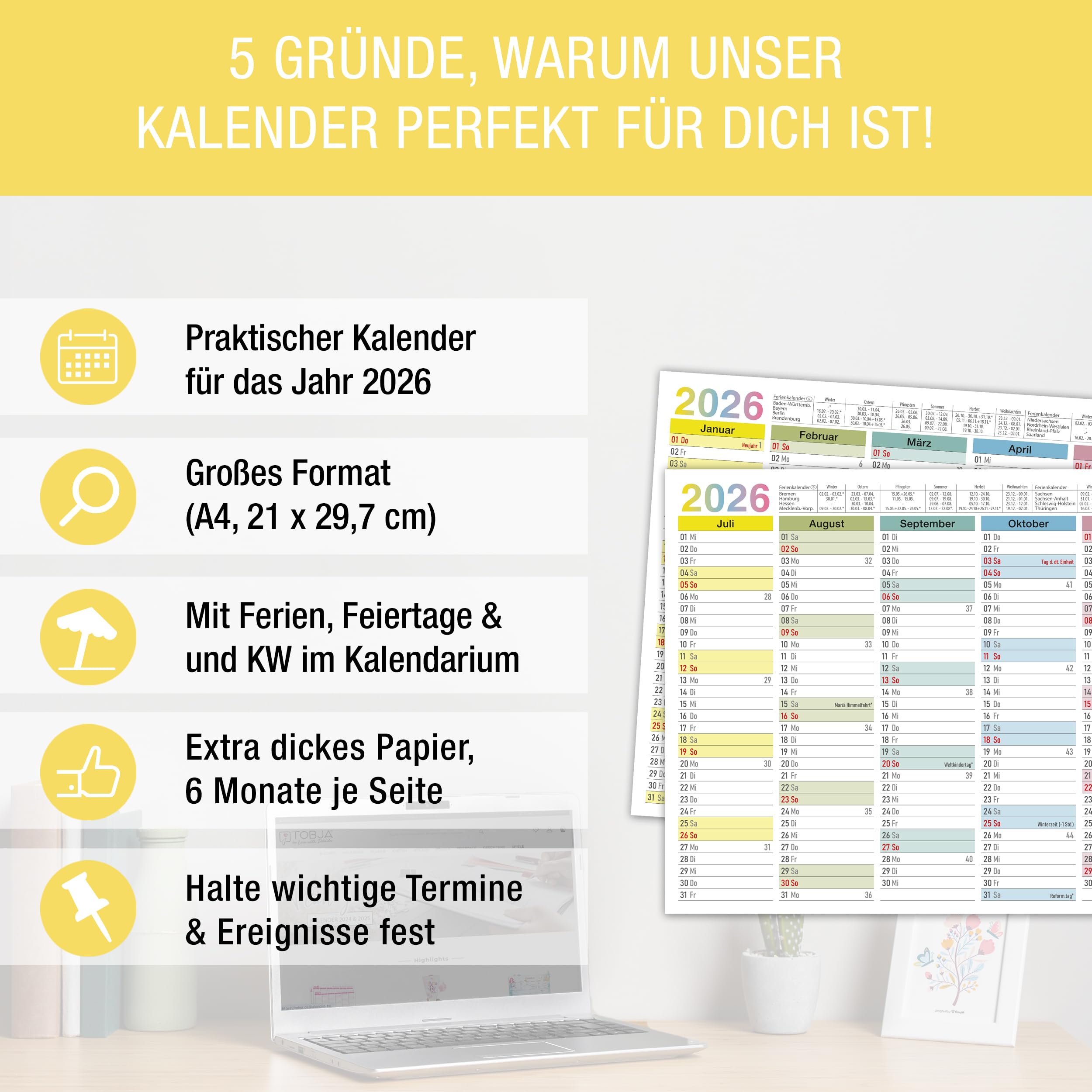 TOBJA Tafelkalender 2026 A4 - Kalender 2026 "Bunt" mit Ferien & Feiertagen | Wandkalender, Jahreskalender 2026 DIN A4 als Jahresplaner | Blattkalender 12 Monate Vorder- und Rückseite (3 Stück Papier)