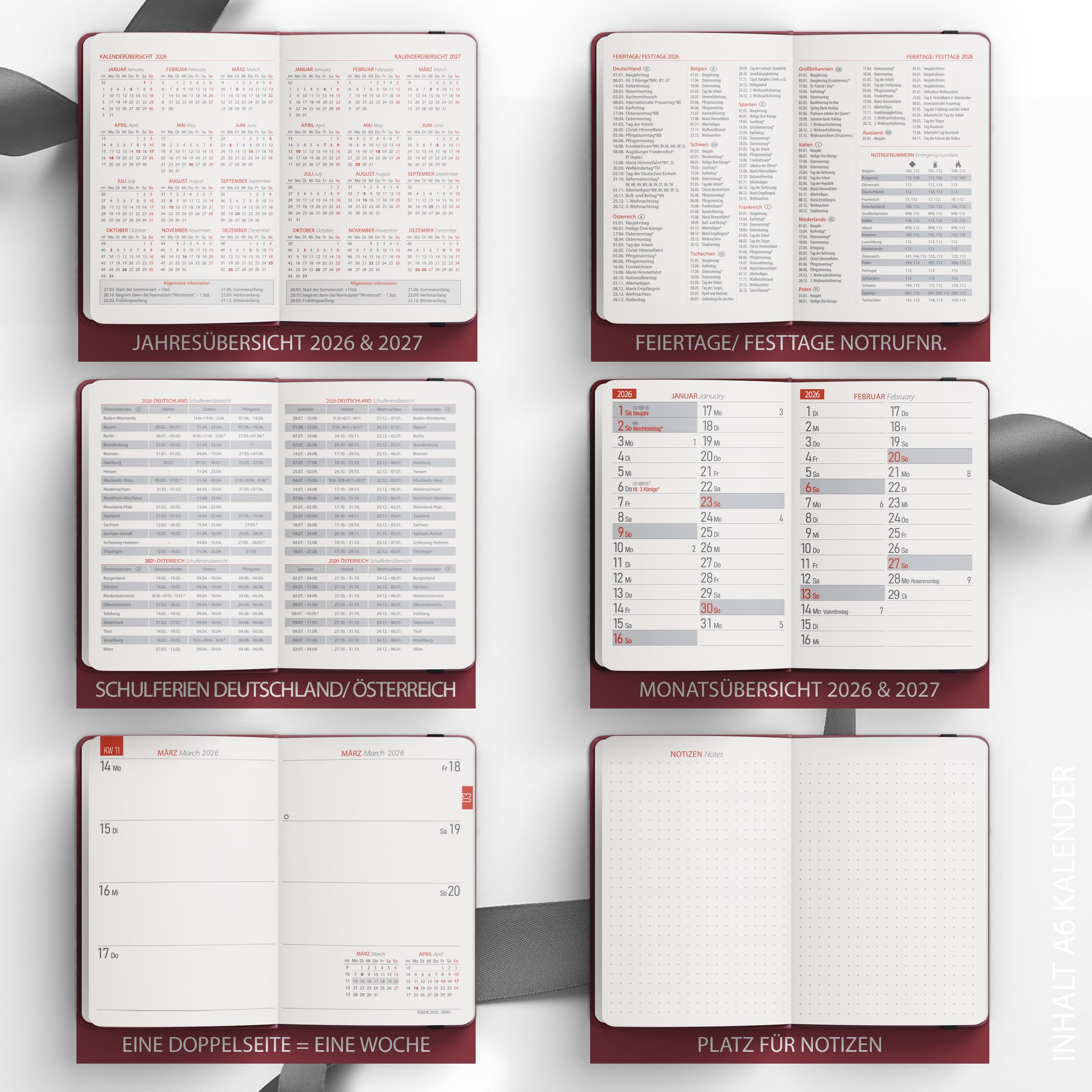 Der 2026 Taschenkalender A6 ist Ihr perfekter Begleiter, um Ihre Zeit optimal zu organisieren. Dieser rote DIN A6 Kalender 2026 bietet ein handliches Format von 10,5 x 14,8 cm, das mühelos in jede Tasche passt. Mit seinen 144 Seiten, abgerundeten Ecken und einem robusten Hardcover ist er sowohl praktisch als auch langlebig.Unser Buchkalender 2026 zeigt eine Woche auf zwei Seiten, was Ihre Planung übersichtlich und effizient macht. Der Jahreskalender 2026 A6 enthält alle wichtigen Ferien und Feiertage sowie eine nützliche Kalendervorschau für 2026, sodass Sie immer bestens informiert sind.Zwei Lesebändchen und ein elastischer Gummibandverschluss sorgen dafür, dass Sie Ihre wichtigsten Termine und Notizen schnell zur Hand haben. Der Kalender 2026 ist klein, aber fein, und speziell für diejenigen gemacht, die einen funktionalen und stilvollen Planer suchen.Ob als kleiner Kalender 2026 für unterwegs oder als Planer 2026 A6 für den Schreibtisch - unser Taschenkalender bietet alles, was Sie für Ihre tägliche Organisation benötigen. Vertrauen Sie auf die Qualität und das durchdachte Design eines Familienunternehmens aus NRW, das jedes Detail mit besonderer Sorgfalt gestaltet.