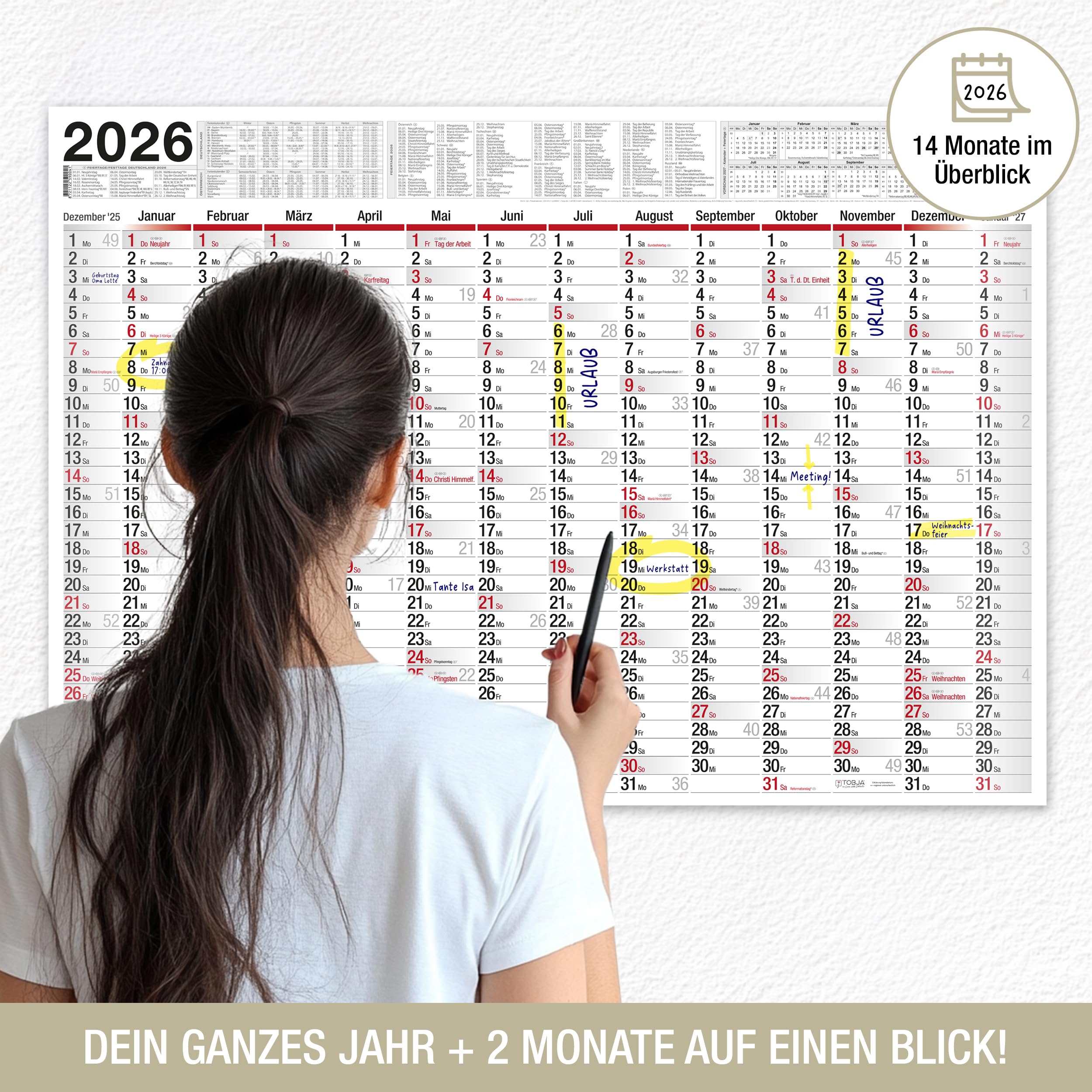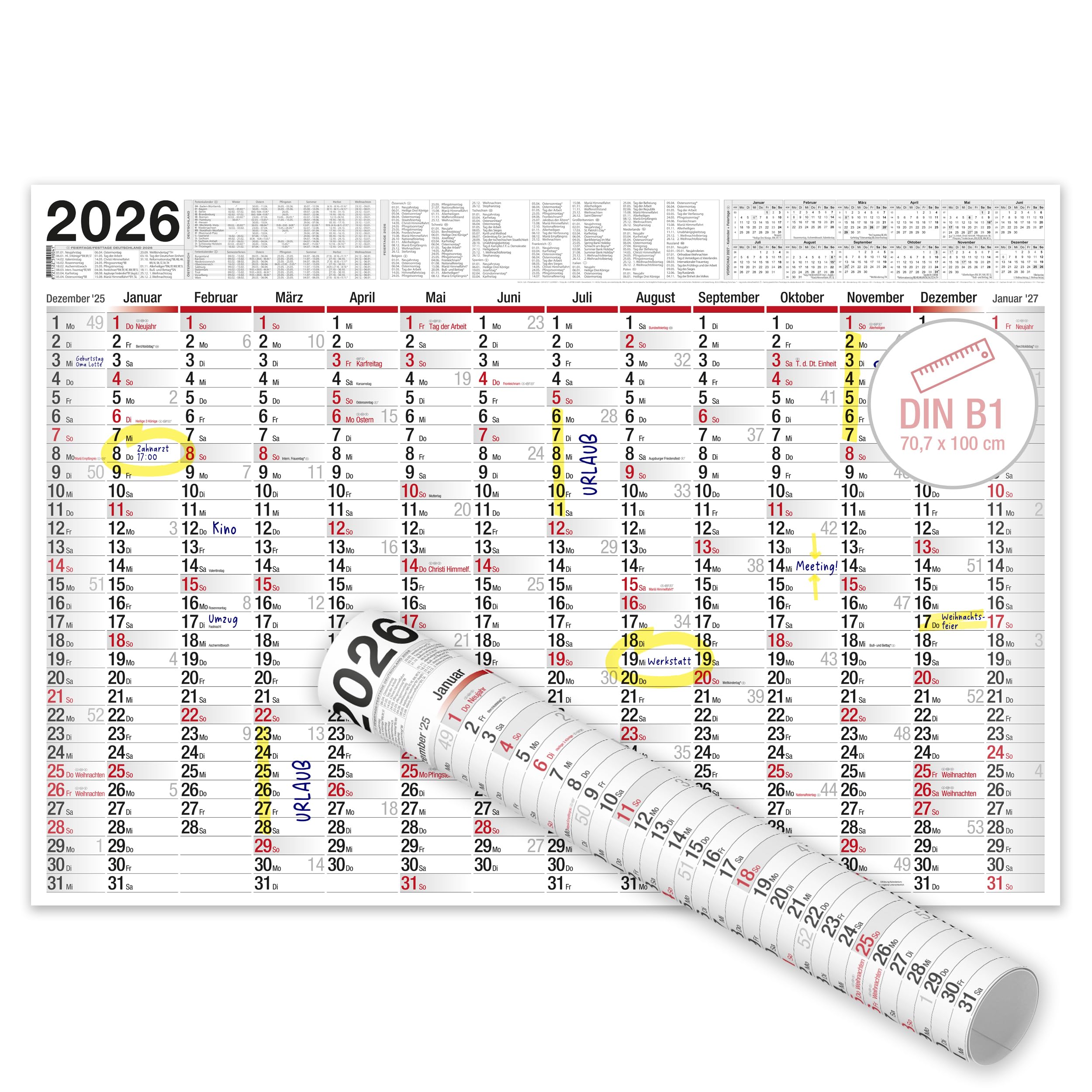 TOBJA Wandkalender 2026 gross mit Feiertagen und Ferien DE, AT | Jahresplaner 2026 100x70 cm | XXL Wandkalender 2026 gerollt oder gefalzt | Hochwertiger Kalender [1 Stück gerollt]
