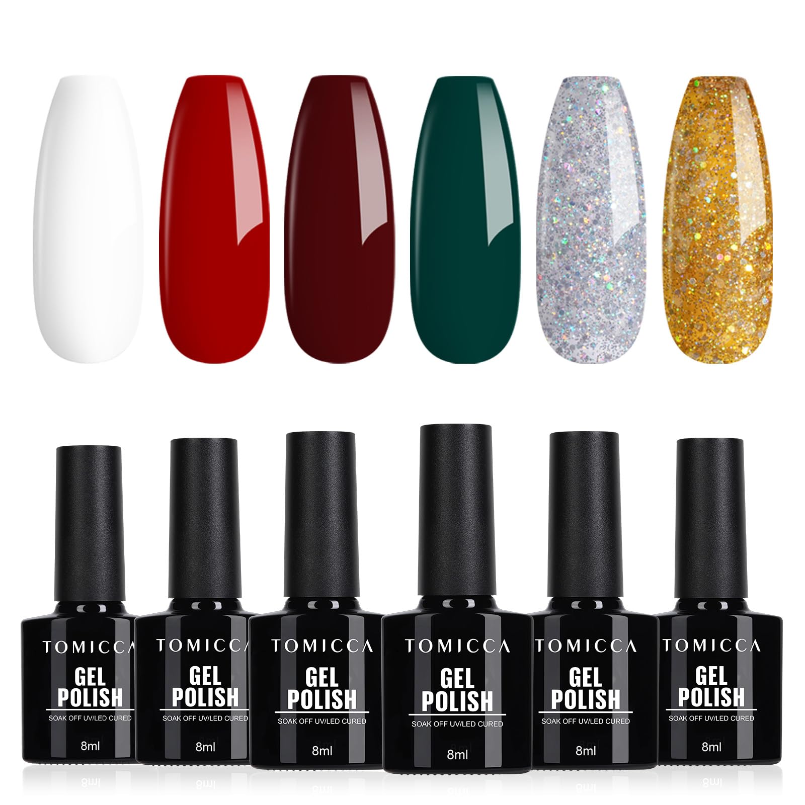 • Festliche Weihnachtsfarben mit Spiegelglanz Das TOMICCA UV Gel Nagellack Set enthaelt 6 beliebte Weihnachtsfarben in Rot, Gruen und Weiss mit Glitzer-Finish fuer elegante, festliche und kreative Nail Art Designs.