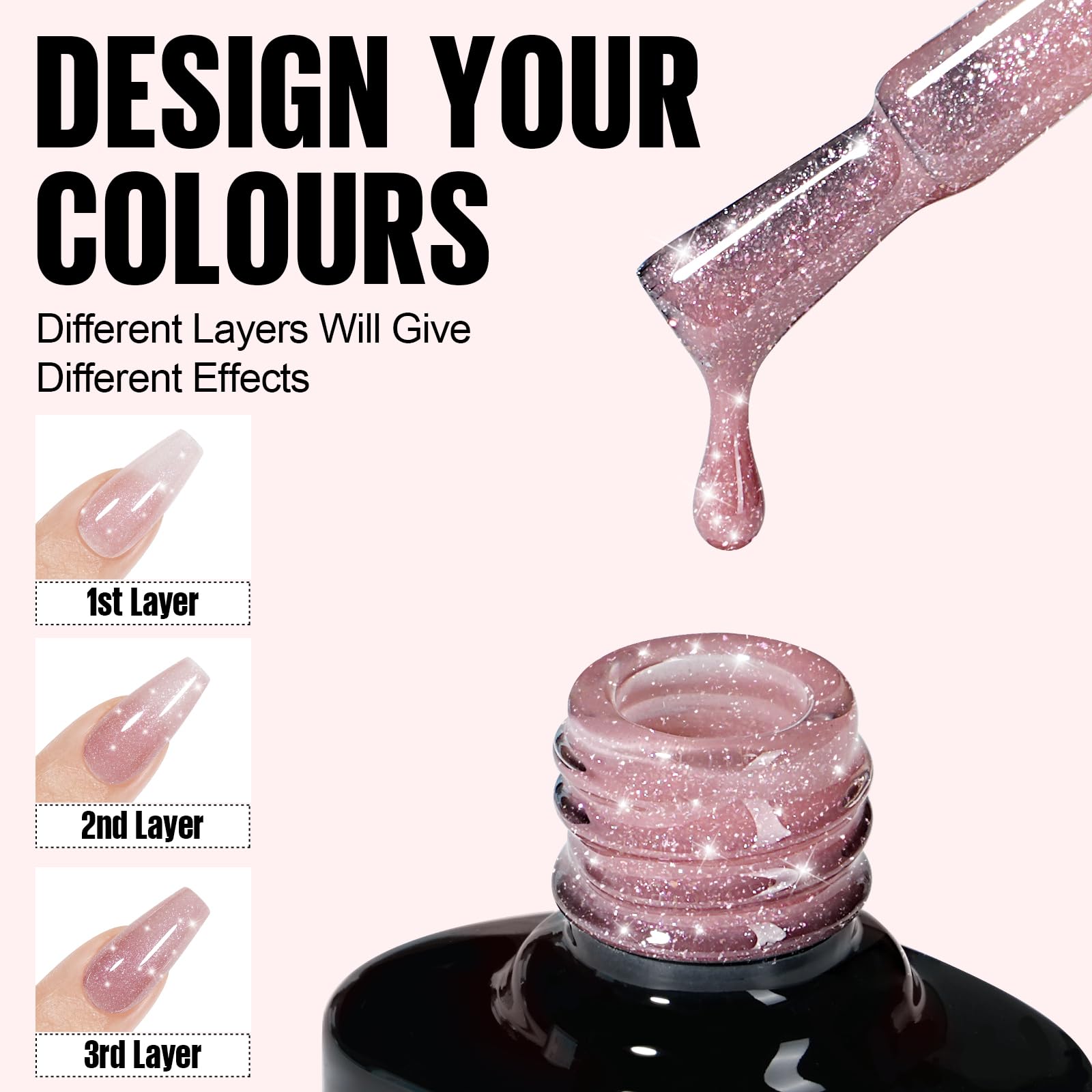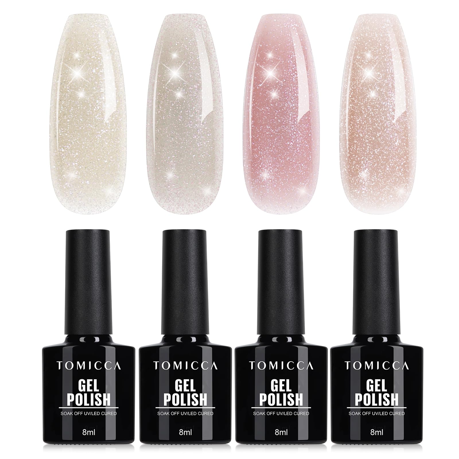 • Transparente Nude- und Rosa-Farben mit Glitter-Effekt Das TOMICCA Glitter Gel Nagellack Set enthaelt 4 elegante Farben in Rosa, Beige und Nude mit feinem Glitzer und Kirschblueten-Gelee-Look, ideal fuer natuerliche und stilvolle Manikueren.