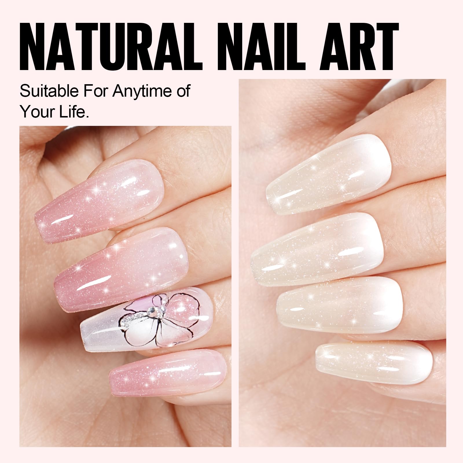 Die vier transparenten Glitzerfarben verleihen den Naegeln einen sanften Kirschblueten-Jelly-Effekt. Das Finish wirkt klar, modern und unaufdringlich und unterstreicht die natuerliche Nagelfarbe. Besonders geeignet fuer minimalistische Nail Art oder dezente Alltagslooks.