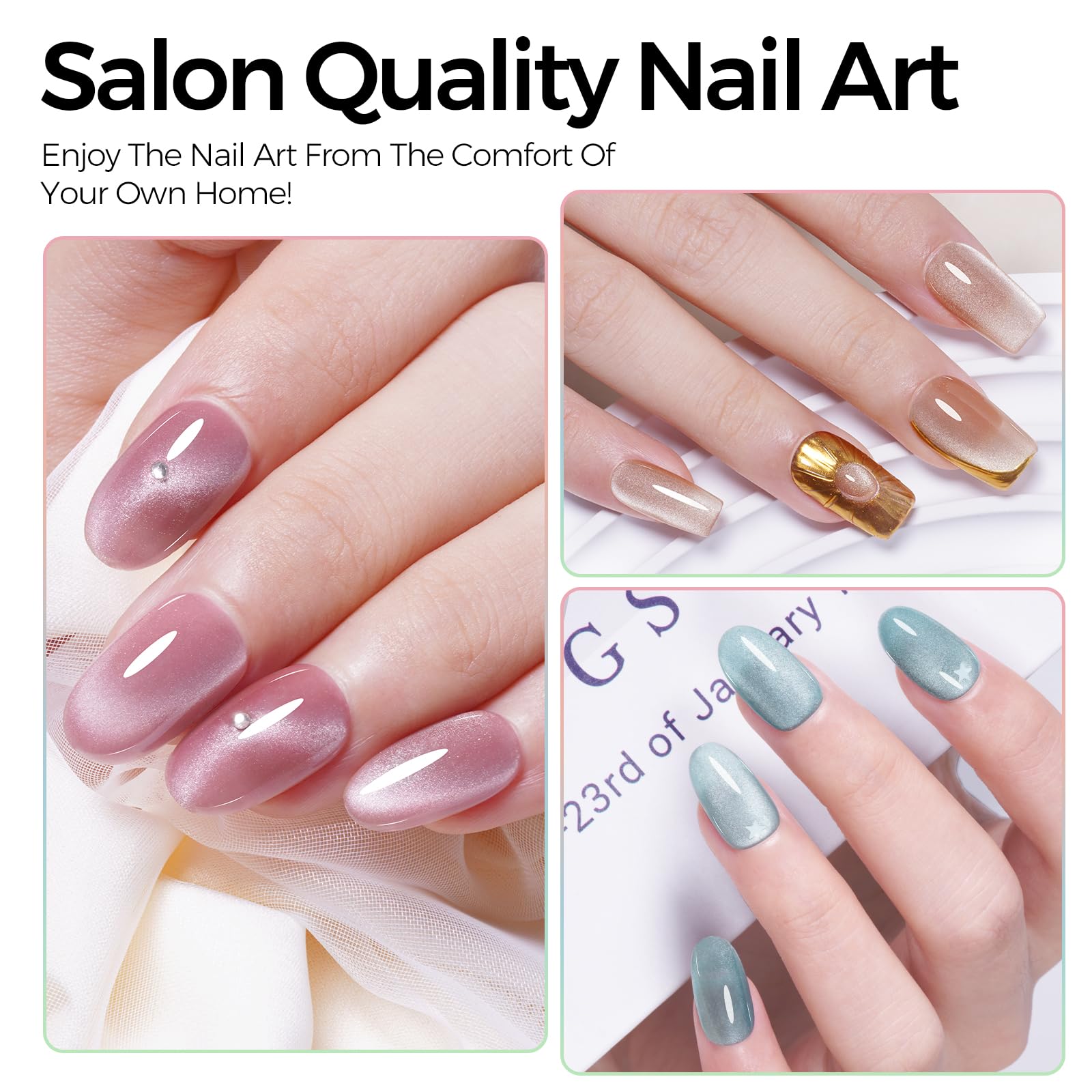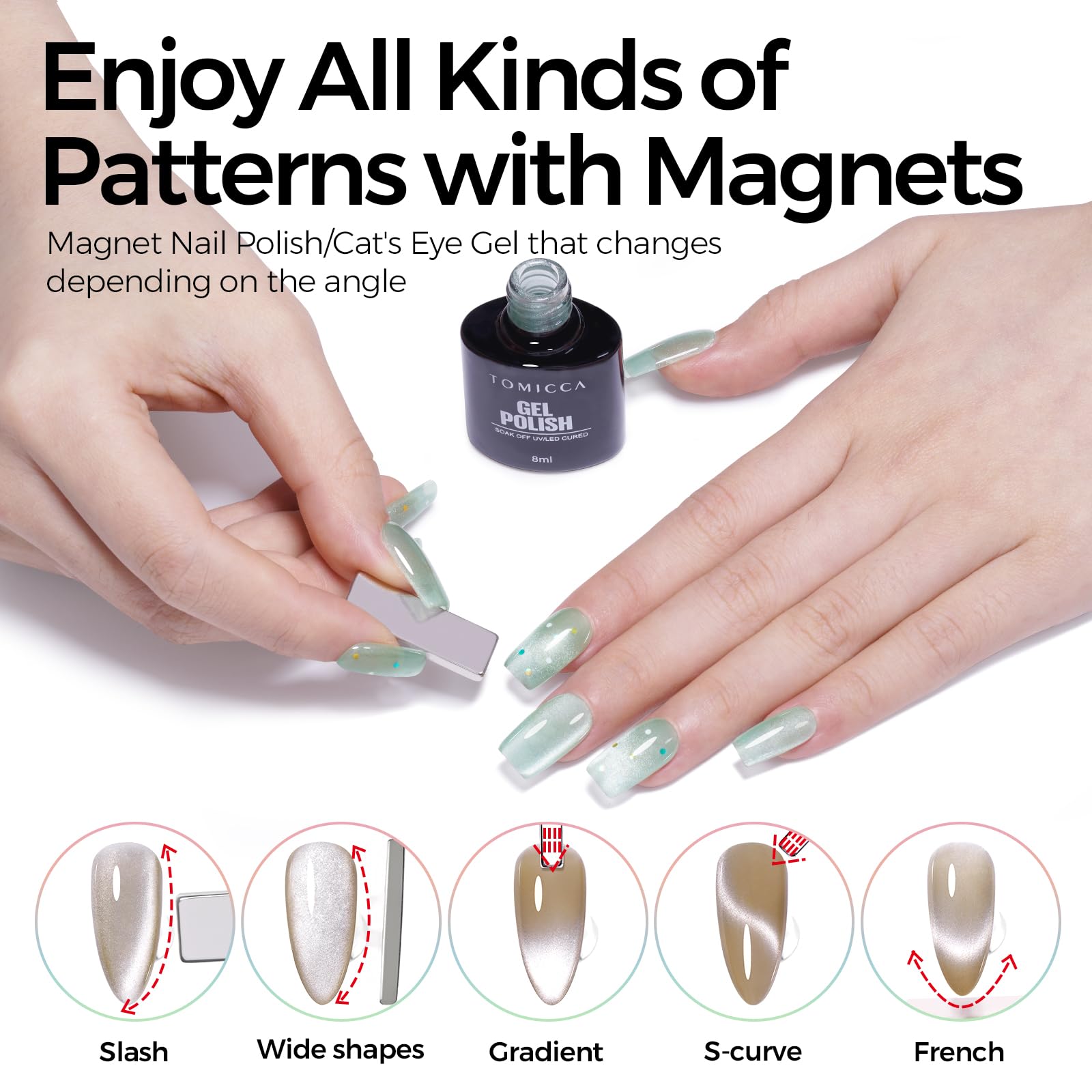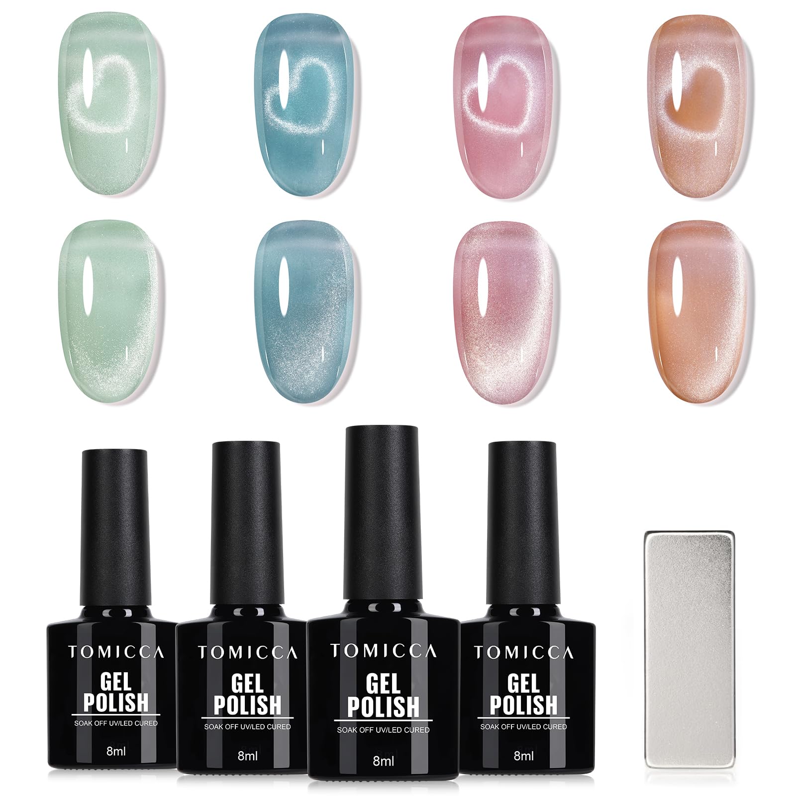 Das TOMICCA Cat Eyes UV Nagellack Set mit vier glaenzenden Farben in Rosa- und Gelbtoenen bietet funkelnde Cat-Eye-Effekte mit intensivem Spiegelglanz. Das Set eignet sich ideal fuer Anfaenger, DIY-Anwendungen zu Hause sowie fuer kreative Nail Art Manikueren im Nagelstudio.