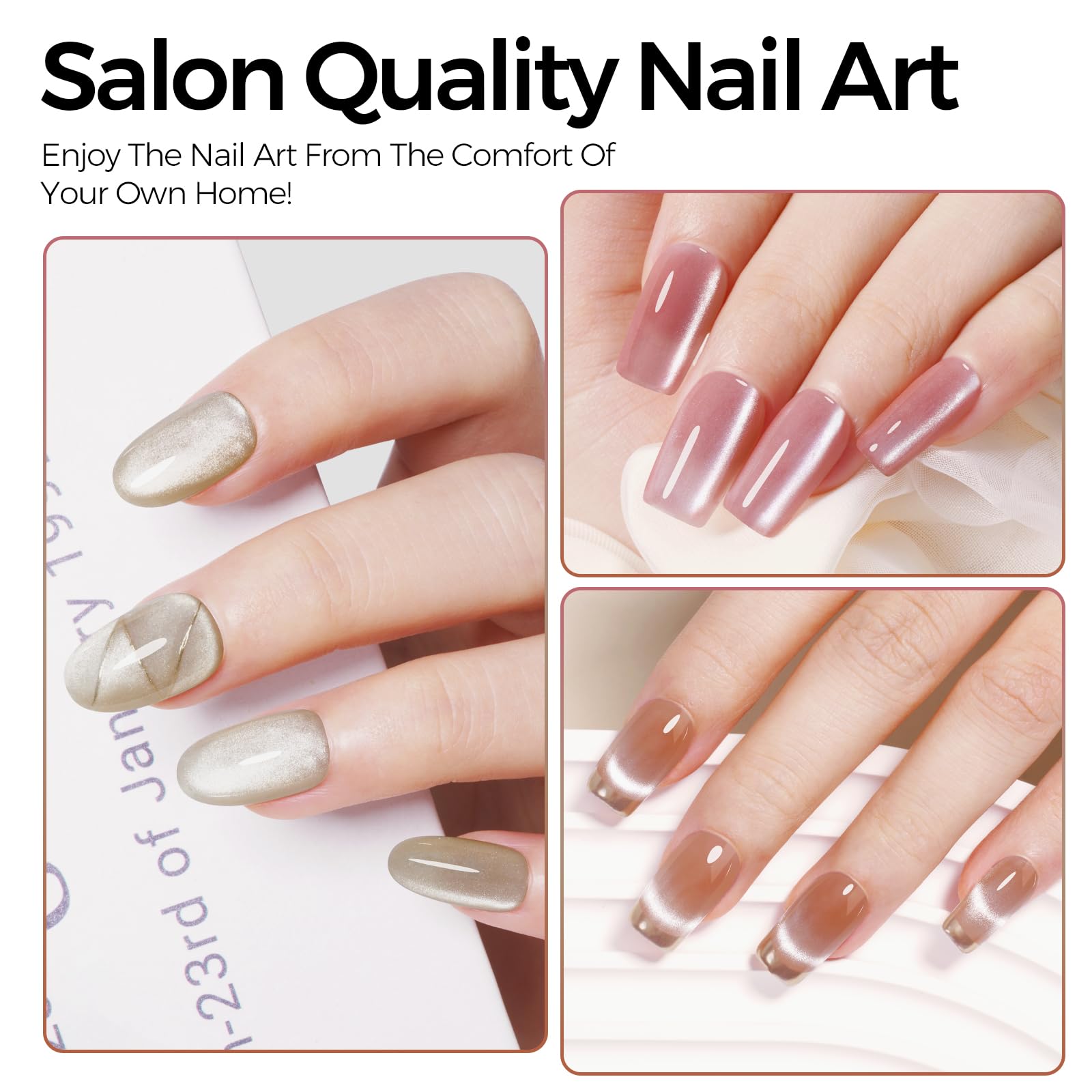 Das TOMICCA Cat Eyes UV Nagellack Set mit vier dezenten Farben in Nude, Rosa und Silber bietet elegante Cat-Eye-Effekte mit feinem Glitzerfinish. Das Set eignet sich ideal fuer Anfaenger, DIY-Anwendungen zu Hause sowie fuer professionelle Nail Art Manikueren im Nagelstudio.