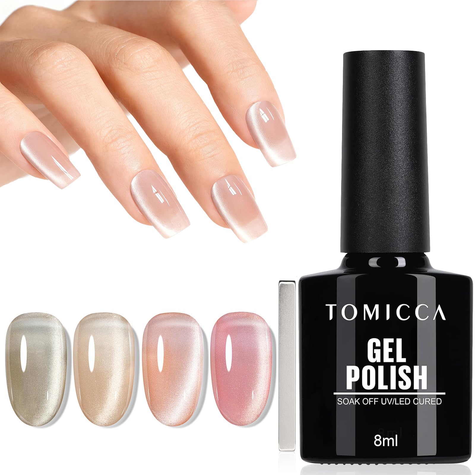 TOMICCA Cat Eye UV Nagellack Set mit Magnet, 4 Farben Nude Rosa Silber Glitzer, Gel Nagellack Soak Off UV/LED – 4 x 8 ml
