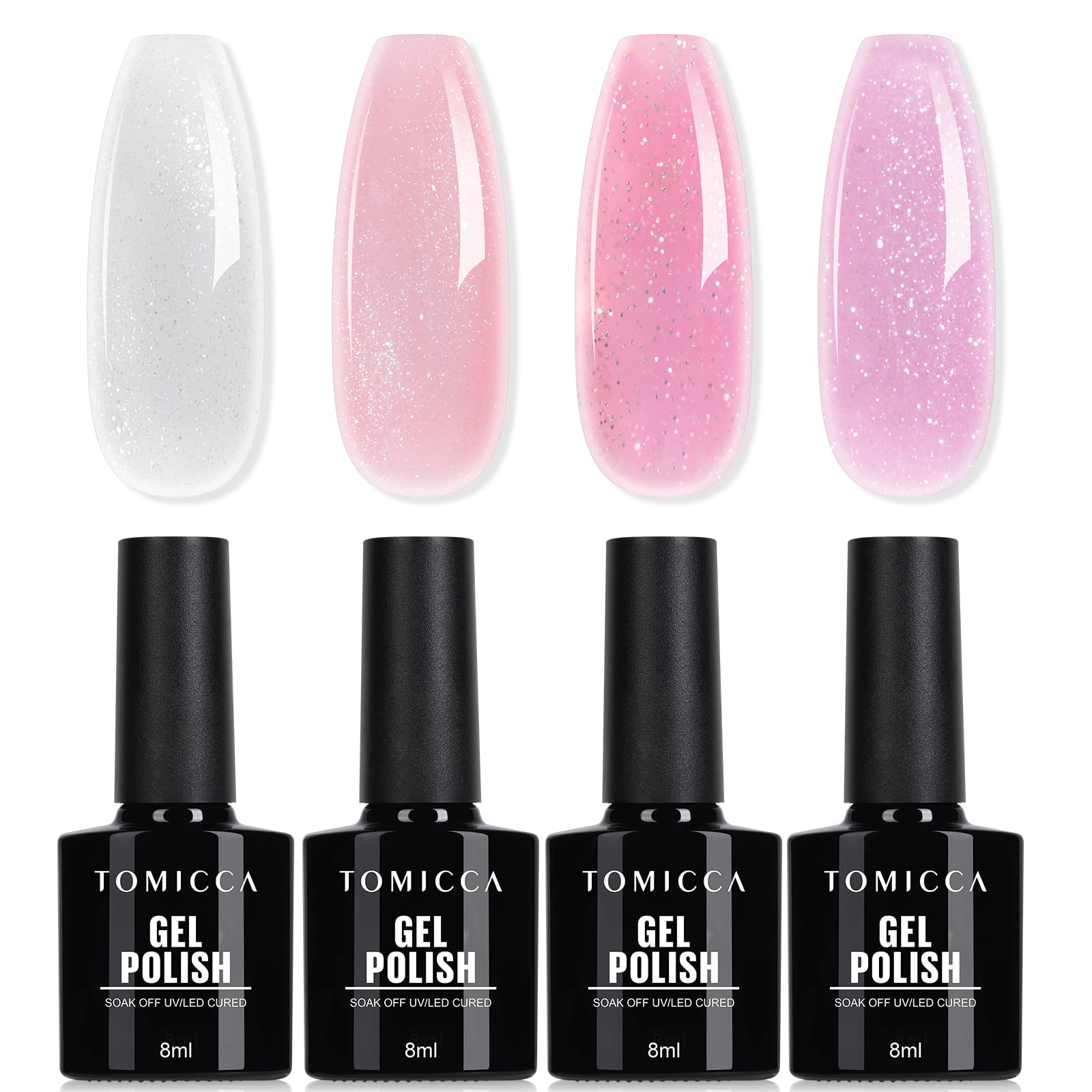 TOMICCA Semi-permanenter UV Nagellack Set, 4 Farben Transparent Rosa Weiss mit Pailletten, Soak Off UV/LED – 4 x 8 ml