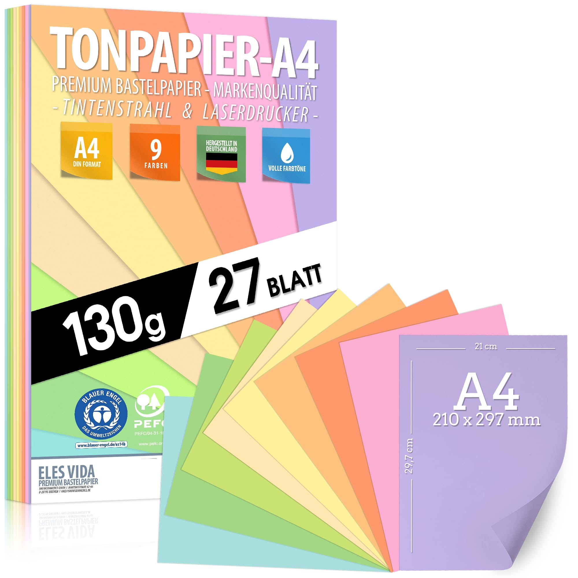 Pastell Tonzeichenpapier DIN A4-27 Blatt– 130 g - 9 Farben – Festes Papier - Farbige Blätter für Schule, Hobby - Kinder, Buntpapier Pastellfarben - BLAUER ENGEL & PEFC zertifiziert - MADE IN GERMANY