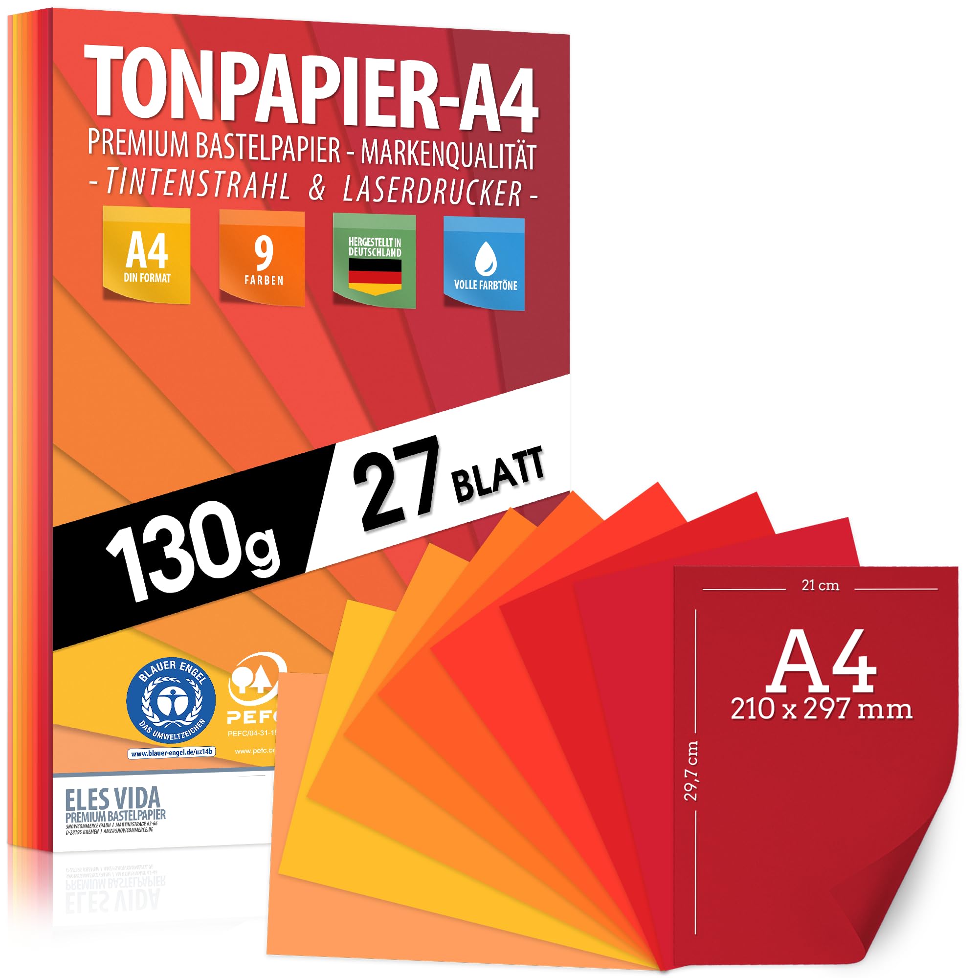 Tonpapier Rot Rubin Feuer Farben 27 Stück Purpur A4-130g Blätter – Bastel Bogen - Orange dicker als Tonkarton, Pappe zum Basteln, Zeichenkarton - BLAUER ENGEL & PEFC zertifiziert - MADE IN GERMANY