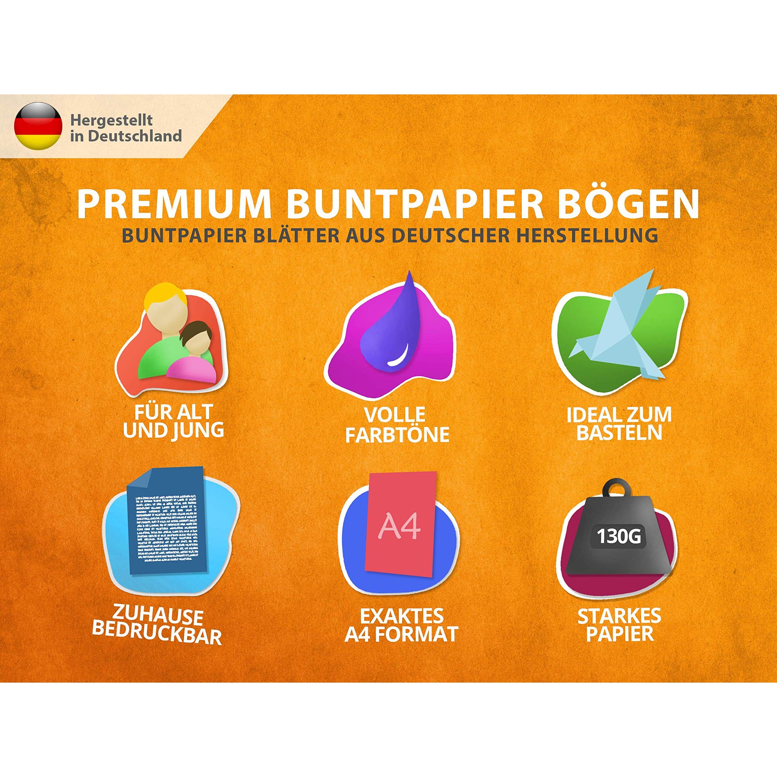 EXAKT GERADES PAPIER: Jeder einzelne DIN A4 Bogen, (210 x 297 mm) den du erhältst, wurde maschinell geschnitten, um ein exaktes Format zu gewährleisten. Das Papier ist durch die echte Grammatur von 130 g/m² Ideal zum Knicken oder Falzen für Karten, Figuren oder andere Kunstwerke geeignet. ZU HAUSE BEDRUCKBAR: Unser Papier ist ganz einfach in deinem Drucker bedruckbar. Sowohl bei einem Tintenstrahl, als auch bei dem Laserdrucker gibt es ein sehr schönes Druckbild. Bitte dafür die Papierart "KARTON" im Drucker auswählen. DAS SERVICE VERSPRECHEN: Wir von ELES VIDA sind zu 100 % von unserem Produkt überzeugt. Sollte dir unser Papier nicht zusagen oder du nicht zufrieden sein, erhältst du dein Geld zurück. SEHR GROssE FARBVIELFALT: Dank der 9 intensiven, unterschiedlichen Farbtöne, ist das Papier für alle möglichen Bastel- und Gestaltungsarbeiten verwendbar. Die Blätter sind komplett durchgefärbt. NACHHALTIGKEIT DER NATUR: Wir verwenden nur Papier, welches aus einem grossen Anteil an pflanzlichen Fasern zusammengesetzt und hergestellt wird, dadurch können wir eine perfekte Qualität und schöne Haptik gewährleisten, welches dir ein umso hochwertigeres Produkt garantiert. Das gesamte Papier wird hier in Deutschland hergestellt und unterliegt damit strengen Kontrollen.