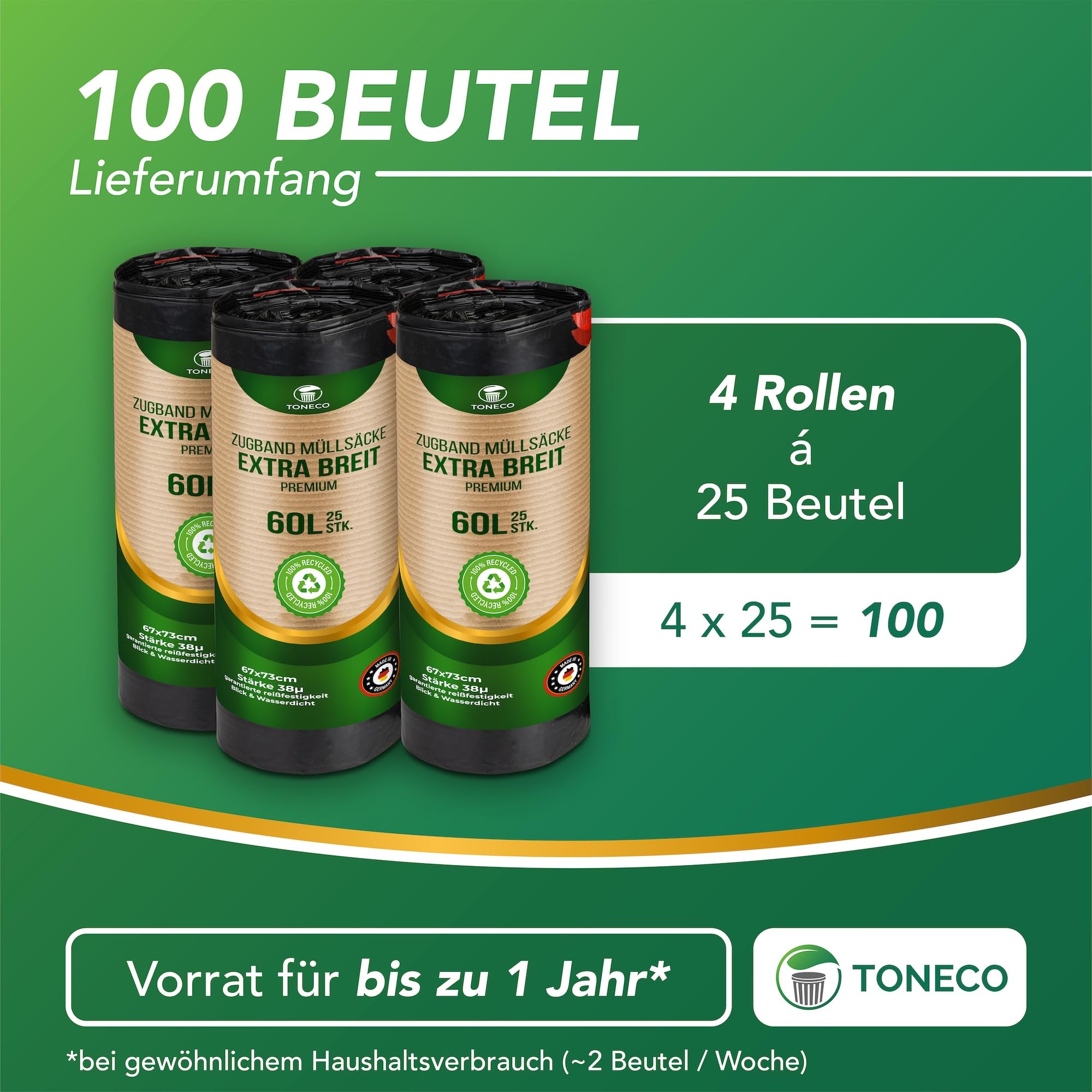 Toneco Müllbeutel 60L - MIT ZUGBAND - EXTRA BREIT & EXTRA STARK - 100 Beutel - reissfest & dicht - stabile Müllsäcke 60L - Fixierband Mülltüten -100% recycelt - für den Hausmüll - 4 Rollen à25 (100)