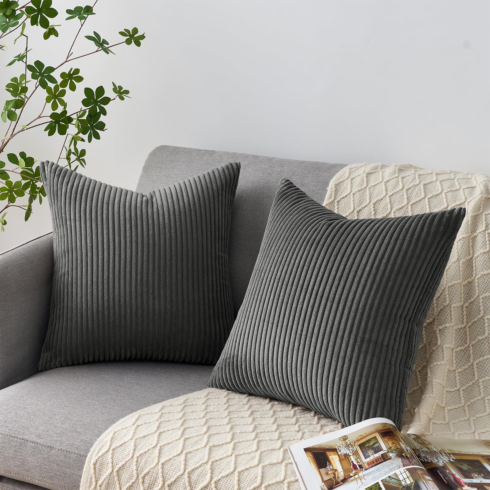 Topfinel Kissenbezug 45x45 4er Set Kord Kissenbezüge Kissenhülle Dekokissenbezug sofakissen Set dekokissen Kissen für Sofa Schlafzimmer deko Wohnzimmer Balkon Gestreift Dunkel Grau
