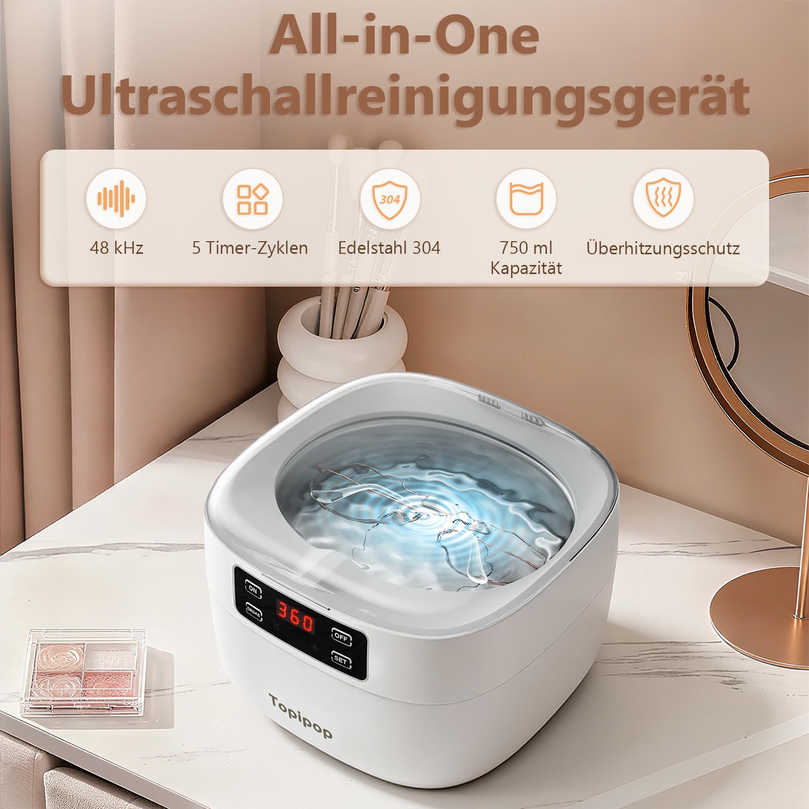 Topipop Ultraschallreinigungsgeraet 750 ml – 48 kHz Ultraschallreiniger mit 5 Modi | Ultrasonic Cleaner fuer Brillen, Schmuck, Uhren, Ringe & Rasierklingen (Weiss)