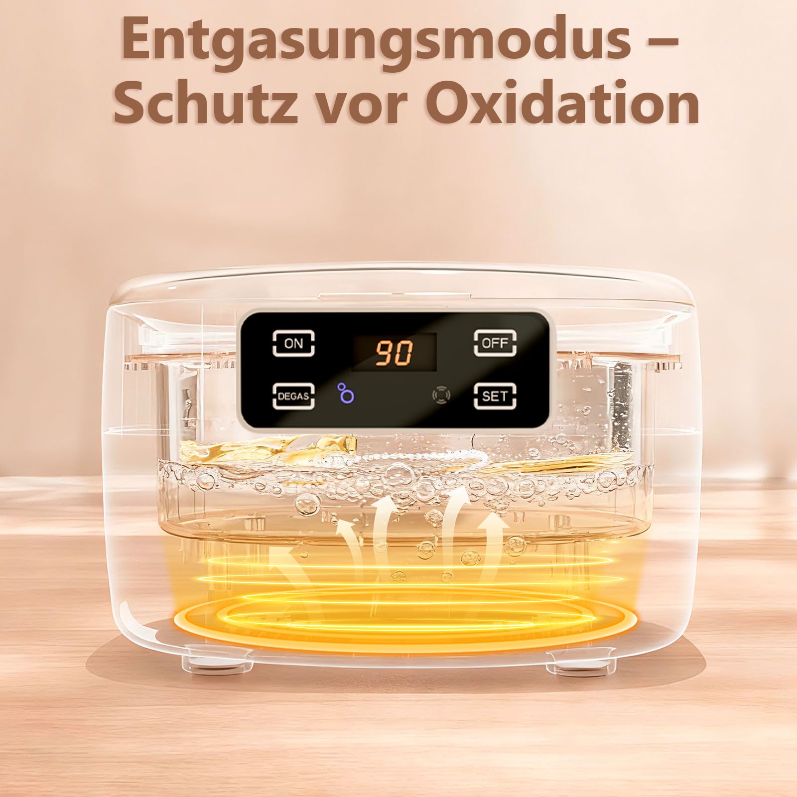 Die moderne Ultraschalltechnologie erzeugt mikroskopisch feine Vibrationen, die Verunreinigungen zuverlaessig loesen und die Materialien schonen. Der grosse 750 ml Tank bietet ausreichend Platz fuer mehrere Teile gleichzeitig, sodass Sie mit nur einer Anwendung mehrere Gegenstaende effizient reinigen koennen. Mit den 5 Reinigungsmodi laesst sich die Intensitaet je nach Material und Verschmutzungsgrad individuell anpassen.