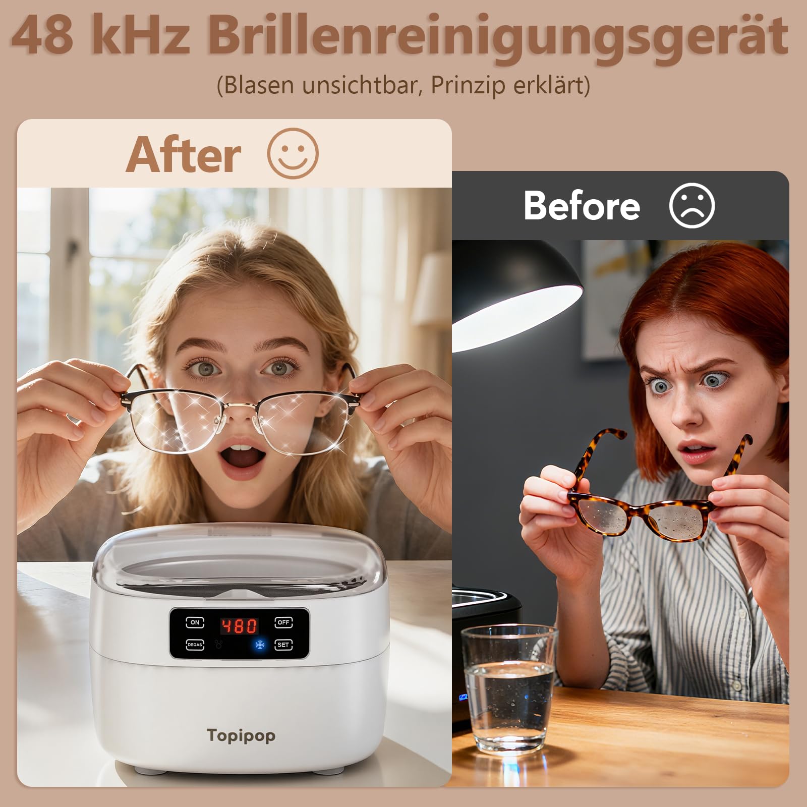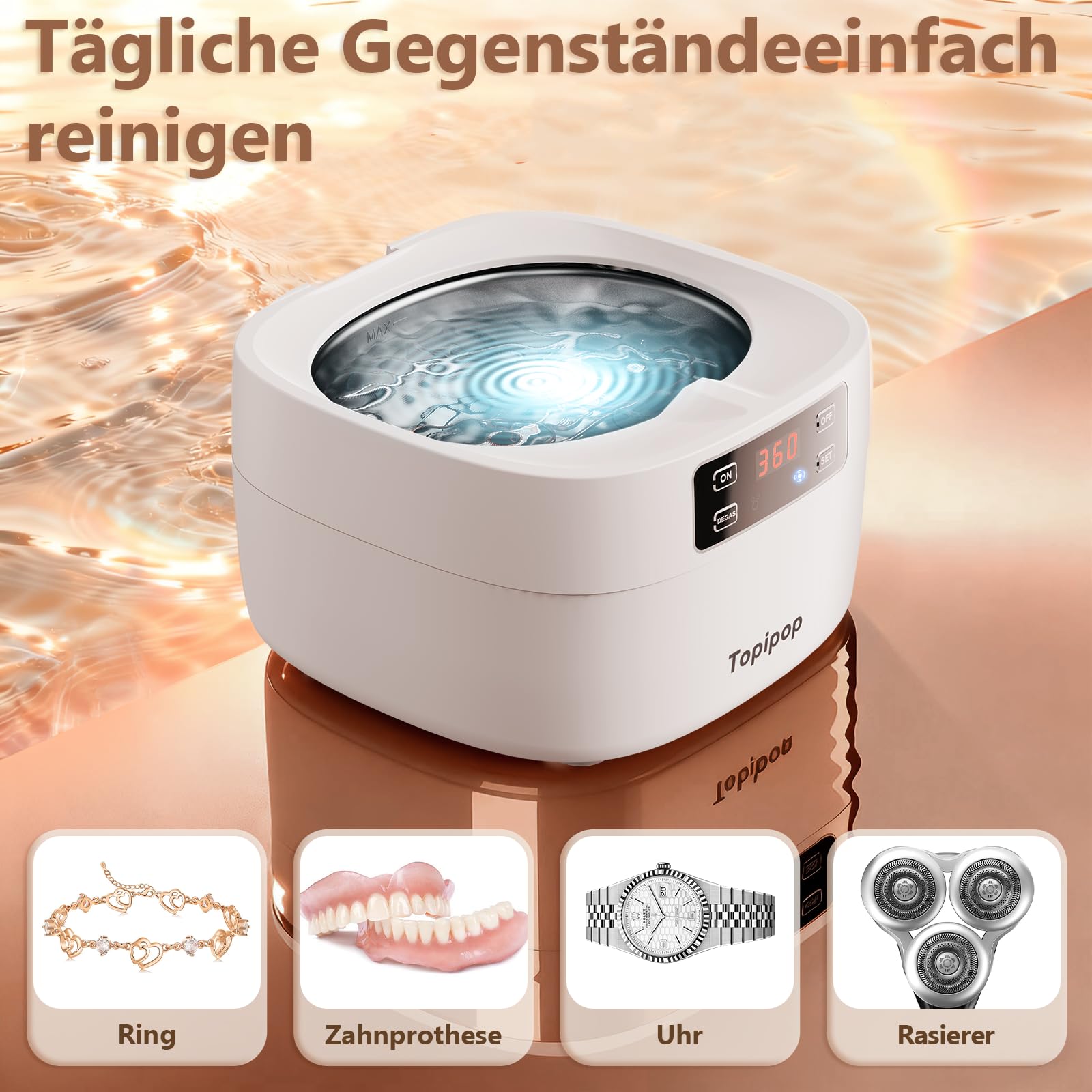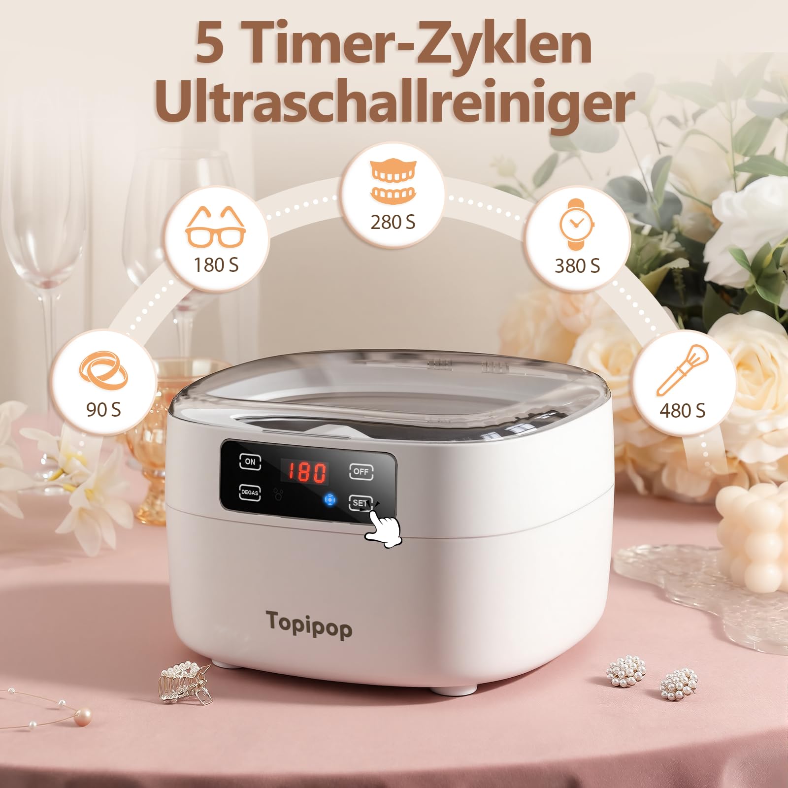 Das Topipop Ultraschallreinigungsgeraet 750 ml ist die ideale Wahl fuer alle, die eine zuverlaessige, effektive und schonende Reinigung fuer Brillen, Schmuck und andere empfindliche Gegenstaende suchen – leistungsstark, kompakt und alltagstauglich.