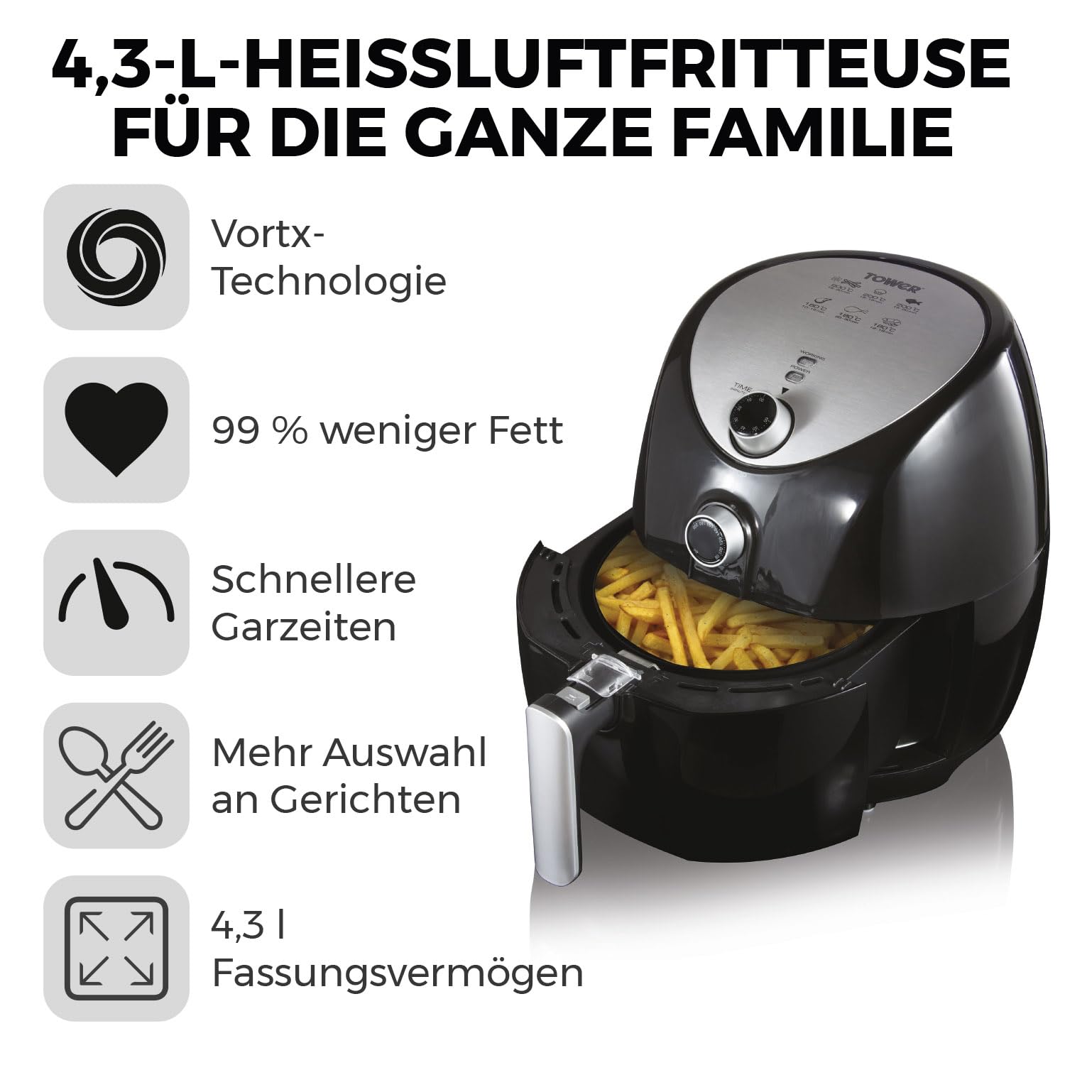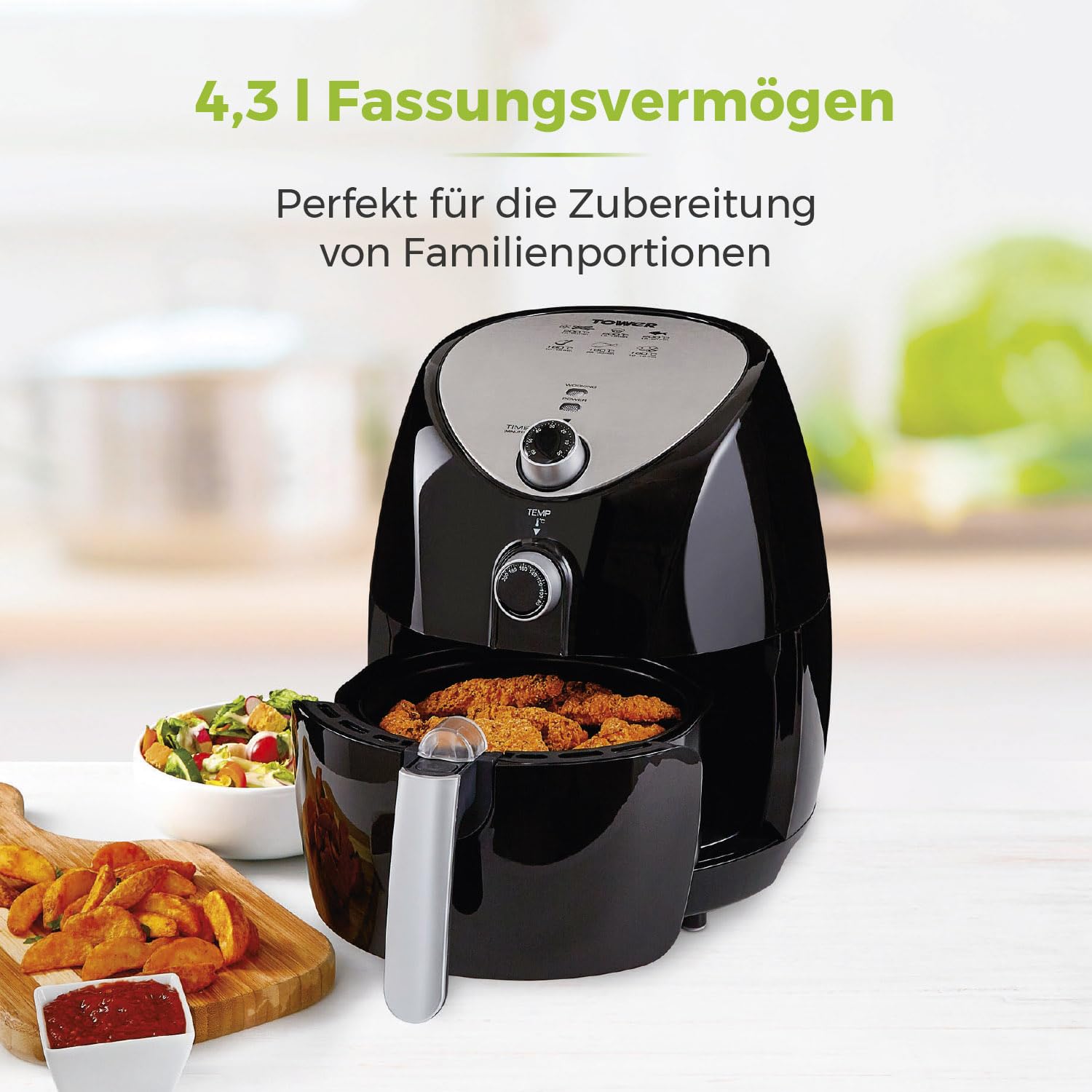 Tower T17021 Heissluftfritteuse für die Ganze Familie mit Schneller Luftzirkulation - 60-Minuten-Timer - Airfryer 4,3L 1500W - Schwarz