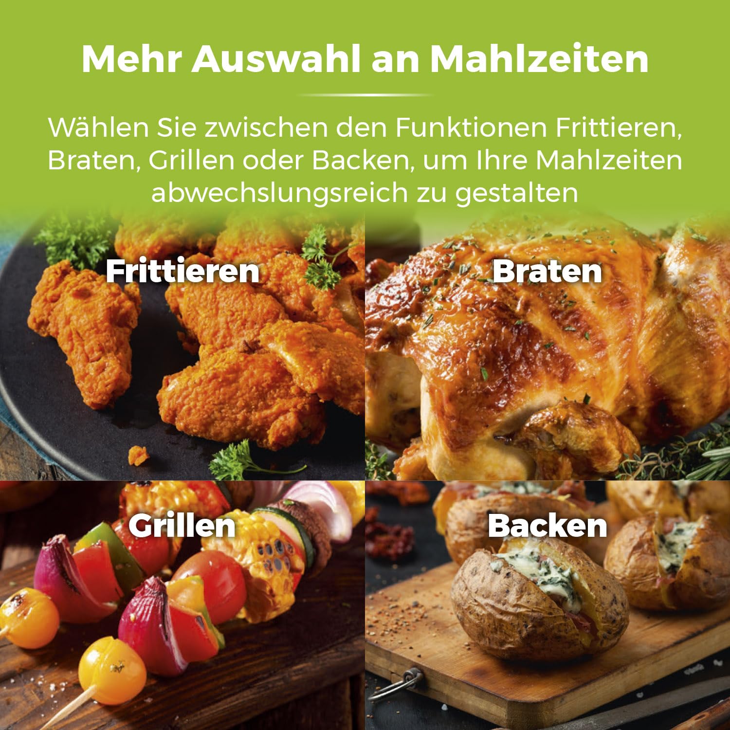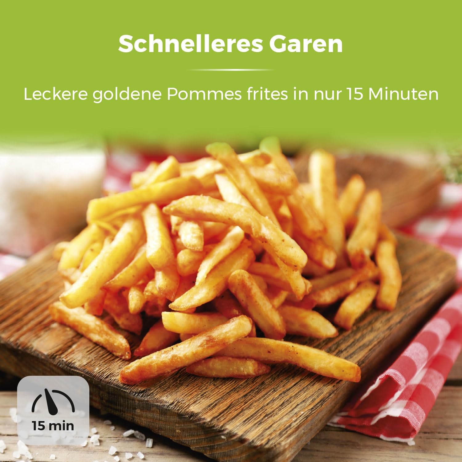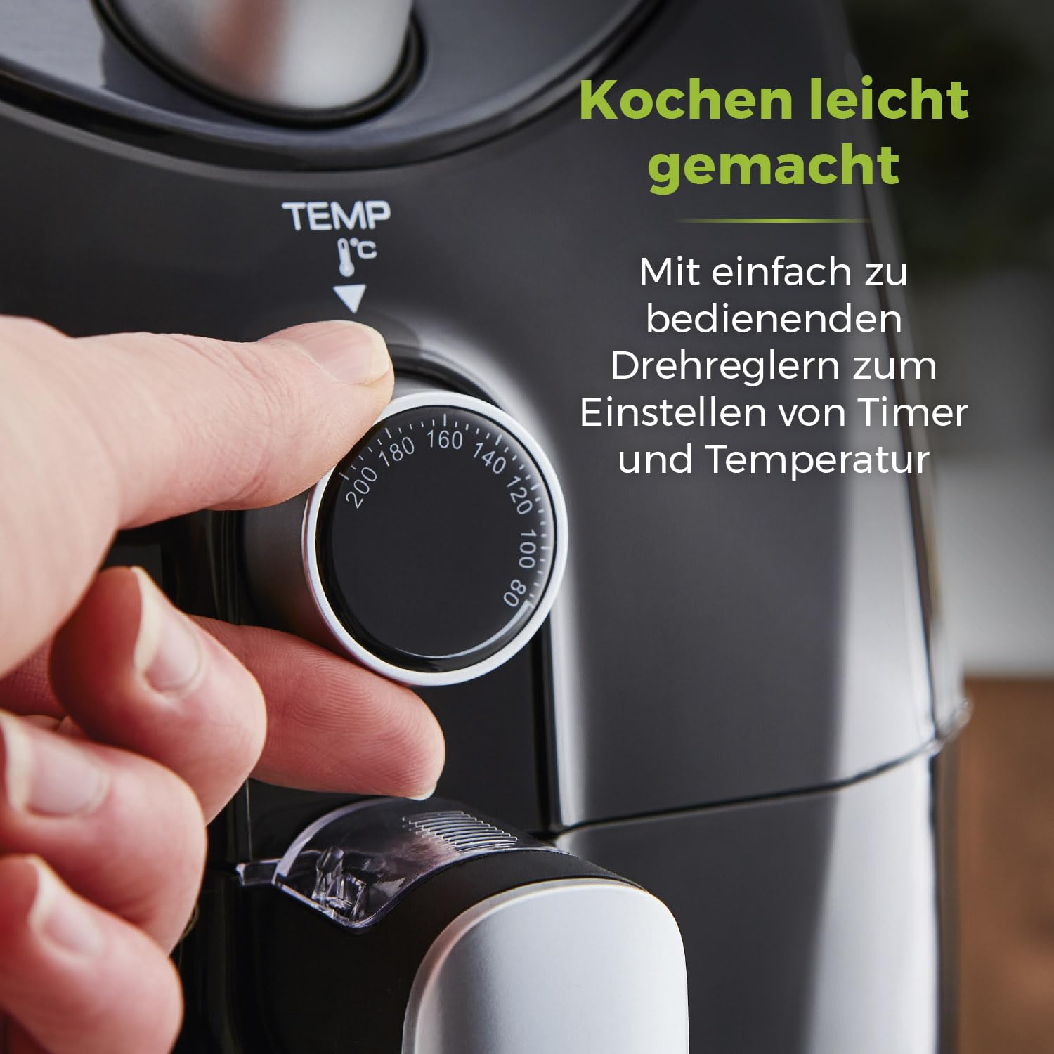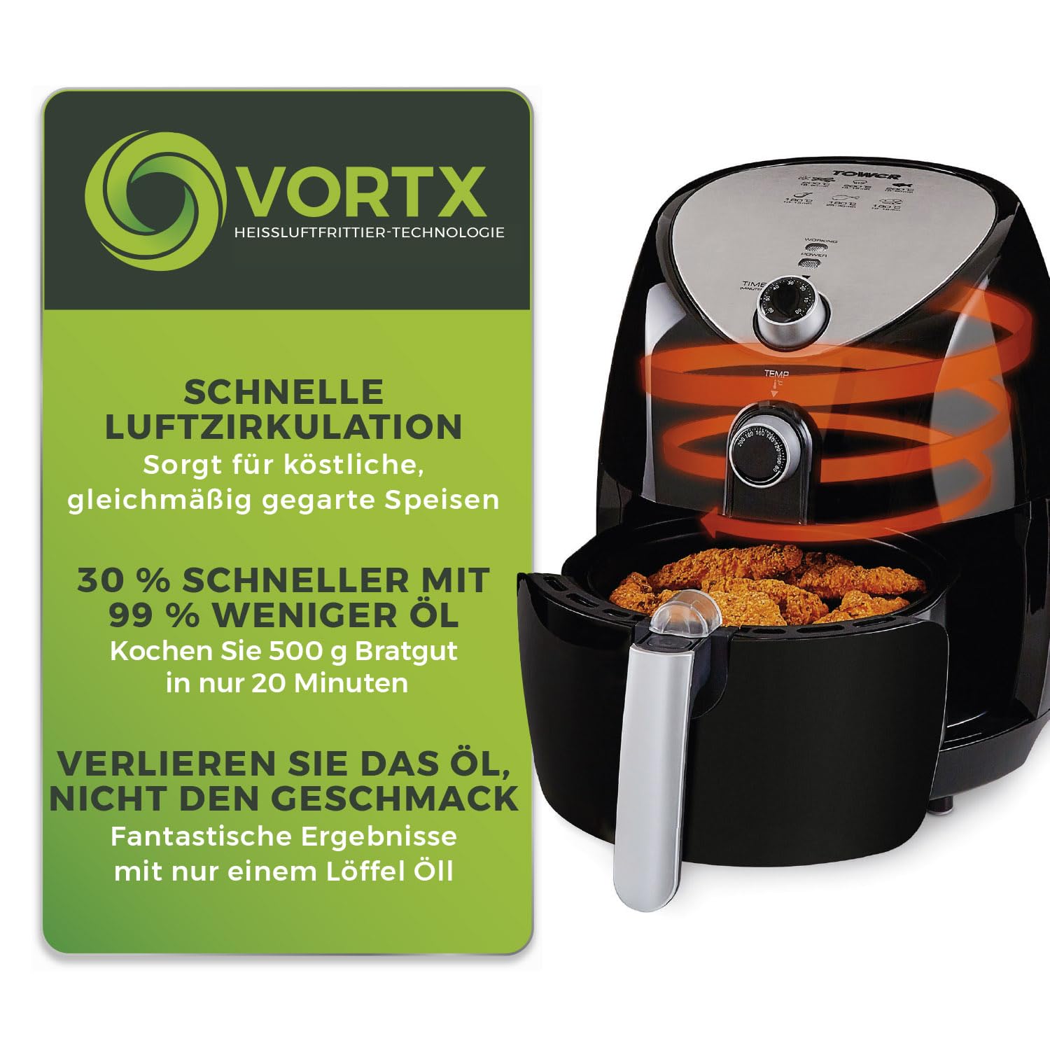 Heissluftfritteuse 4 Liter - Die 4,3-Liter Air-Fryer Heissluftfritteuse von Black Tower ist der perfekte Küchenbegleiter für alle, die eine schnelle und bequeme Alternative zur herkömmlichen Zubereitung von Mahlzeiten für die ganze Familie suchen. Dank der fortschrittlichen Vortx-Technologie benötigen Sie nur eine minimale Menge Öl. Die heisse Luft zirkuliert schnell und gleichmässig im Inneren der Airfryer Fritteuse und garantiert, dass Ihre Zutaten gründlich gegart werden und eine schöne knusprige Textur erhalten - und das alles mit 99 % weniger Fett - für eine gesündere Zubereitung.