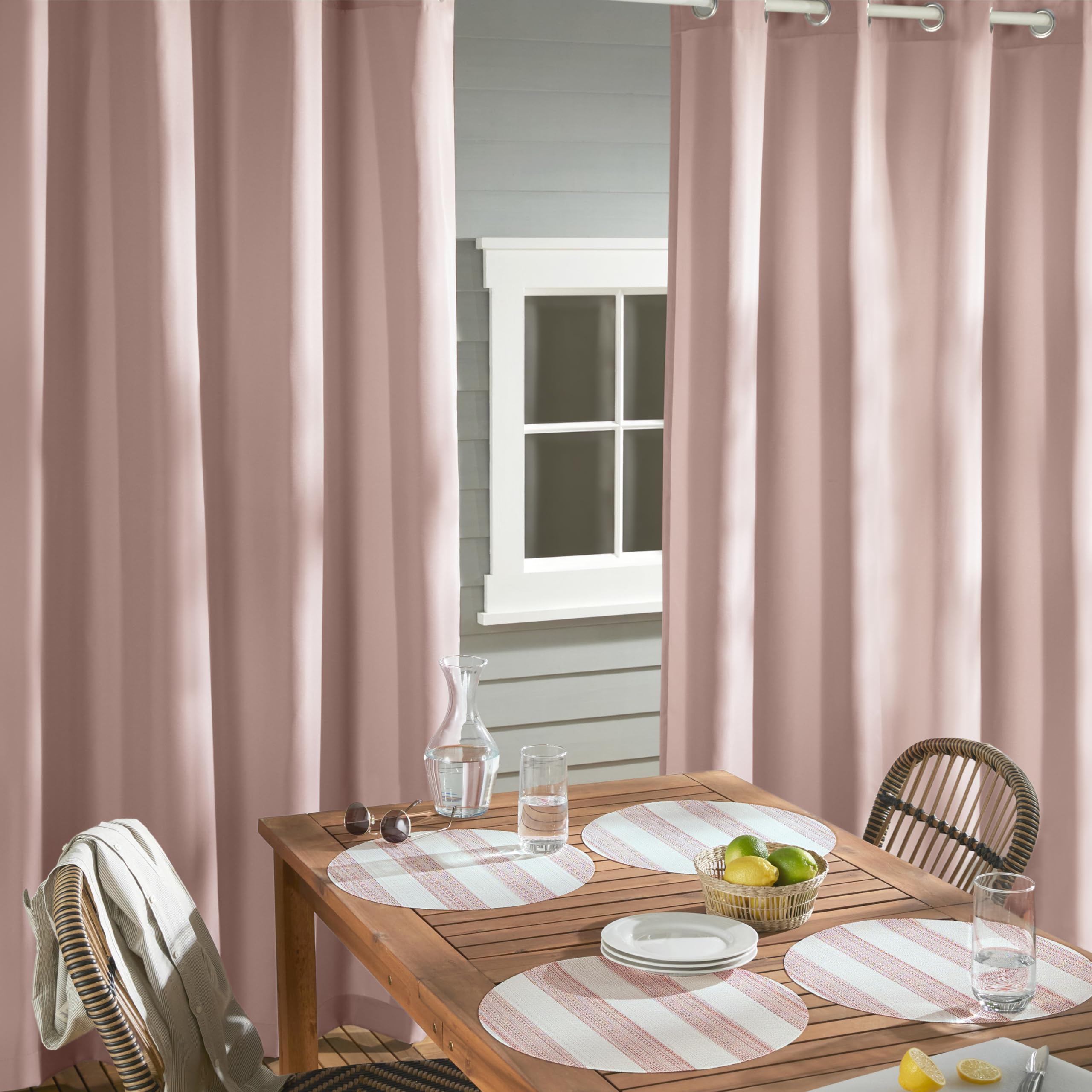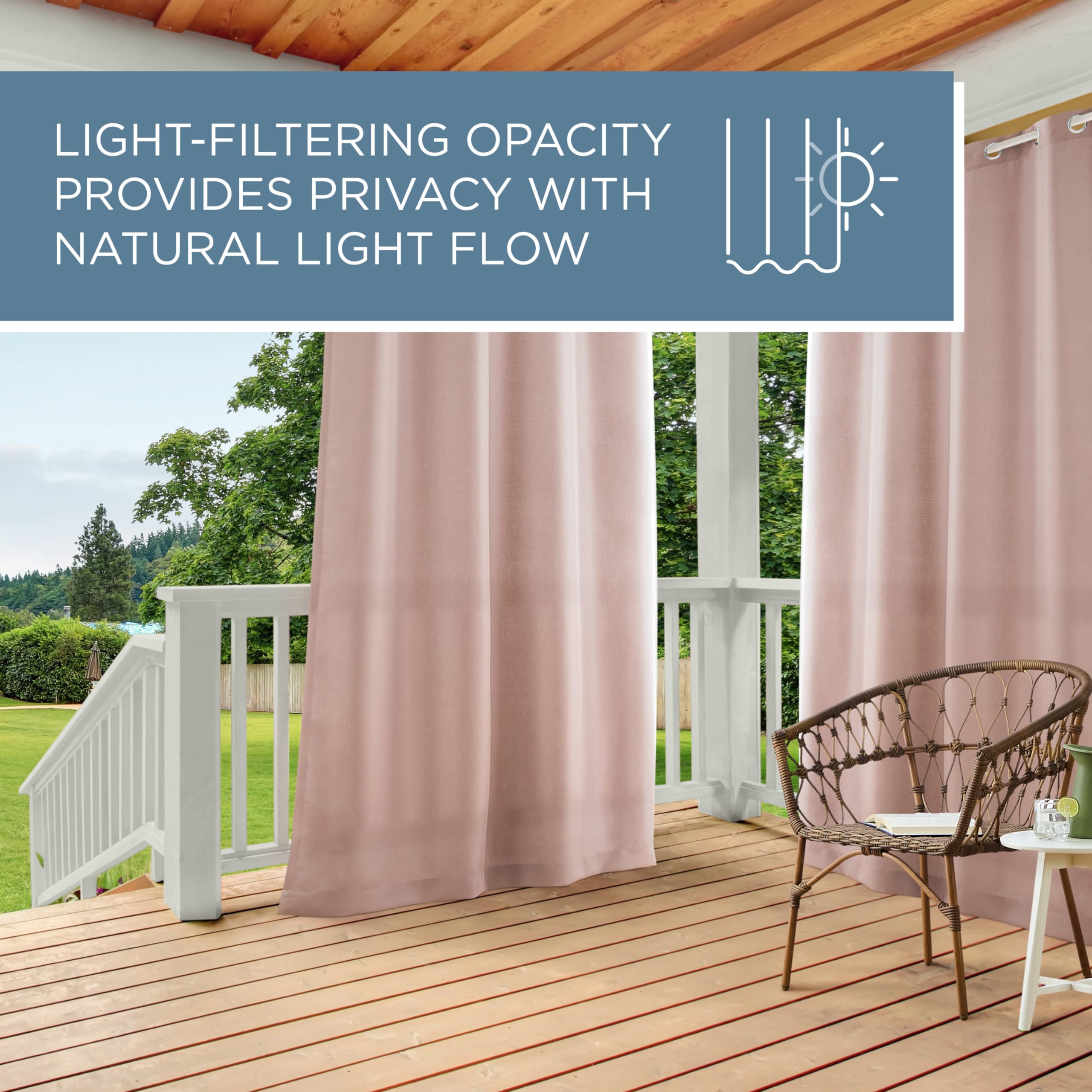 Die Cabana Vorhänge mit Lichtfilterung für drinnen und draussen sind die perfekte Ergänzung für jeden Raum. Stylen Sie diese schweren Vorhänge innen oder aussen für zusätzliche Privatsphäre, filtern Sie starkes Sonnenlicht heraus oder aktualisieren Sie einfach Ihre Innen- und Aussenräume. Dieses Vorhang-Set ist wasserabweisend und enthält acht (8) rostfreie Ösen, wodurch sie ideal für den Einsatz auf Ihrer Terrasse, Deck, Pergola, Cabana, Lanai oder Wintergarten. Diese strapazierfähigen Vorhänge passen auf jede Gardinenstange mit einem Durchmesser von bis zu 3,2 cm und können bei Bedarf leicht gereinigt werden.