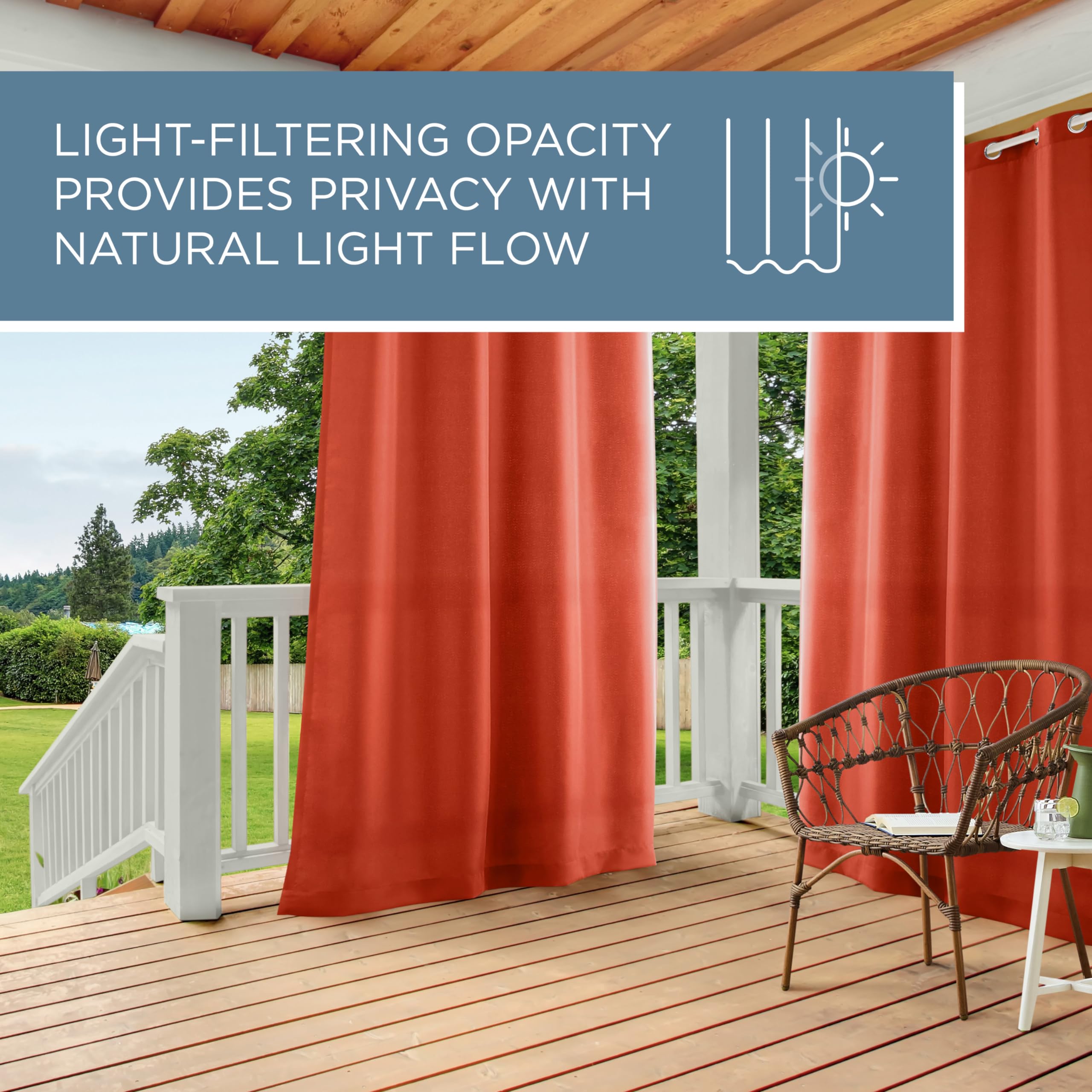 The Indoor/Outdoor Solid grommet top window curtain panels bring extra fashion and style to any outdoor living space. These polyester panels with a heavy duty canvas like feel drape beautifully and offer a UV Ray protectant and are mildew resistant. These beautiful panels are the ultimate finishing touch to any pergola, cabana, covered patio, gazebo, dock, beach home, or any outdoor extension of your home. The Indoor/Outdoor Solid drapery is constructed with gorgeous, matte silver, rust proof grommets and can be hung on your favorite curtain rod up to 1 5/8" diameter, adding yet another touch to the richness and luxury of your decor. These window curtain panels will drape beautifully from any window that could use that perfect, finishing touch. Our curtain panels are perfect for any living room, bedroom, family room, dining room, bathroom and office. Our stylish designs will suit any window space.